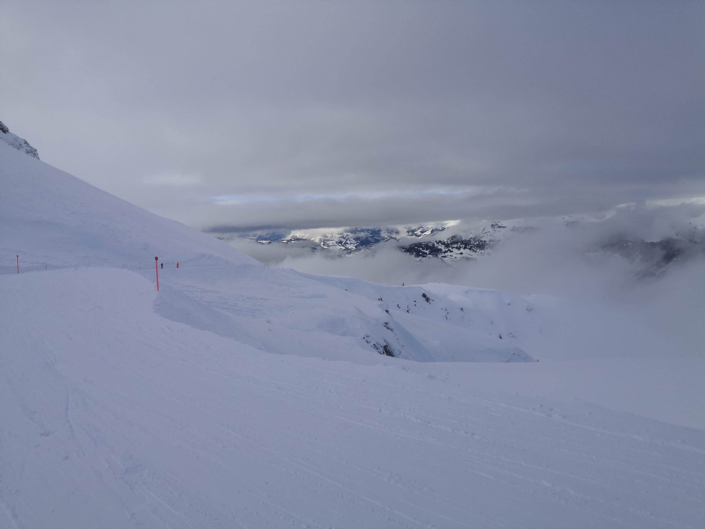 Nachdem es in den Abendstunden des Vortages geregnet hat, schneite es heute morgen wieder, wenn auch ziemlich nass. Nach einer weiteren Runde mit der Fräse blieb nachmittags noch kurz Zeit für einen Ausflug ans Jakobshorn. Gerade rechtzeitig für das zweite sonnige Fenster des nachmittags. Wenige Minuten später war es dann wieder vorbei mit Aufhellungen und es setzte erneut starker Schneefall ein.