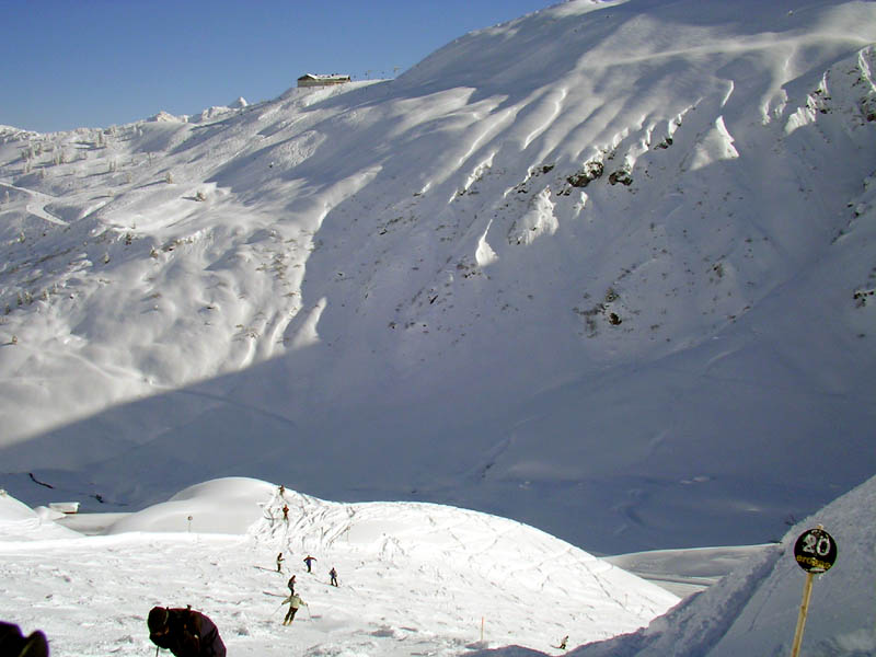 Betreibsschluss bei vielen Bahnen um 15.45, Bella Nova, Tal"ab"fahrt zur Valiserabahn, dösige Anstellbereiche ohne Singlespur