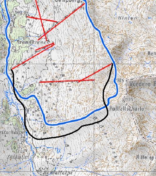 Im Anschluss an diese ersten Orientierungsversuche gings dann zur Variante Rossfallalpe, die einen zunächst kleinen Aufstieg von ca. 10 min zur Voraussetzung hatte (rot = Abfahrt, pink = Aufstieg):
