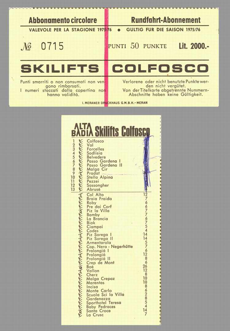 Punktekarte "Skilifts Colfosco" aus der Saison 1975/76.
