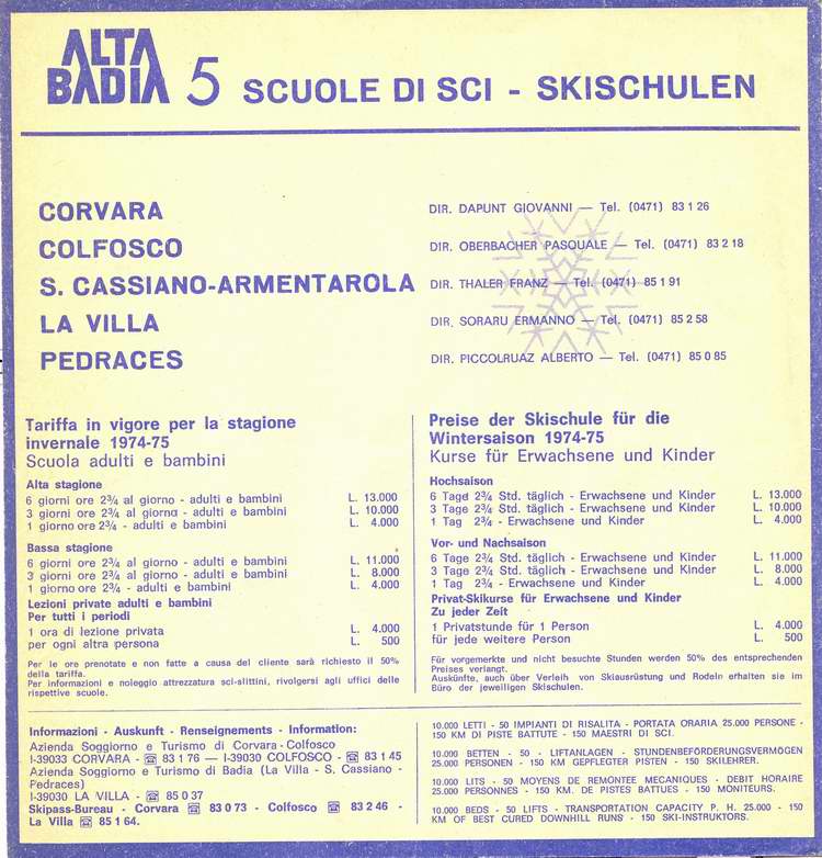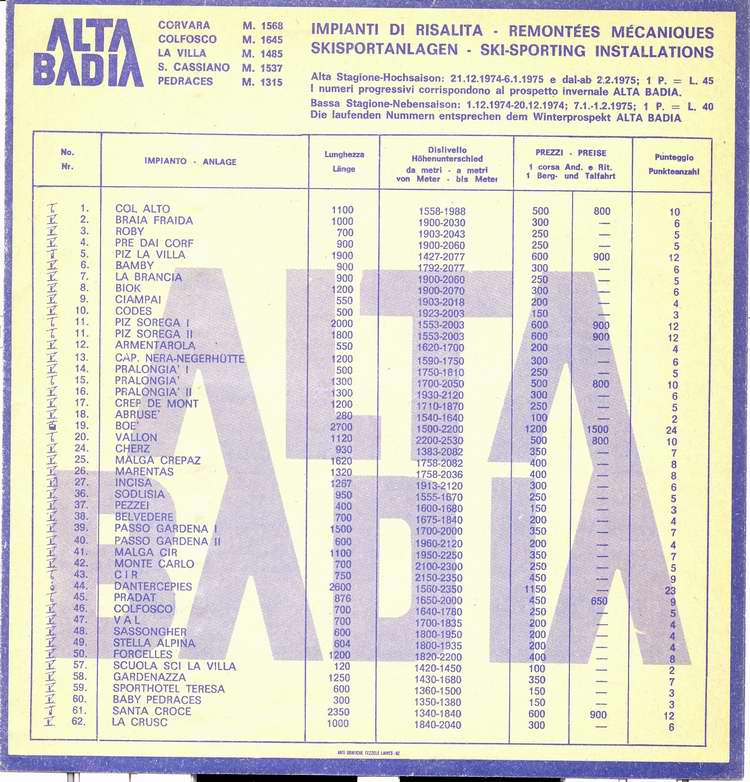 Preisliste "ALTA BADIA" und "DOLOMITI SUPERSKI" aus der Saison 1974/75. Man beachte die Preise und vergleiche die Preisentwicklung bis heute. Honni soit qui mal y pense...