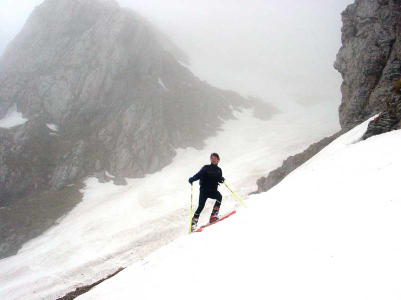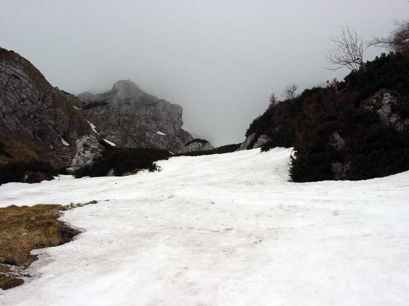 Ab Ausstieg Fadensteig relativ dichter Nebel, sodaß wir ein wenig suchen mußten um den Einstieg in die Lahningries zu finden. Die oftmals durch eine hohe Wächte gekennzeichnete Einfahrt zeigte sich heute von ihrer "gutmütigen" Seite, Höhe max. 1m.