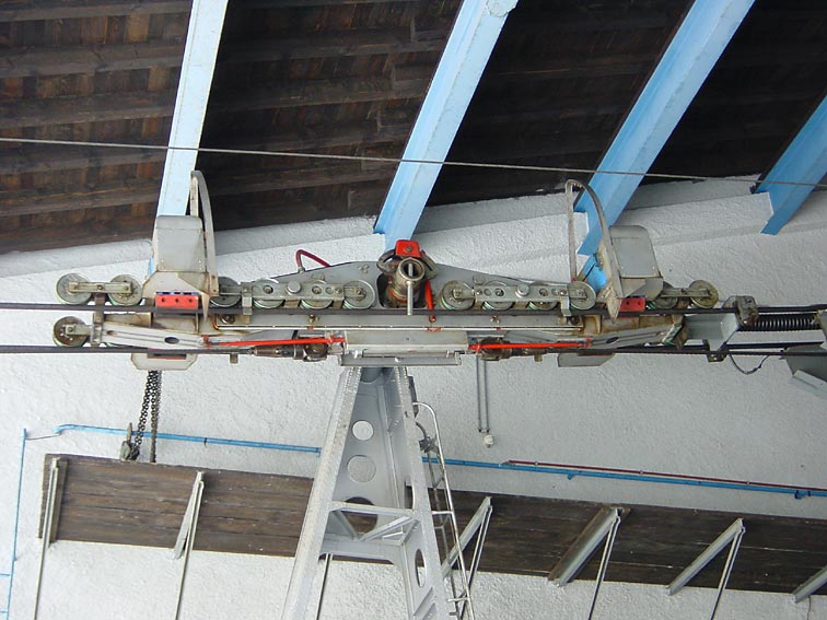 Du meinst bestimmt die Sektion zwischen Gerschnialp und Trübsee. Hier konnte Garaventa aber das sonst übliche Laufwerk nicht einsetzen, da diese VonRoll-Anlage aus den 60er Jahren noch eine Seilspur von nur 550 mm hat, das Garaventa-Laufwerk hingegen ein Maß von 700 mm. Man mußte hier ein komplett anderes Laufwerk konstruieren, da die Garaventa-Tragseilbremse mit quer liegenden Federpaketen bei dieser kleinen Spur räumlich nicht unterzubringen war. Das Problem war für Garaventa aber nicht neu, siehe Corvatsch, Jakobshorn, Pilatus...