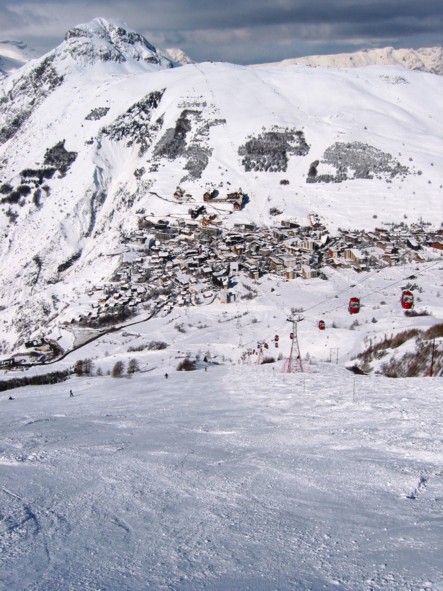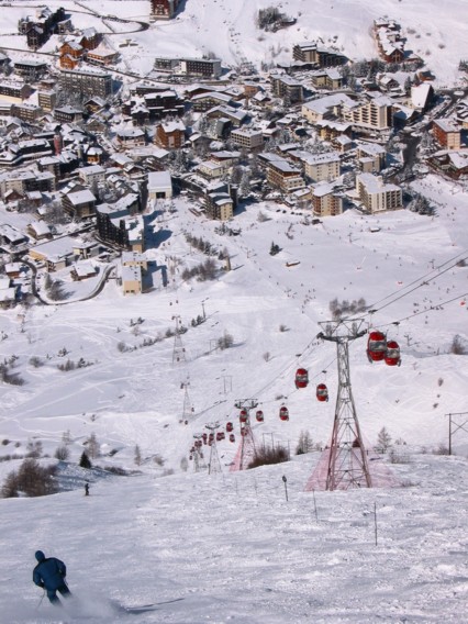 Das Herzstück des Skigebietes ragt in einem 550 bis 800 m hohen Steilaufschwung direkt aus dem Hochtal auf. Wenn des öfteren kritisiert wird, dass L2A nur parallele Hänge aufweisen würde, dann bezieht sich diese Kritik wohl auf diesen Sektor, der in erster Linie den Zugang zum Höhenskigebiet bietet, aber in früheren schneereicheren Jahrzehnten das Hauptskigebiet dargestellt hat, was sich bei den exzellenten Verhältnissen dieses Jahres leicht erklärt hat. Wie gegenüber am Pied Moutet dominieren hier – teilweise sehr steile – Almwiesenhänge, seit den 1970er Jahren hat man jedoch einiges an Bäumen angepflanzt, hauptsächlich wohl aus Lawinenschutzgründen für die stark gewachsene Station, möglicherweise aber auch um bei schlechter Sicht den Kontrast zu verstärken, die Windverfrachtung des Schnees zu behindern etc. Anstehendes Felsgestein gibt es hier praktisch nicht, weshalb bei guter Schneelage eigentlich jeder m² des riesigen Bereichs befahren werden kann. Von Norden nach Süden wölbt sich der Aufschwung zu einem flachen Rücken, zwischen den Stationen Crêtes (2100 m) und Diable (2400 m) liegen gut 300 Hm, die breite Easy-going und Anfänger-Reviere beherbergen. Das eigentliche Anfänger-Revier befindet sich jedoch direkt am Ort unten, auf den ersten, flacheren 100-200 Hm verteilt sich eine Unzahl an Schleppliften, eine DSB Alpette gibt es auch, alle Hänge hier komplett beschneit. Der eigentliche Hang ist massiv steil, weshalb es keine leichte Talabfahrt gibt, dafür dient der 5 km lange Ziehweg „Chemin des Desmoiselles“. Beschneit und gewalzt wird die schwarze Talabfahrt „Combe Valentin“, eine der besten mir bekannten Talabfahrten, gewalzt wird im Süden auch die schwarze „Diable“-Abfahrt, die jedoch bedauerlicherweise nicht beschneit wird. Schade deshalb, weil der große Diable-Hang mit seinen praktisch immer steilen 800 Hm und seiner beachtlichen Breite Skiterrain vom Feinsten darstellt. Dazwischen gibt es neben viel freiem Skiraum noch die Buckel-/Tiefschneetalabfahrten „Y“ und „Sapins“, sowie ganz im Süden eine Variante, die auf der ehemaligen Vallons-Abfahrt am Diable beruht.