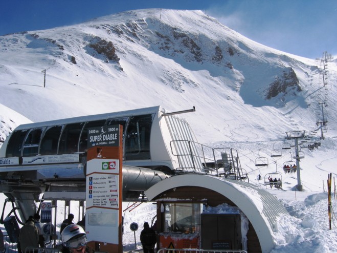 In direkter Fortsetzung der Diable-4-EUB führt die 4-SB Super Diable bis kurz unterhalb des Tête Moute, eines Vorgipfel des Diable. Sie stellt via Ziehweg einerseits die Verbindung zur Mittelstation Toura und zum Gletscher her, andererseits bedient sie die wunderschöne, gewalzte schwarze Abfahrt „Super Diable“, so dass man von ihrer Bergstation 1140 Hm am Stück schwarz in den Ort abfahren kann. Exposition hier: Nordwest.