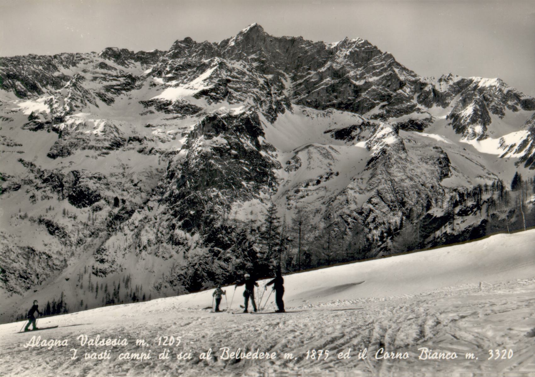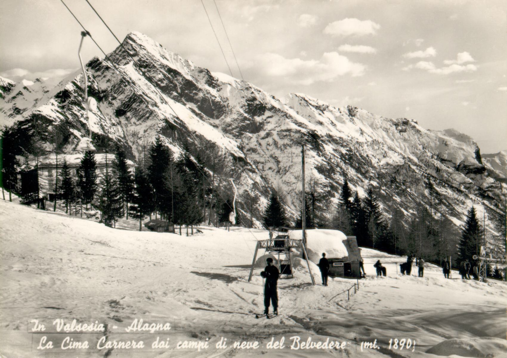 Weil die "gute alte Zeit" des Skigebiets Belvedere schon so weit zurückliegt, gibt es nur noch wenige Bilddokumentationen von Seilbahnanlagen und Skibetrieb, und es braucht eine Portion Glück, sie aufzutreiben. Für die wenigen an historischen Wintersport-Dokumentationen Interessierten steht hier mit "Saluti da Alagna" eine Zusammenstellung von Ansichtskarten aus dem Alagna Valsesia um 1960 zur Verfügung, die - in Ergänzung zu den bisherigen Berichten - Impressionen vom Belvedere-Gebiet in Betrieb liefert. Im Stil der damaligen Ansichtskartenfotografie handelt es sich vorwiegend um Schwarzweißansichten. Winter- und Sommeransichten sind vermischt. Per Mausklick auf Landkarten-, Pistenplan- oder Ansichtskarten-Scan erhält man das großformatige Bild in 1700x1200 Pixeln.