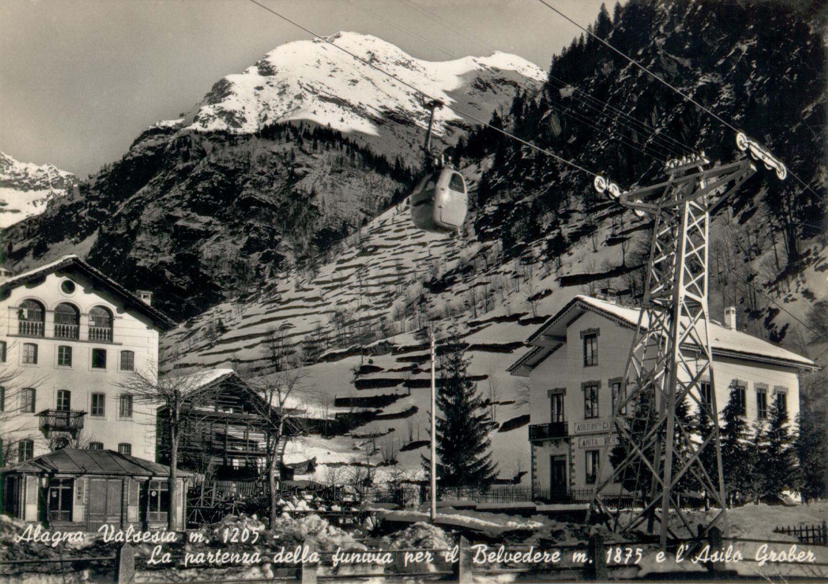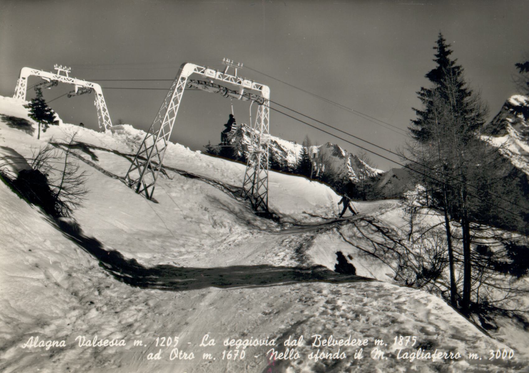 Alagna - Winterliches Panorama der 1960er Jahre. Die EUB Belvedere fährt links den Hang hinauf. Wer lange sucht, findet auf dem Kartenscan eine einzige Stütze.