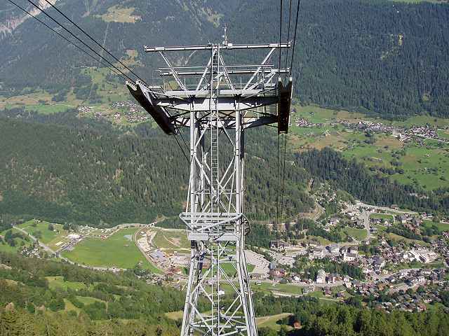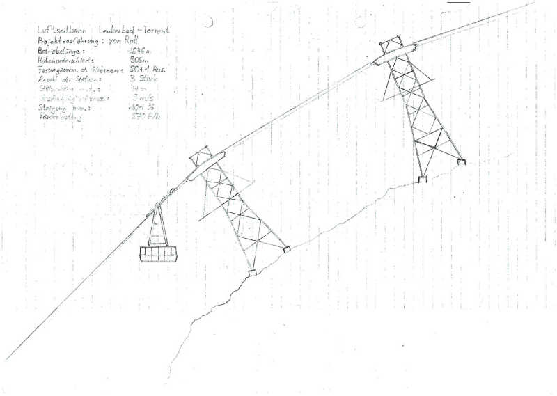 Grösster Nachteil solche einer Zwillingsanordnung ist der viel Grössere Spannwag der Seile. Vor allem auf der Stütze. Kleine Spannfelder und dann wieder Grosse, sorgen dafür, dass sich das Tragseil mehr verschieben muss. Braucht mehr Fett auf den Sätteln und tieffere Spannschächte. Hätte man die Schildhornbahn mit einer Grossen Habeggerstütze in der Mitte Konstruiert und damit nur 2 Spannfelder nötig gewesen währen, währe der Spannschacht nicht so tief. Aber auch eine seltenere Anordnung. Neben Torrent fällt mir jetzt keine ein die von Von Roll ist und solche Stützenanordungen besitzt. Ausser vielleicht Staldenried-Gspon. Noch ein Paar Beispeiel. Das erste mal auch eine Stütze der Maschinenfabrik Bell sowie Küpfer.