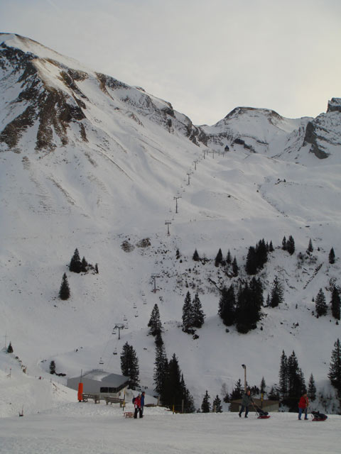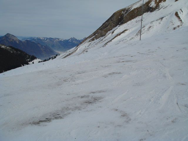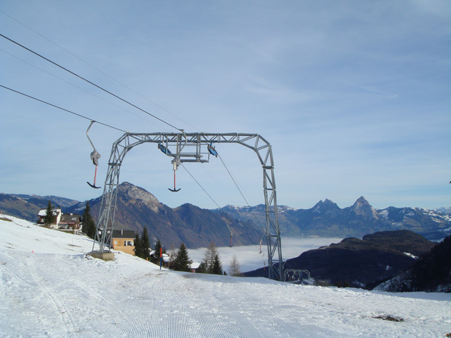 Da ich schon lange mal Fotos von der alten Müllergondelbahn in Emmetten machen wollte, war es naheliegend, ins Skigebiet Klewenalp-Stockhütte zu fahren. In Emmetten angekommen machte ich erst ein paar Fotos. Dann fuhren wir mit der Gondelbahn, welche leider nächsten Sommer ersetzt wird, hinauf nach Stockhütte. Der alte Skilift Herti war leider nicht in Betrieb. Nach ein paar Fahrten auf der eisigen am Skilift Twäregg wechselten wir auf die Klewenalp. Dort fanden wir ganz passable Verhältnisse vor. Allerdings sind dort die Pisten äusssert kurz und man ist nach ein paar Schwüngen schon unten. Deshalb fuhren wir auf dem langen Ziehweg um den Klewenstock herum zur Talstation der Chälen-Sesselbahn. Was wir vom Sessel aus sahen, machte einen vielversprechenden Eindruck. Doch auf der Piste änderte sich diese Ansicht schnell. Der gesammte Schnee war mit Kies durchsetzt, weiter unten fehlte der Schnee schon ganz.
