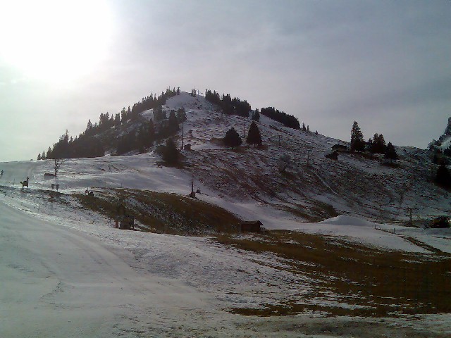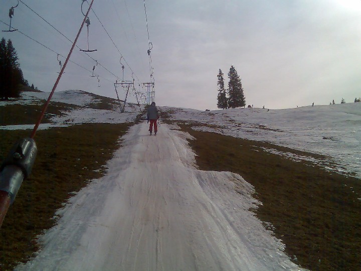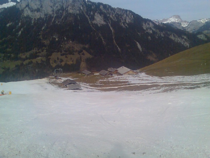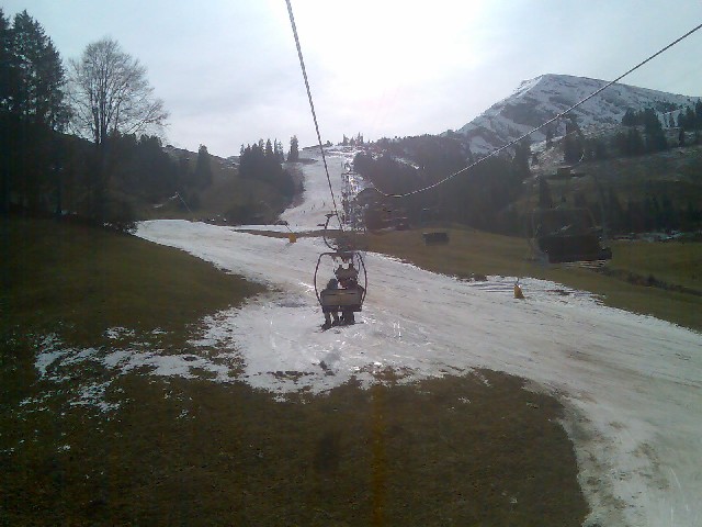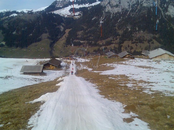 Wie man auf den Bildern sieht, ist die Schneelage sehr prekär. ausser den beschneiten Pisten, sieht man nur grüne Wiesen.