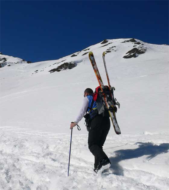 Es zeigte sich, daß der lohnenste Hang nur durch einen Aufstieg von vielleicht knapp 100 Meter erreichbar war, leider hatten wir an diesem Tag die Felle nicht im Rucksack und so machten sich helmut (gletscherfloh), Sabine und meine Wenigkeit per pedes auf den Weg, Chasseral, noch etwas rekonvaleszent nach seiner Verkühlung, zog es vor, in der Sonne auf uns zu warten, Snowotz, seines Zeichens eher Pistentiger, beschloß, die steile Talabfahrt nach Zinal zu besichtigen.