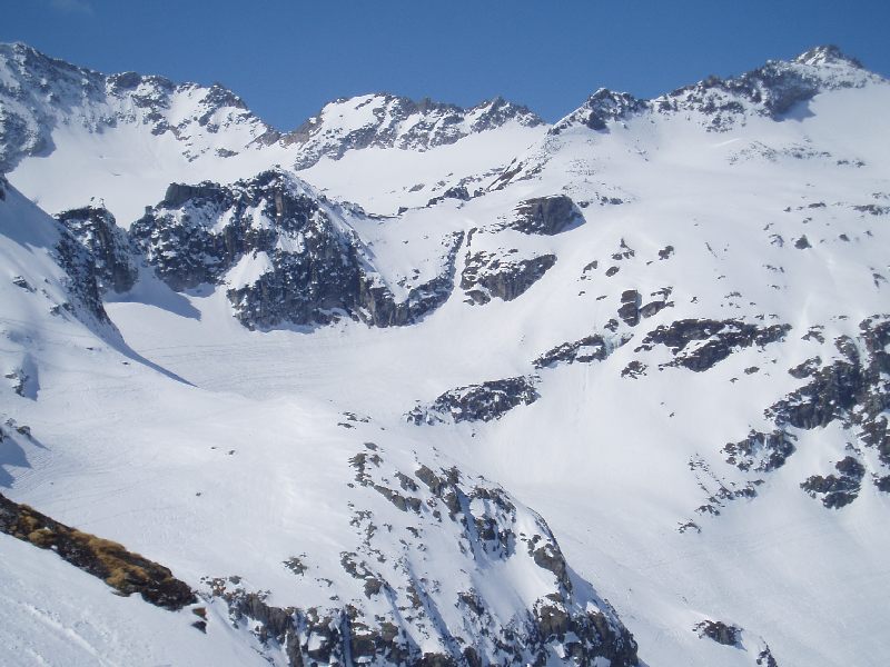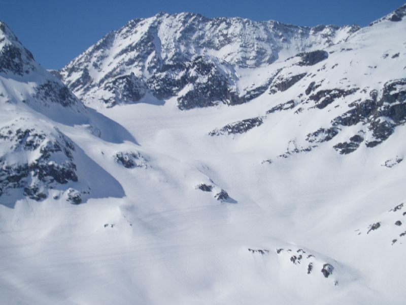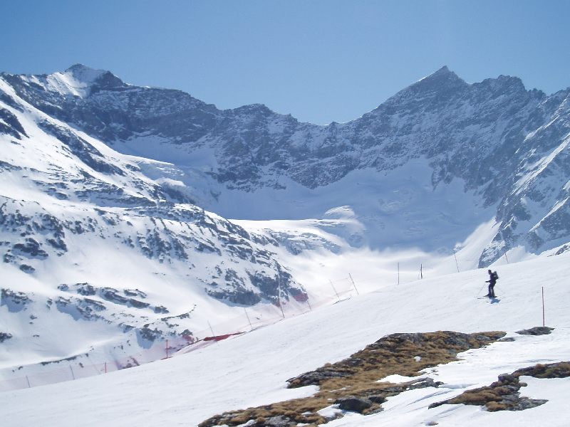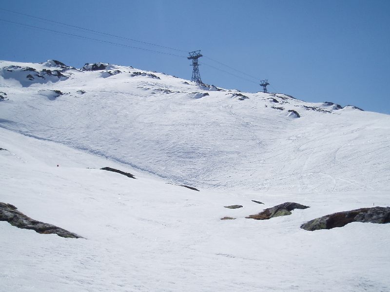 Nur an paar Stellen im obersten Teil der DSB sind links und rechts der Trasse sind noch einzelne Gletschereste übriggeblieben. Zum Bespiel bei der Skiroute Nr. 2 gehts noch ein paar wenige Meter über Eis. Siehe Karte, die ich am Ende des Bereichts angehängt habe.