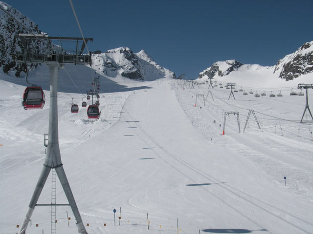 ^^Ein Blick aus der Gondel auf den Talschluss¸ und den Ort Kurzras. Auf der gegenüberliegenden Talseite die DSB Lazuaun. Hier hat man, mit genug Kunstschnee, die beiden Abfahrten aufrecht erhalten können. Und ein paar Leute sind hier sogar noch gefahren.