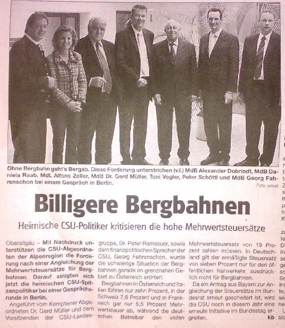 Quelle: PNP, 23.6.06.München. In Berlin haben CSU und SPD die Erhöhung der Mehrwertsteuer beschlossen - in Bayern wollen sie zumindest die Bergbahnen davor bewahren. Im Haushaltsausschuss des Landtags sprachen sich die beiden Parteien gestern dafür aus, den Berg- und Seilbahnen den ermäßigten Mehrwertsteuersatz von sieben Prozent einzuräumen, der auch für andere Nahverkehrsmittel gilt. Die bayerischen Bergbahnen seien sonst im Wettbewerb mit den benachbarten Alpenländern zu stark benachteiligt, sagt CSU-Haushaltsexperte Engelbert Kupka.