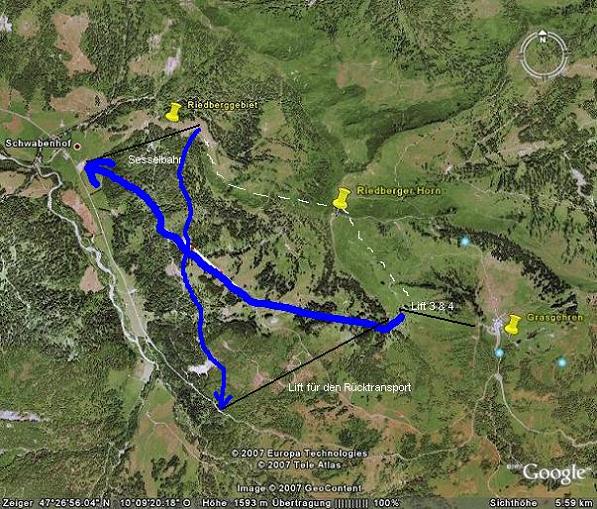Hier kurz eine Karte zur Verbindung der beiden Skigebiete. Wenn man an den Grasgehrenliften 3 und 4 nach links aussteigt und quer zum Hang weiterfährt, landet man irgendwann beim Riedberggebiet. Laut Google Earth beträgt die Entfernung etwa 3,2 km bei 500Hm.