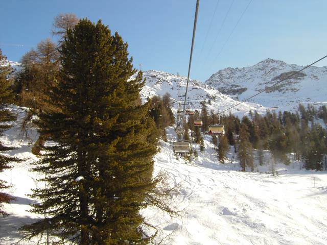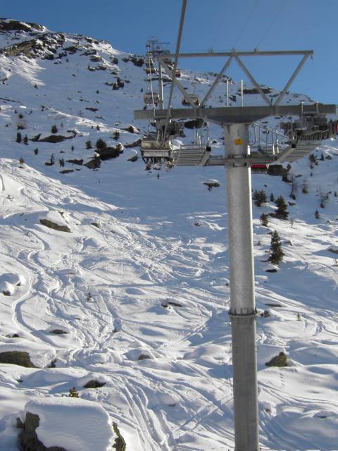 Rechts: Schwarze Piste Muntanella, die an diesem Tage noch geschlossen war. Am folgenden Freitag öffnete sie dann aber. Besonders "schwarz" ist die Piste aber nicht ;) Links: 4KSB Furtschellas "von Von Roll" ;)