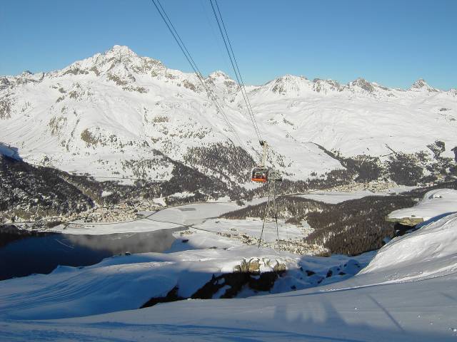 Wunderschöne Aussicht nach Silvaplana (von dem oberen Teil der Corvatsch Talfahrt aus). Weiterhin im Bild: Die noch ziemlich neue Pendelbahn Surlej-Murtèl.