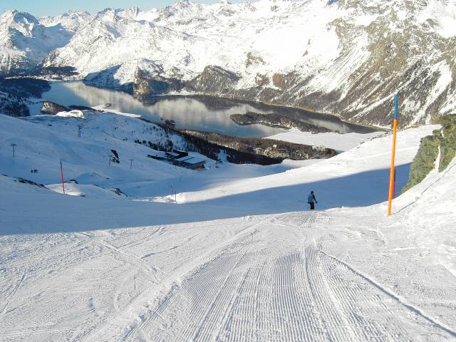 Die rote Piste Surlej (Talabfahrt Corvatsch) wird integral beschneit und fährt sich prima.