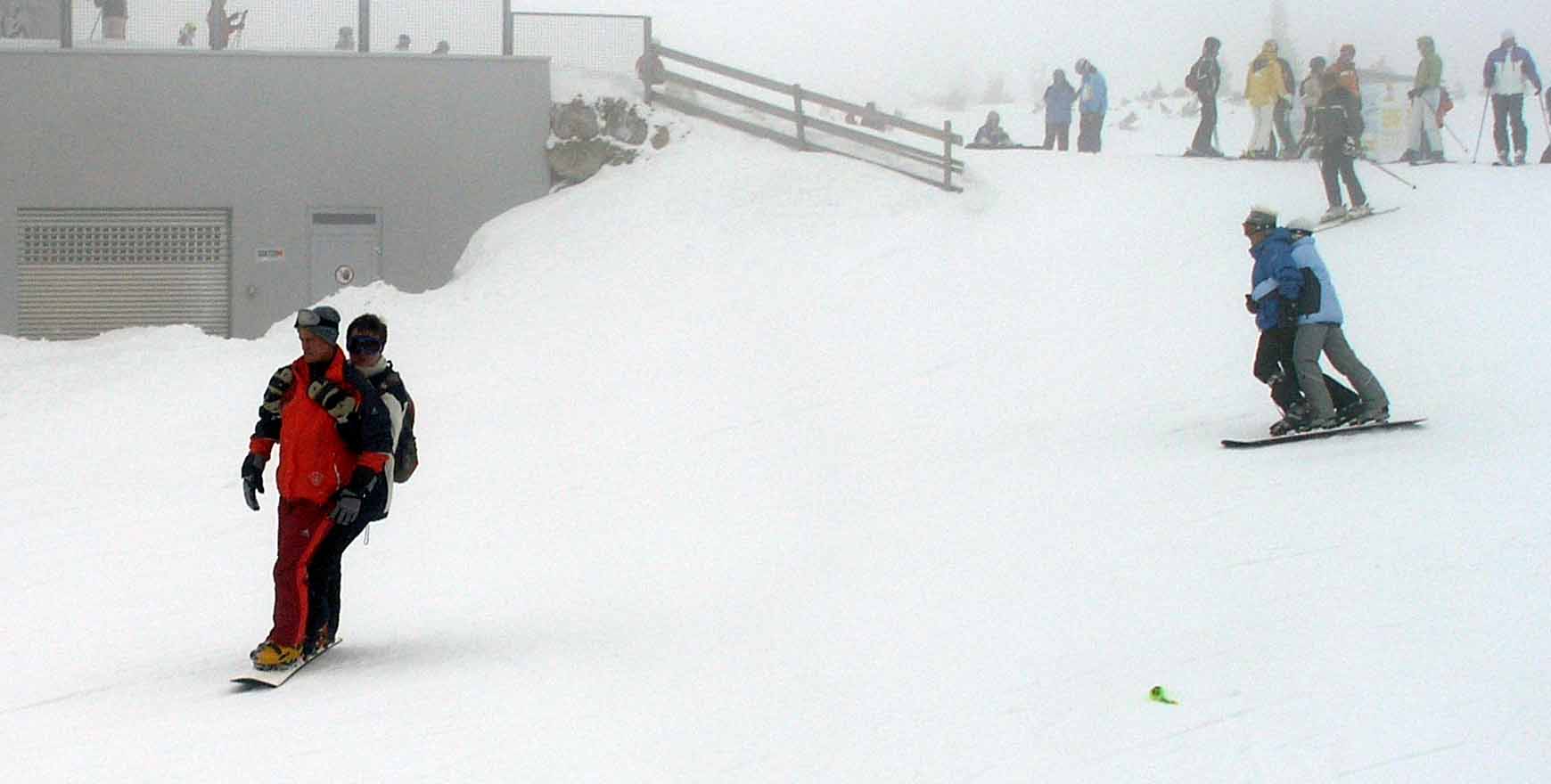 Heute habe ich zum erstenmal zwei Fahrer auf einem Snowboard gesehen. Hat mich schon überrascht