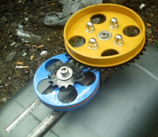 Kollege Tom wollte einen kundenspezifischen Antrieb der dem System Steurer nachempfunden ist sprich Motor treibt mit Riemen eine Vorgelegewelle an die mittels Ritzel in einen Großzahnradkranz an der Umlenkscheibe eingreift. Mangels entsprechender verfügbarer Zahnräder musste der Kettenradsatz einer Honda CB125 dafür herhalten dessen Räder ohne die Kette zukünftig diese Aufgabe wahrscheinlich grummelnd wie die Originalantriebe übernehmen werden.