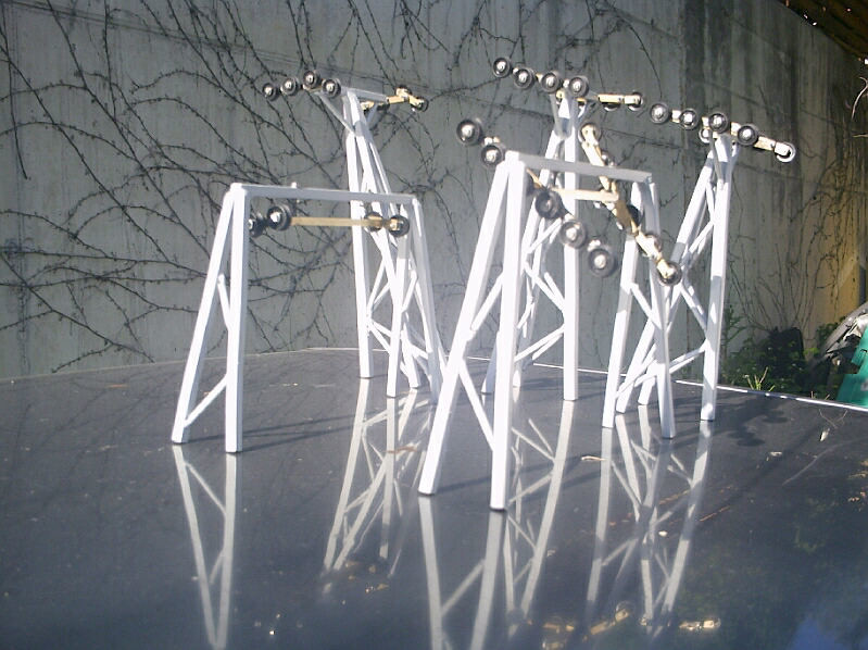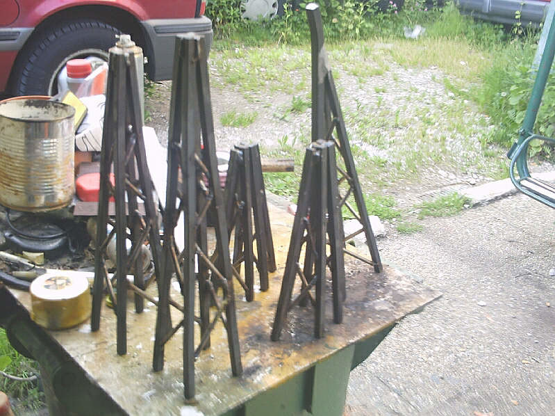 Links zwei Steurer - T - Gitterstützenschäfte, daneben zwei x zwei Gitterportalstützenseitenteile und das schräge dreifüßige Monster rechts auf den Pics wird die W&S - Tragstütze. Zusammengeschweißt wurden die Teile aus 8 mm Quadrat - sowie 5 mm Rundstahlstücken - wirken aber auf den Pics leider etwas massiver als sie wirklich sind.