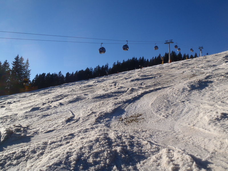 Die Nordhänge (bis auf Neujahr) den ganzen Tag lang eisig. Die Südhänge anfangs griffig, dann weicher werdend und am Ende des Tages sulzig mit Buckeln, zwischen den Buckeln mal mehr mal weniger eisig.