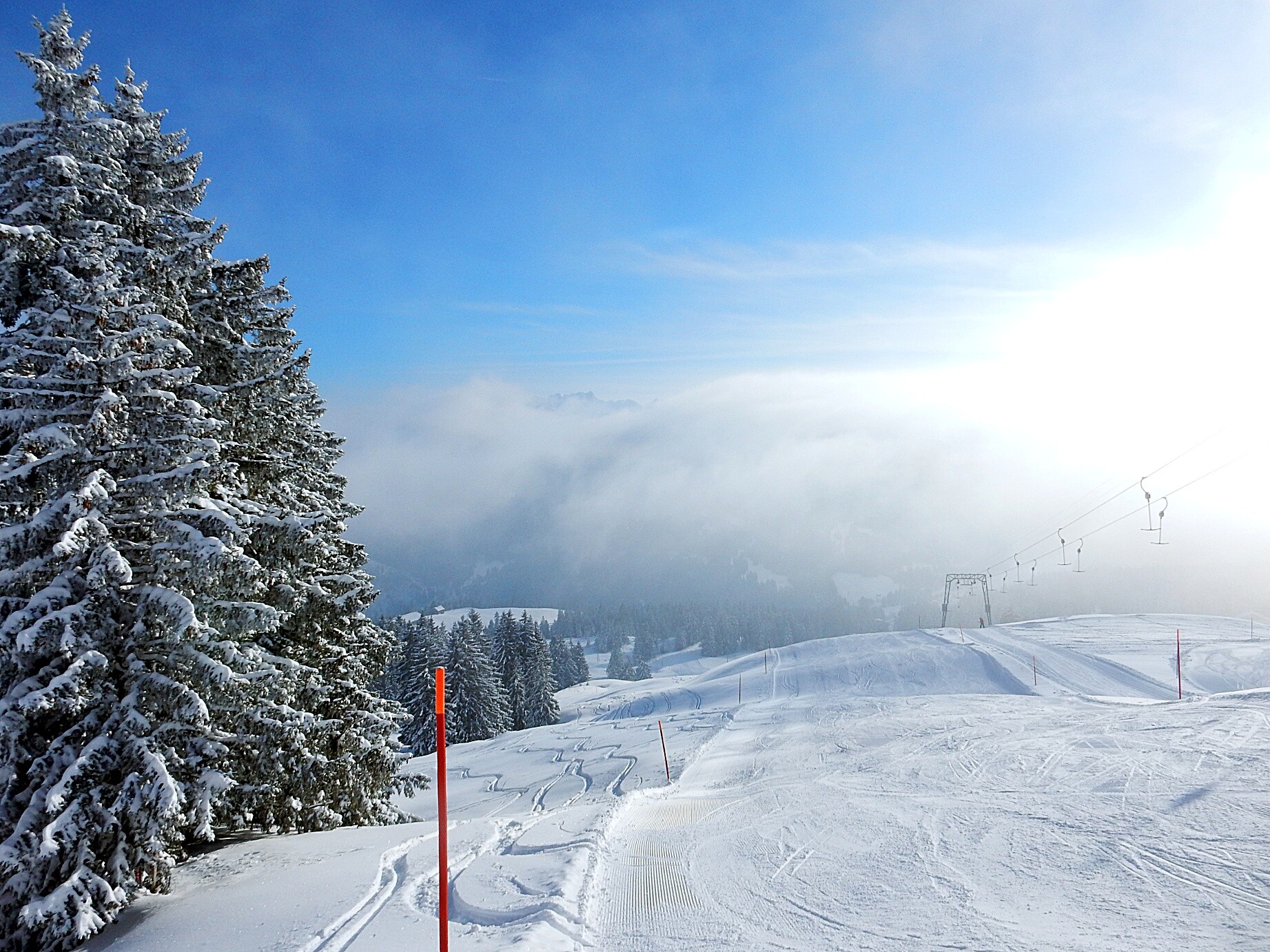 Anfänglich gab es noch ein bisschen Hochnebel an den Haggenegg-Liften, aber der lichtete sich immer wieder und gegen 11 Uhr war strahlender Sonnenschein, bevor es am Nachmittag vom Flachland her wieder zuzog. Der Bereich Ibergeregg/Handgruobi/Grossenboden hatte den ganzen Tag Sonne.