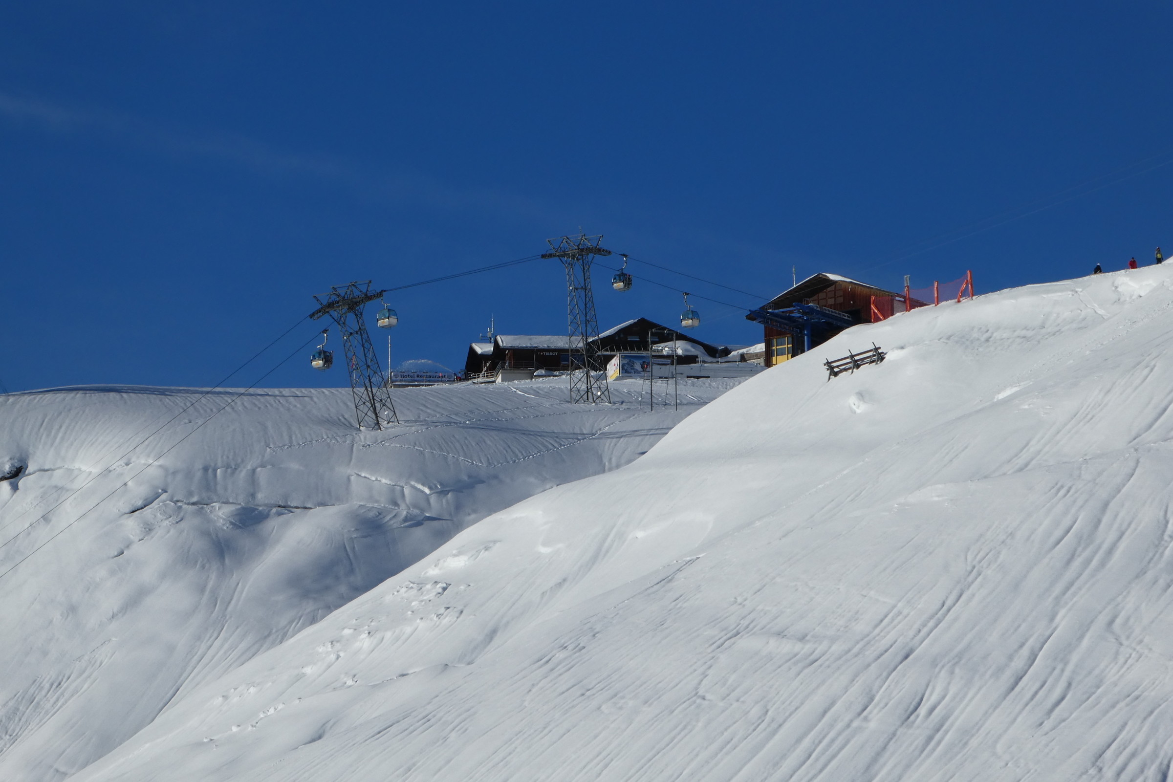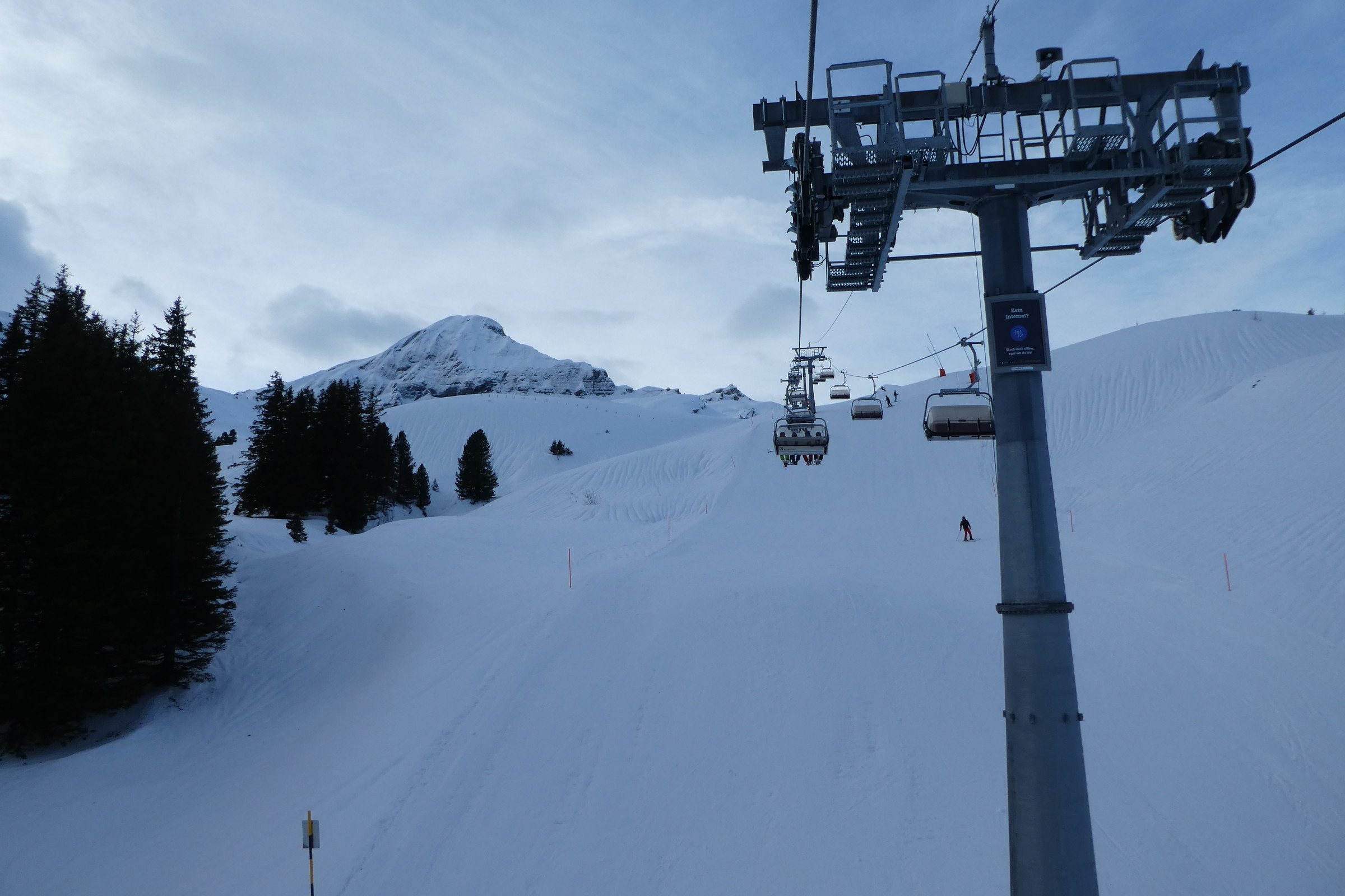 Heute fuhren wir zum Skifahren auf den Männlichen. Wegen dem Regen in den letzten zwei Tagen waren die Pisten sehr hart. Auch sah man Sturmschäden wie umgestürzte Bäume etc.