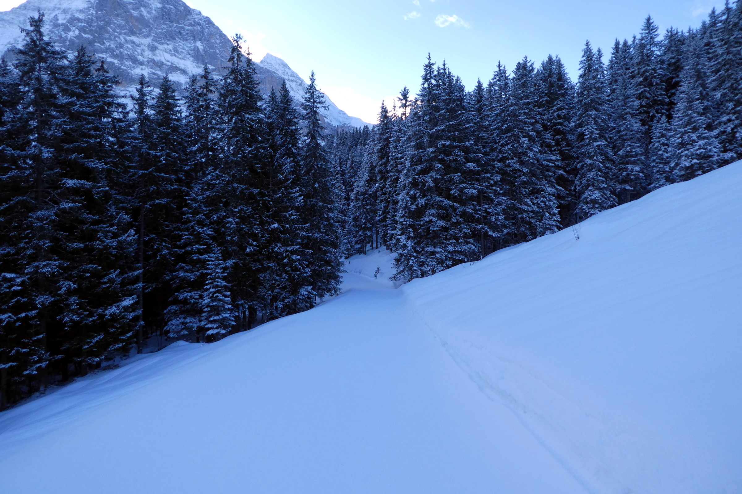 Auf der Piste zum Wetterhorn. Das ist die Talabfahrt ganz rechts. Diese Piste führt über ein recht feuchtes Gebiet. Dementsprechend hat es die Piste ab und zu unterschwemmt und es hatte Löcher drin. Landschaftlich ist die Piste aber toll. Nicht so für Snowboarder geeignet, da es anfangs ein paar Schiebestücke hat.