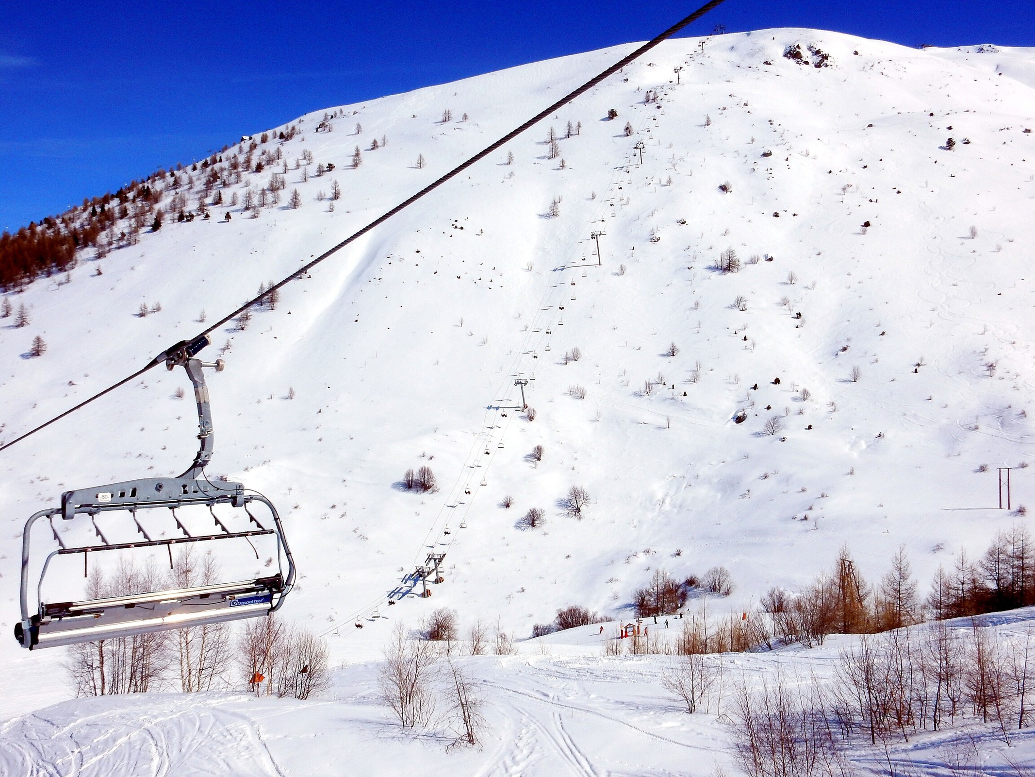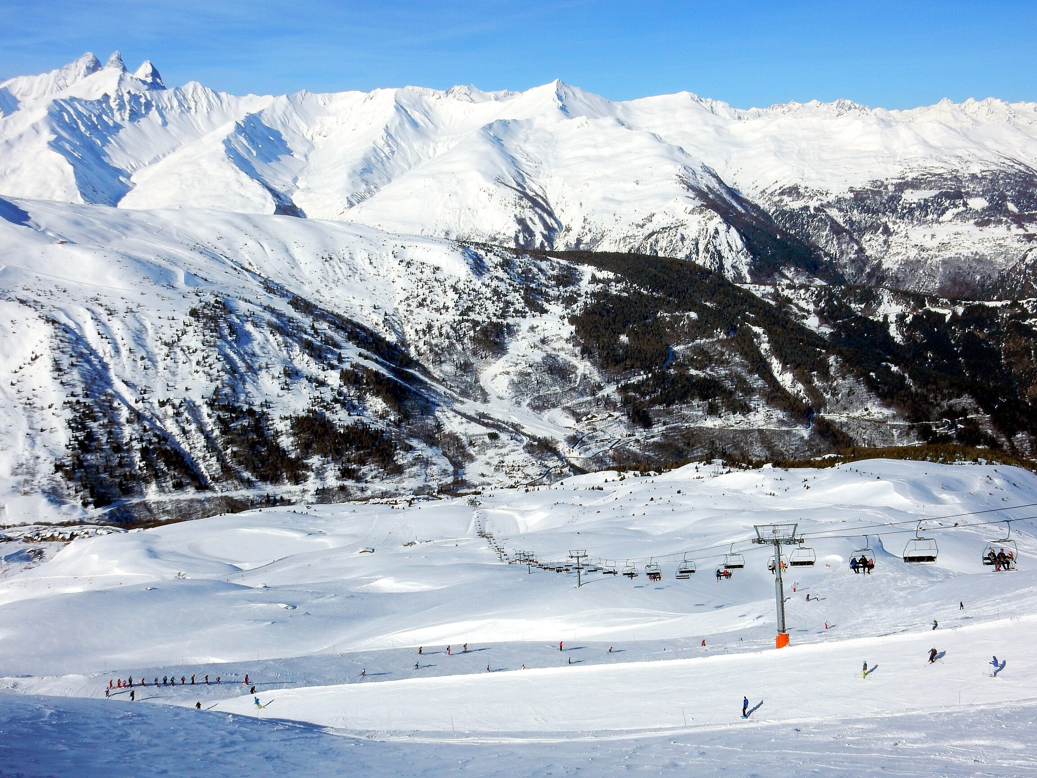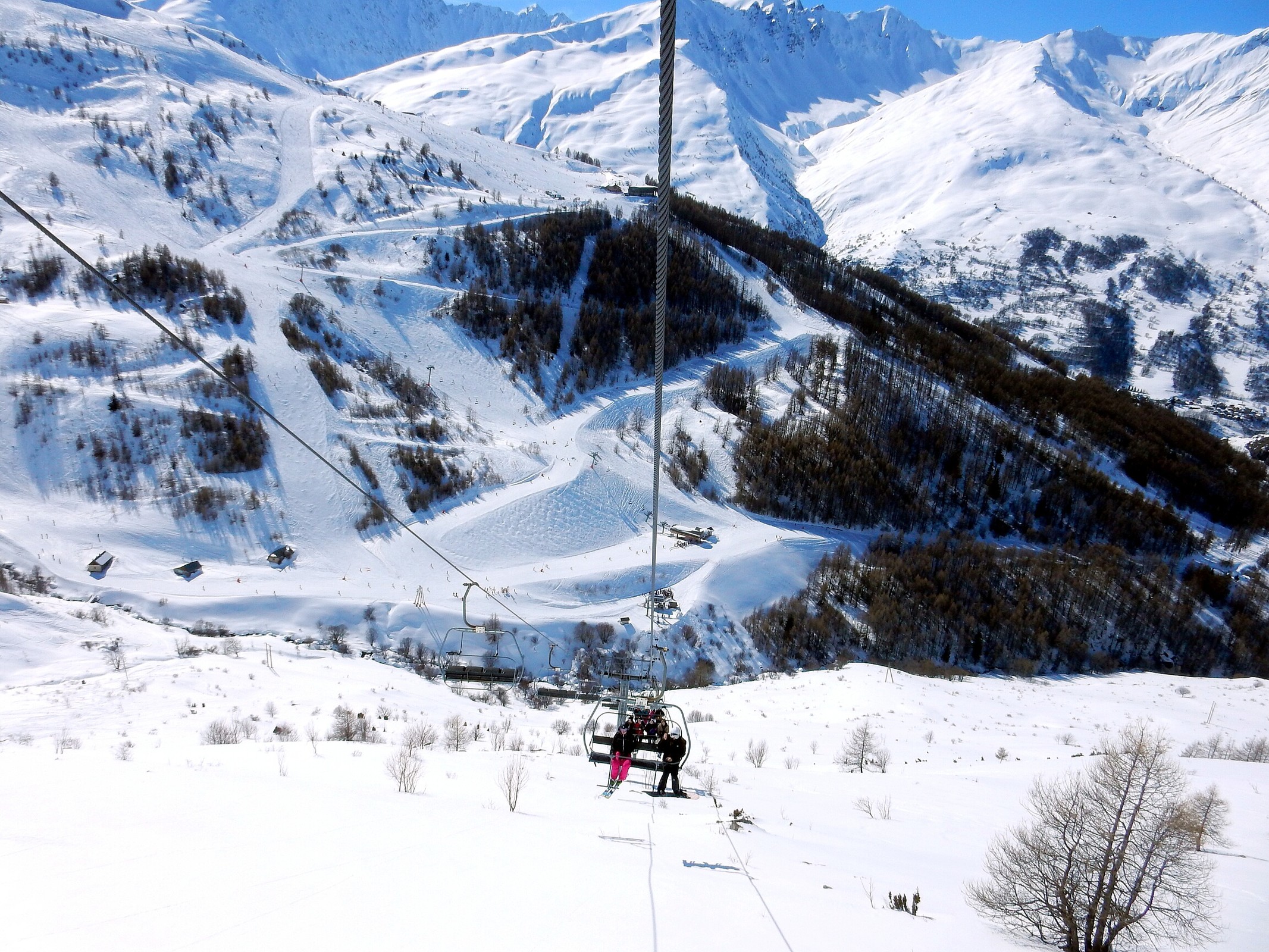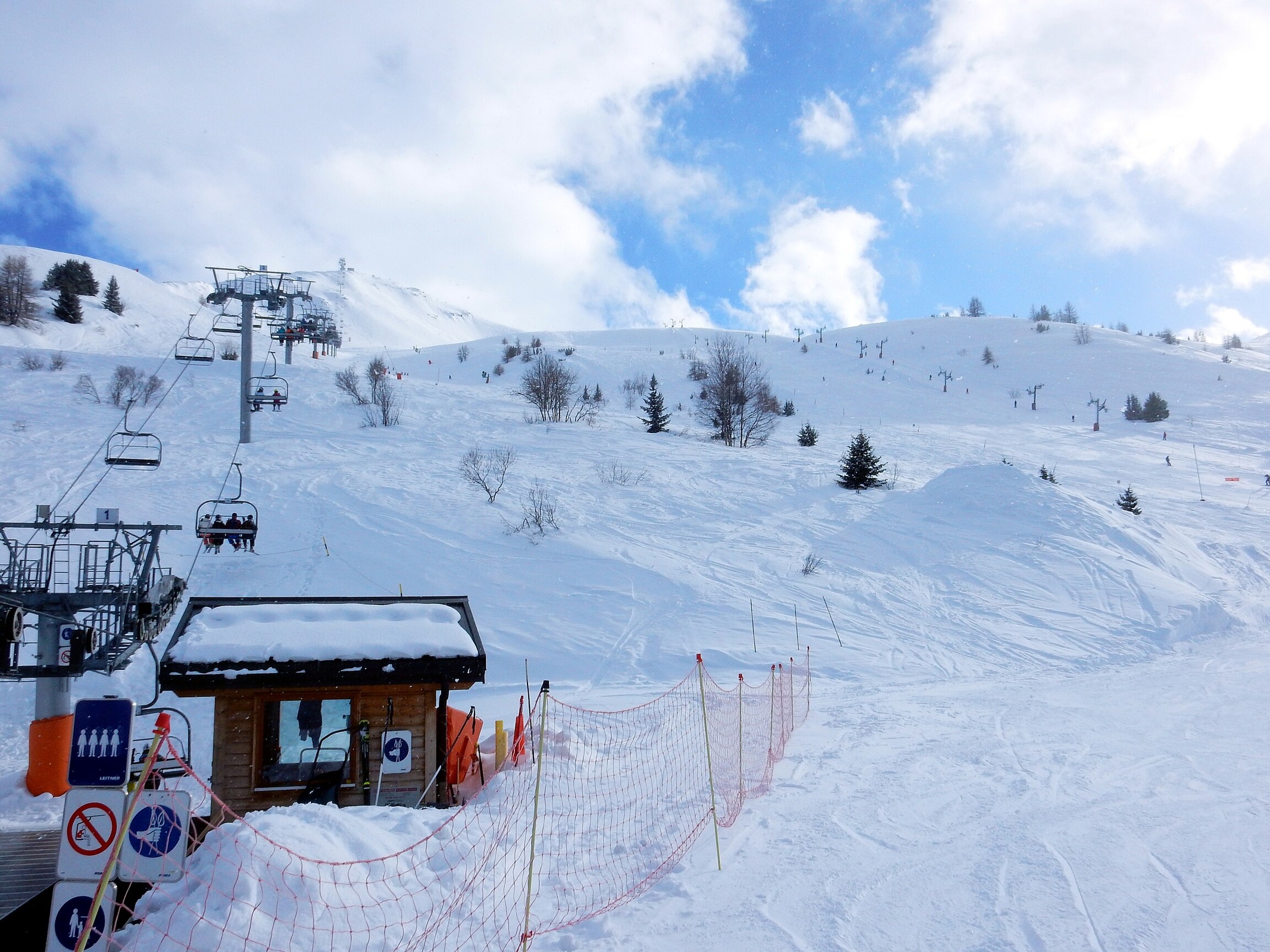 Der Valmeinier Sektor ist eher klein, rechts eine ewig lange 4KSB (Inversins), in der Mitte eine das meist erschließende 6KSB (erinnert im unteren Teil ein wenig an Les Menuires), die linke Seite des Hangs wird durch 2 lange 4SBs erschlossen. Davon bietet die untere eine schöne rote Abfahrt, die oberen eine geht so rote Abfahrt (die zu kurz ist und dann an der 6KSB rauskommt) und eine naja aussehende blaue Abfahrt. Dafür hat man von dort oben eine tolle Sicht auf Orelle und die hintere Maurienne.
