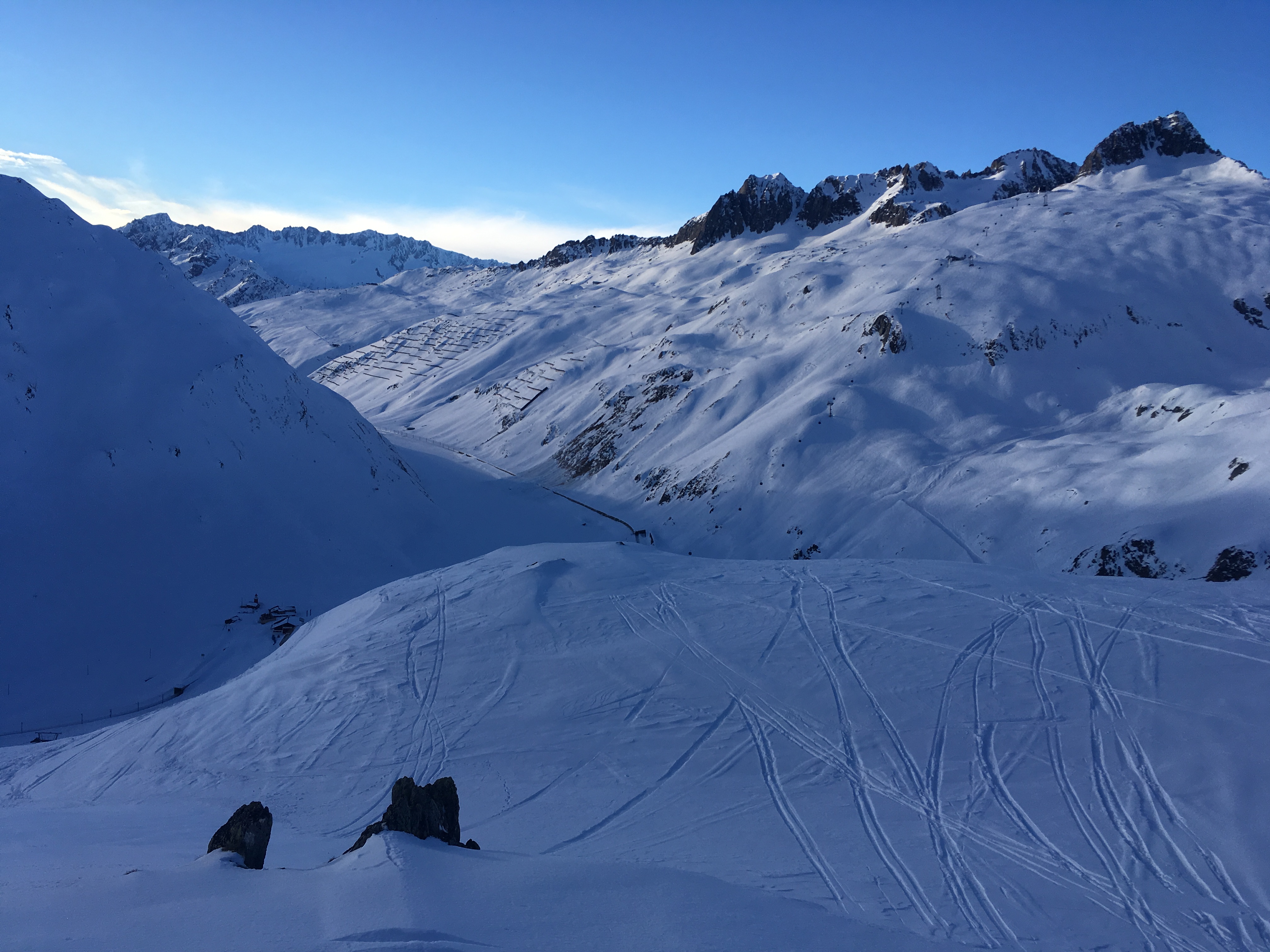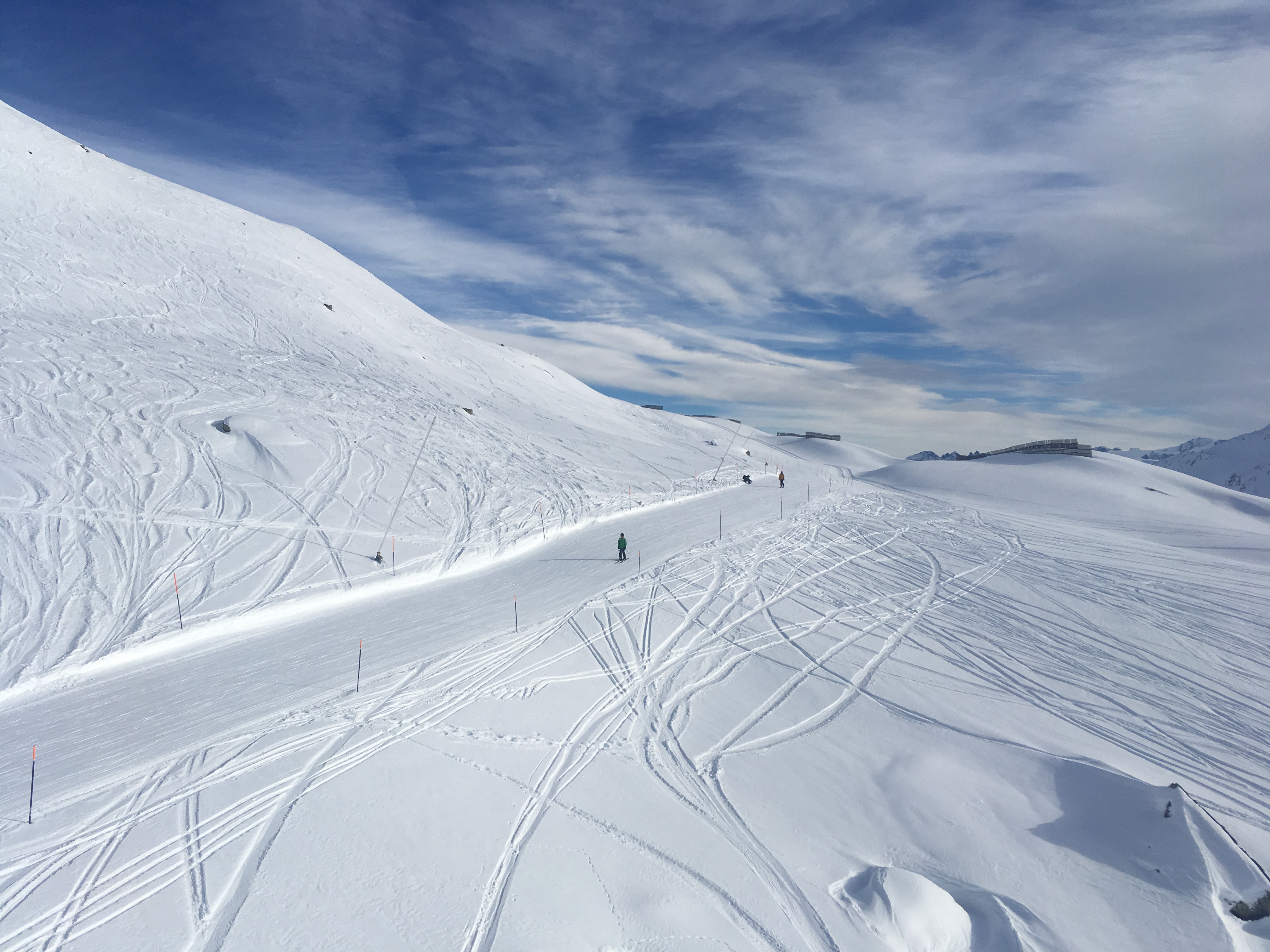Bei Neuschnee musste ich schon vom Lutersee- zum Gütsch-Flyer schieben. Das stimmt. Aber es stört mich im Gesamteindruck nicht so sehr. Jedenfalls viel weniger als in der Aletscharena.
