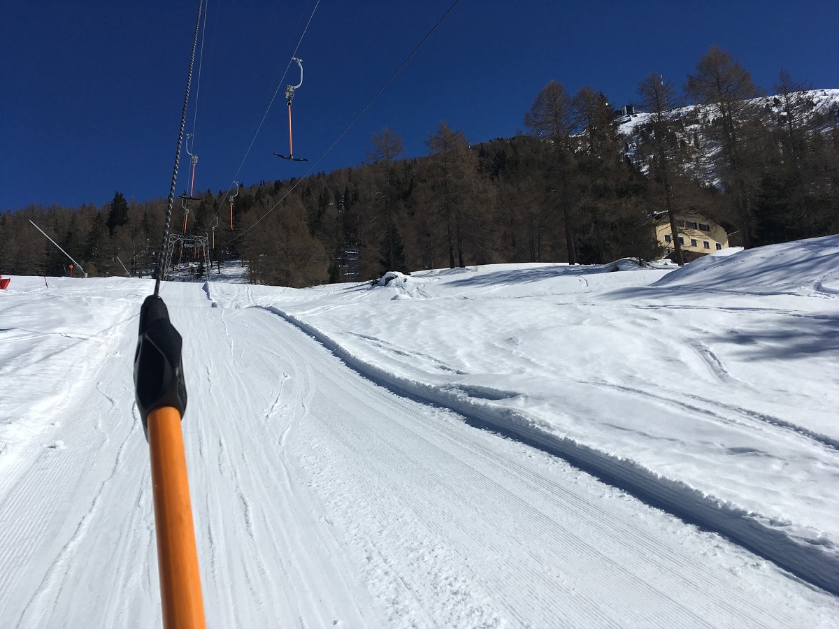 Von der Weinbergbahn gleich rechts weg durch das Gebäude des Bergstationskomplexes durch so eine Art Tor und schon ist man auf der Südabfahrt. Aussenrum über den Hügel schieben braucht man gar nicht.Der SL war halt ziemlich langsam, gefühlt vielleicht 1 m/s, nur noch getoppt vom kurzen Panoramaschlepper, den man am Gipfel braucht, um auf die Südseite rüberzukommen, wenn man wie ich zu faul ist ein paar Meter hochzuschieben. Der hatte gefühlt vielleicht 0,5 m/s.