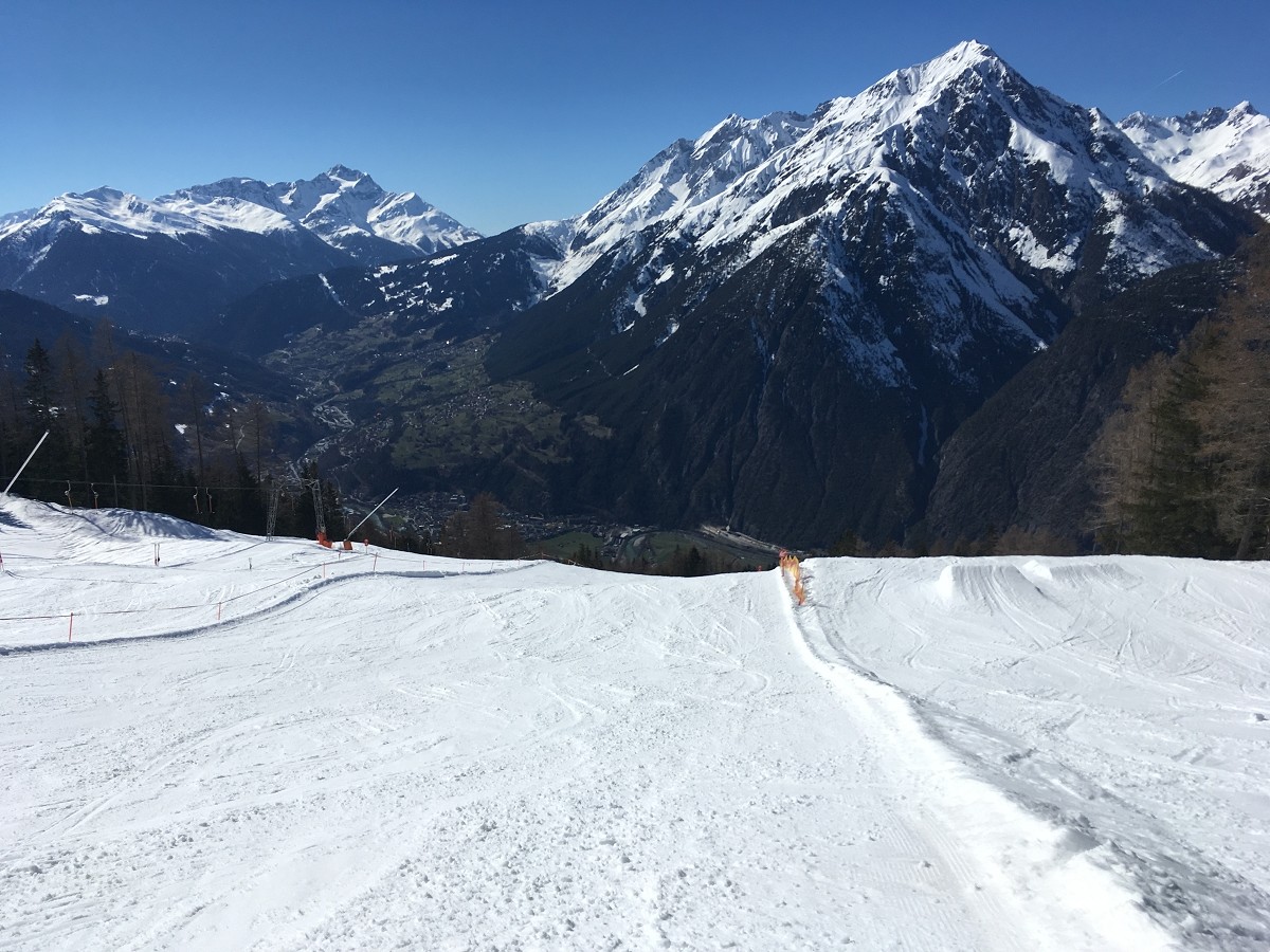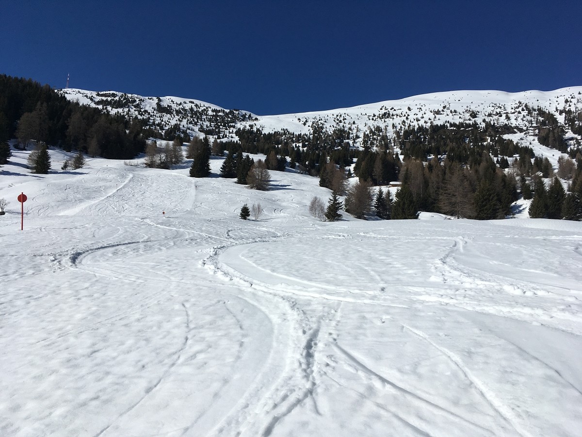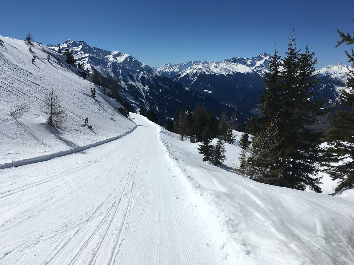 Die Talabfahrt (Rifenal) hatte mir eigentlich auch ganz gut gefallen, durch einige Querfahrten ist sie recht abwechslungsreich, dazwischen gibt es immer wieder kurze Steilstücke, die mindestens als dunkelrot einzustufen sind. Weiter unten gabs hier dann auch mal Eisplatten und auch Steine, der letzte Hang war dann nur noch ein Schneeband.