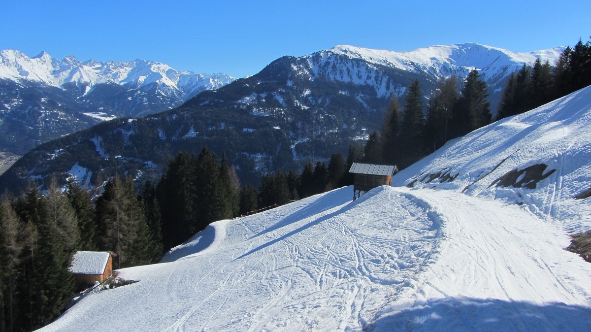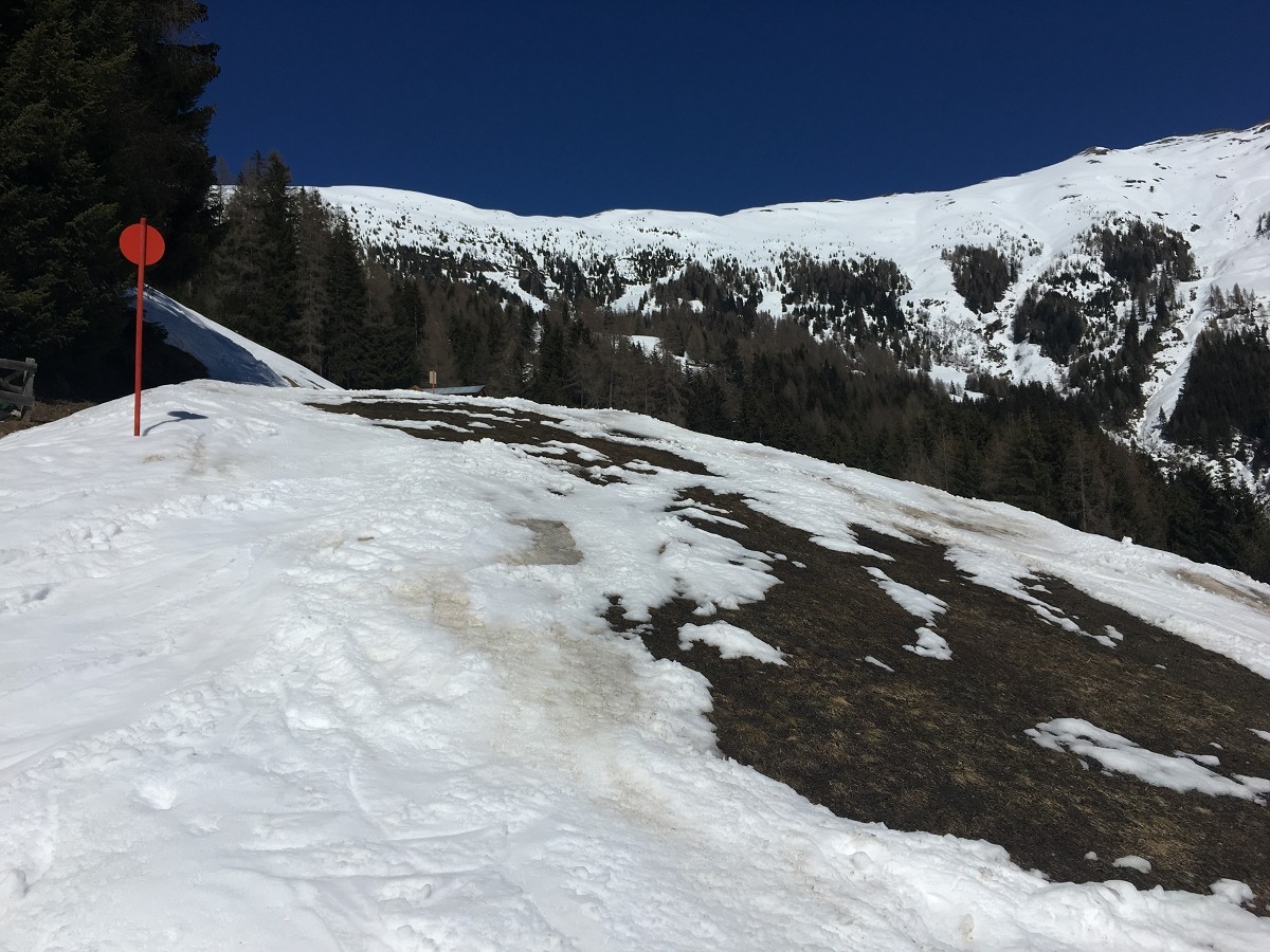 Schneeverhältnisse: sulzig, im Gelände S-seitig teils Firn; nordseitig oben (Weinberg) Pulver, mittig (Hüttenlift) Sulz; Talabfahrt unten teils Eisplatten und Steine