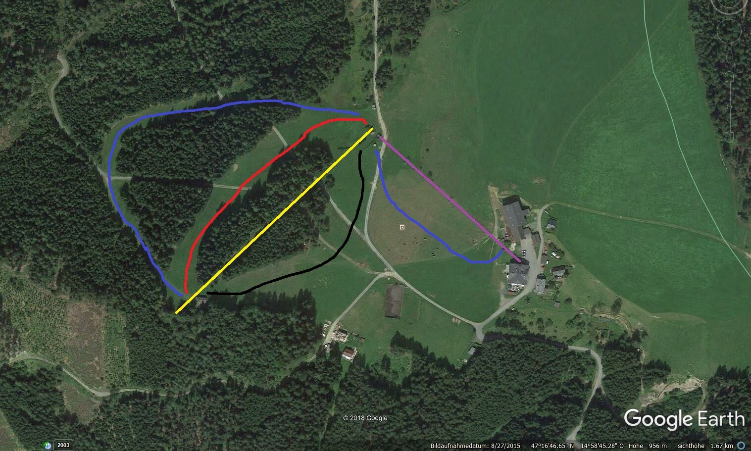 #1 Einen Pistenplan habe ich nicht gefunden, daher hier das Satellitenbild von Google Earth, in das ich die Lifte und Abfahrten eingezeichnet habe.