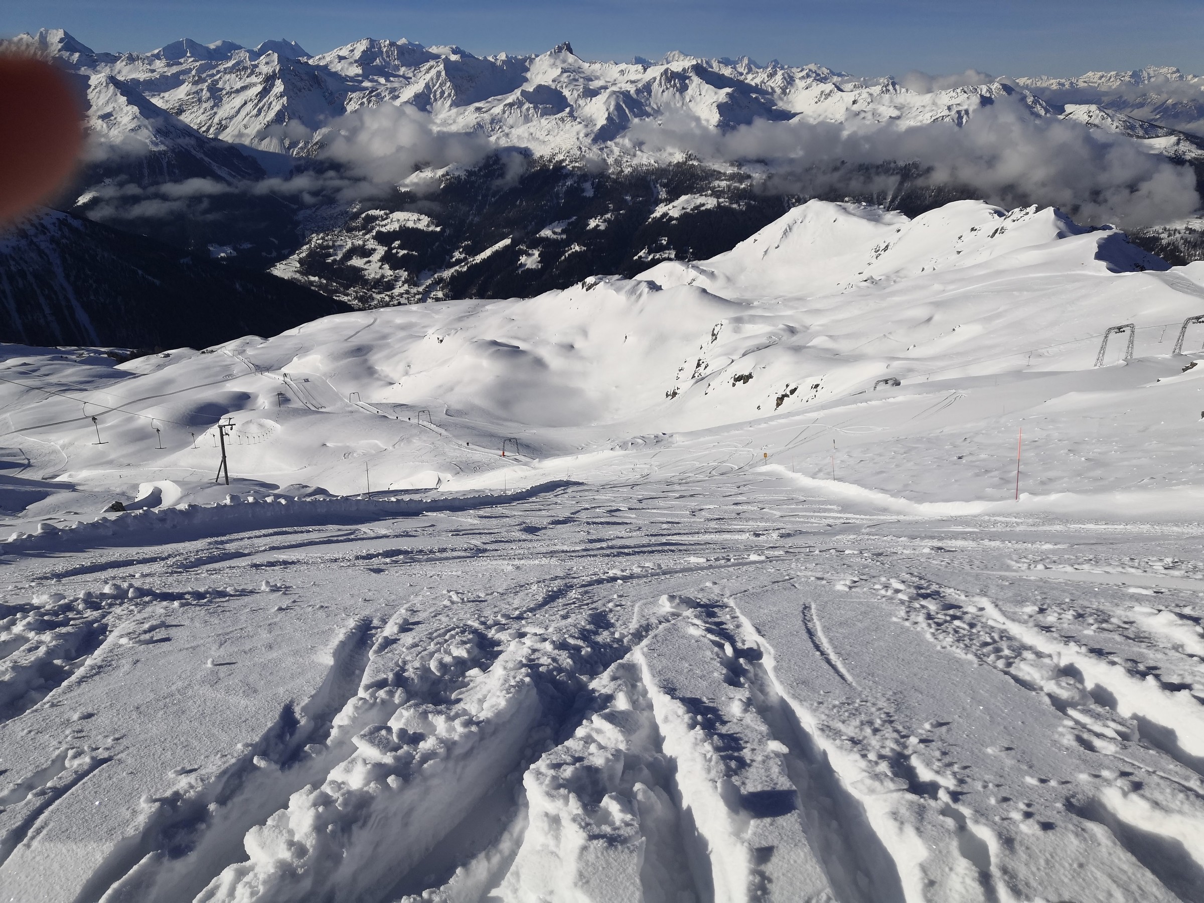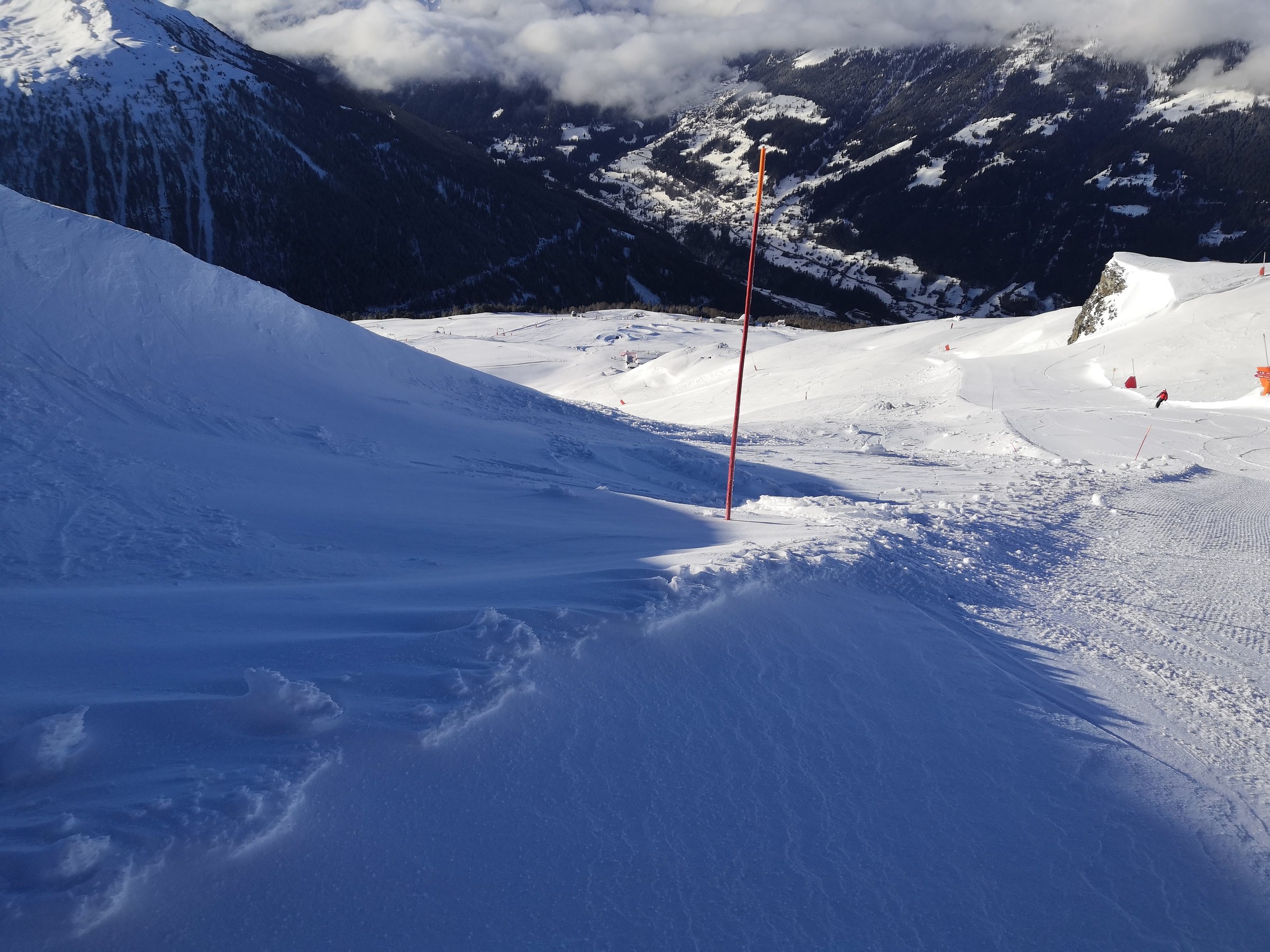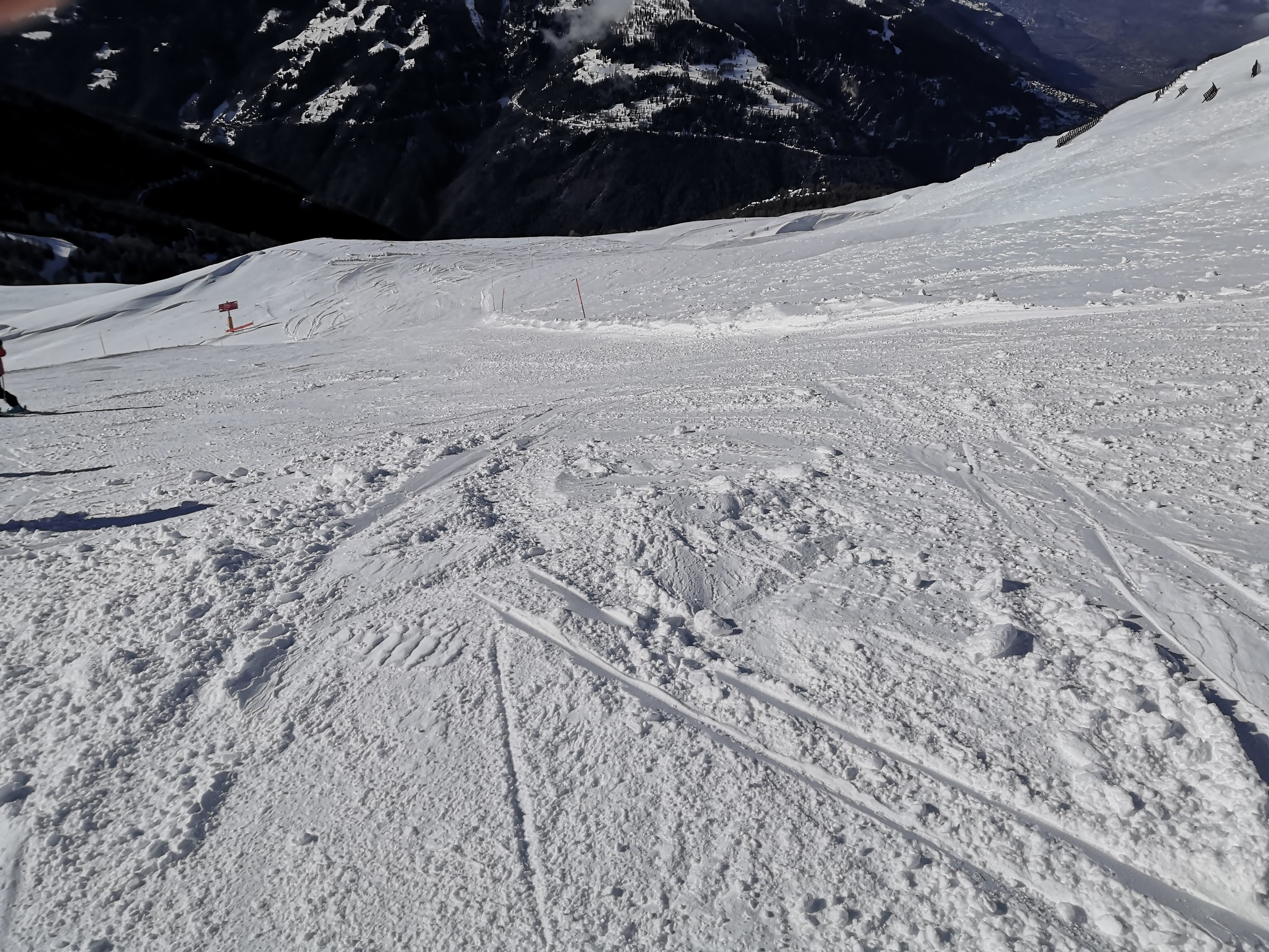 Der Pas de Boeuf Lift ist einer der tollsten, den ich je gefahren bin. Er führt auf einer Länge von 2.3 km durch eine verlassene Ebene, enthält Steilstücke sowie 3 Kurven und hat auch ein ordentliches Tempo. Die rote Piste, die er erschliesst, ist landschaftlich sowie skifahrerisch richtig gut. Daneben gibt es noch eine gelbe und eine blaue Variante, beide relativ flach. Da mir das Panorama beim Skifahren sehr wichtig ist, sind diese Pisten und das Gebiet allgemein sehr toll für mich. Deshalb habe ich auch das Wallis lieber als Graubünden, weil die Berge einfach noch höher sind. Vom Pas de Boeuf ging's weiter zum Bella-Tola Schlepplift, natürlich von Poma, und auch mit zwei Kurven und ebenfalls fernab jeglicher Pisten. Wie bereits erwähnt wird das Panorama mit jedem Höhenmeter besser und vom Bella-Tola auf 3000 Meter hat man den ultimativen Ausblick. Wenn man dann noch die 50 Meter Aufstieg bis auf den Gipfel macht, was in Skiausrüstung nicht ganz ohne ist, wird man mit dem schönsten Panorama belohnt. Man sieht u.a. Matterhorn, Mont-Blanc, Weisshorn, Dom, Grand Combin, Zinalrothorn, Diablerets, Bietschhorn, insgesamt etwa 15 4000er und viele Skiorte wie CMA, Leukerbad, und die restlichen VdA-Orte. Neben dem weltklasse Panorama erschliesst der Lift auch tolle Pisten. Die Standardabfahrt führt durch steiniges Gebiet relativ flach wieder zur Talstation, doch es gibt auch noch eine gelbe Piste, die es in sich hat. Von der Bergstation muss man über ein schmales Spürchen einen schneearmen Hang queren. Man muss mindestens einmal die Skier abziehen, wenn man sie nicht total zerkratzen will, und das in relativ steilem Gelände. Ein Kind würde ich hier wohl eher nicht mitnehmen. Man wird jedoch mit einem schönen Sonnenhang belohnt, der mit dem gefallenen Neuschnee super pulvrig war. Allgemein finde ich es toll, dass das Gebiet so viele gelbe Pisten in verschiedenen Schwierigkeitsstufen offeriert. So kann man auch ohne Ortskunde tolle Pulverrouten entdecken und Kinder können das fahren auf Buckeln und Pulver üben.