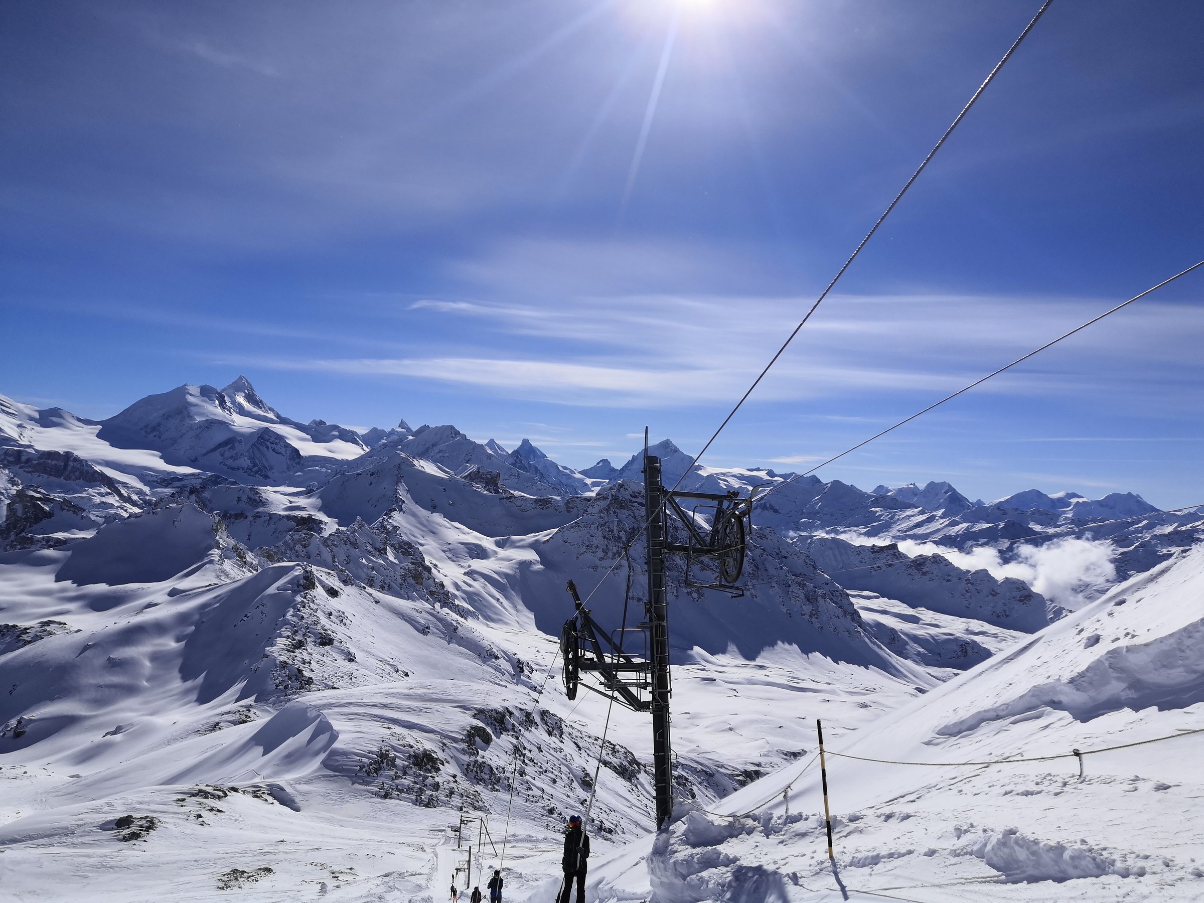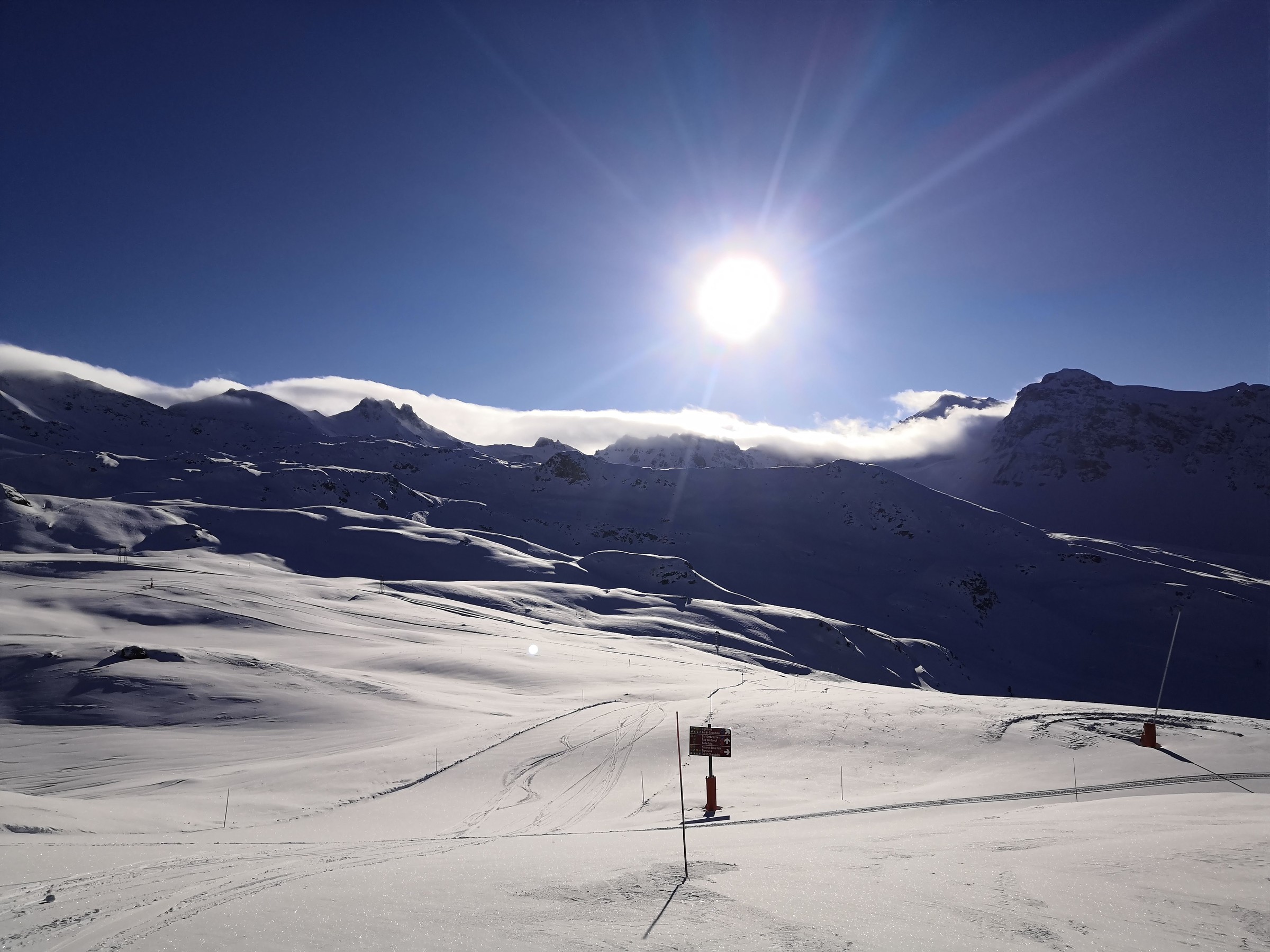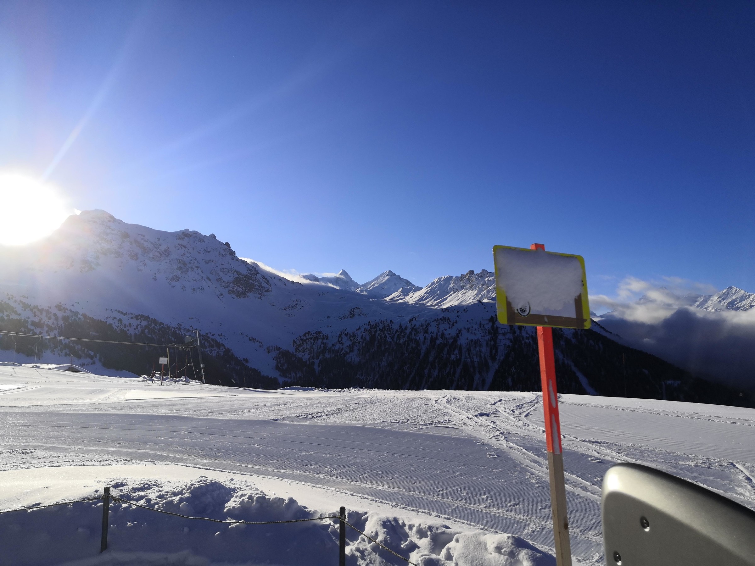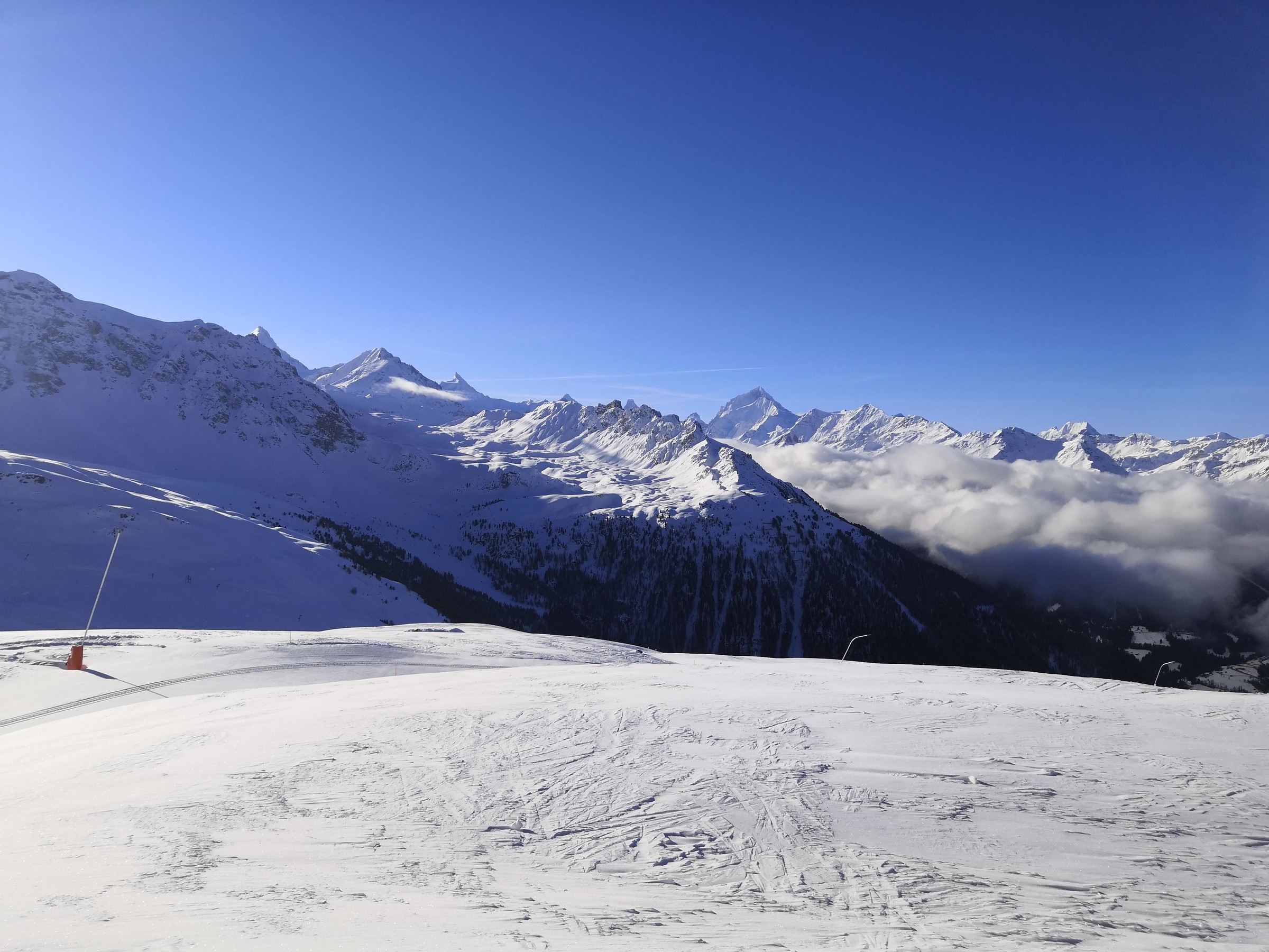 Der Pas de Boeuf Lift ist einer der tollsten, den ich je gefahren bin. Er führt auf einer Länge von 2.3 km durch eine verlassene Ebene, enthält Steilstücke sowie 3 Kurven und hat auch ein ordentliches Tempo. Die rote Piste, die er erschliesst, ist landschaftlich sowie skifahrerisch richtig gut. Daneben gibt es noch eine gelbe und eine blaue Variante, beide relativ flach. Da mir das Panorama beim Skifahren sehr wichtig ist, sind diese Pisten und das Gebiet allgemein sehr toll für mich. Deshalb habe ich auch das Wallis lieber als Graubünden, weil die Berge einfach noch höher sind. Vom Pas de Boeuf ging's weiter zum Bella-Tola Schlepplift, natürlich von Poma, und auch mit zwei Kurven und ebenfalls fernab jeglicher Pisten. Wie bereits erwähnt wird das Panorama mit jedem Höhenmeter besser und vom Bella-Tola auf 3000 Meter hat man den ultimativen Ausblick. Wenn man dann noch die 50 Meter Aufstieg bis auf den Gipfel macht, was in Skiausrüstung nicht ganz ohne ist, wird man mit dem schönsten Panorama belohnt. Man sieht u.a. Matterhorn, Mont-Blanc, Weisshorn, Dom, Grand Combin, Zinalrothorn, Diablerets, Bietschhorn, insgesamt etwa 15 4000er und viele Skiorte wie CMA, Leukerbad, und die restlichen VdA-Orte. Neben dem weltklasse Panorama erschliesst der Lift auch tolle Pisten. Die Standardabfahrt führt durch steiniges Gebiet relativ flach wieder zur Talstation, doch es gibt auch noch eine gelbe Piste, die es in sich hat. Von der Bergstation muss man über ein schmales Spürchen einen schneearmen Hang queren. Man muss mindestens einmal die Skier abziehen, wenn man sie nicht total zerkratzen will, und das in relativ steilem Gelände. Ein Kind würde ich hier wohl eher nicht mitnehmen. Man wird jedoch mit einem schönen Sonnenhang belohnt, der mit dem gefallenen Neuschnee super pulvrig war. Allgemein finde ich es toll, dass das Gebiet so viele gelbe Pisten in verschiedenen Schwierigkeitsstufen offeriert. So kann man auch ohne Ortskunde tolle Pulverrouten entdecken und Kinder können das fahren auf Buckeln und Pulver üben.
