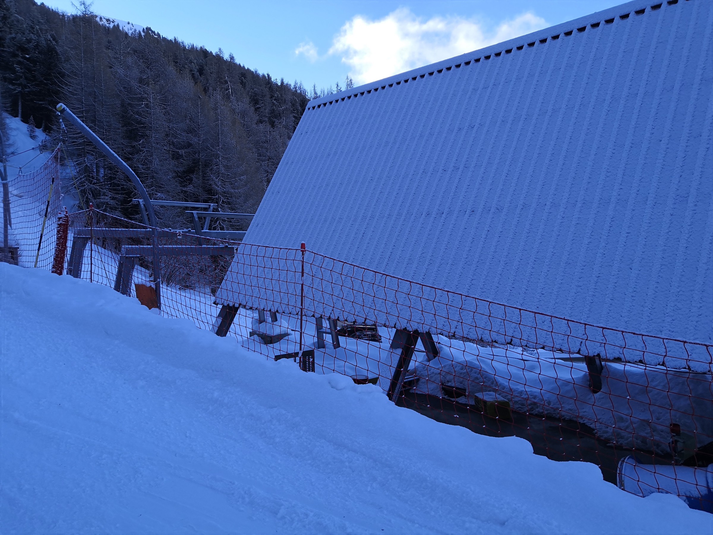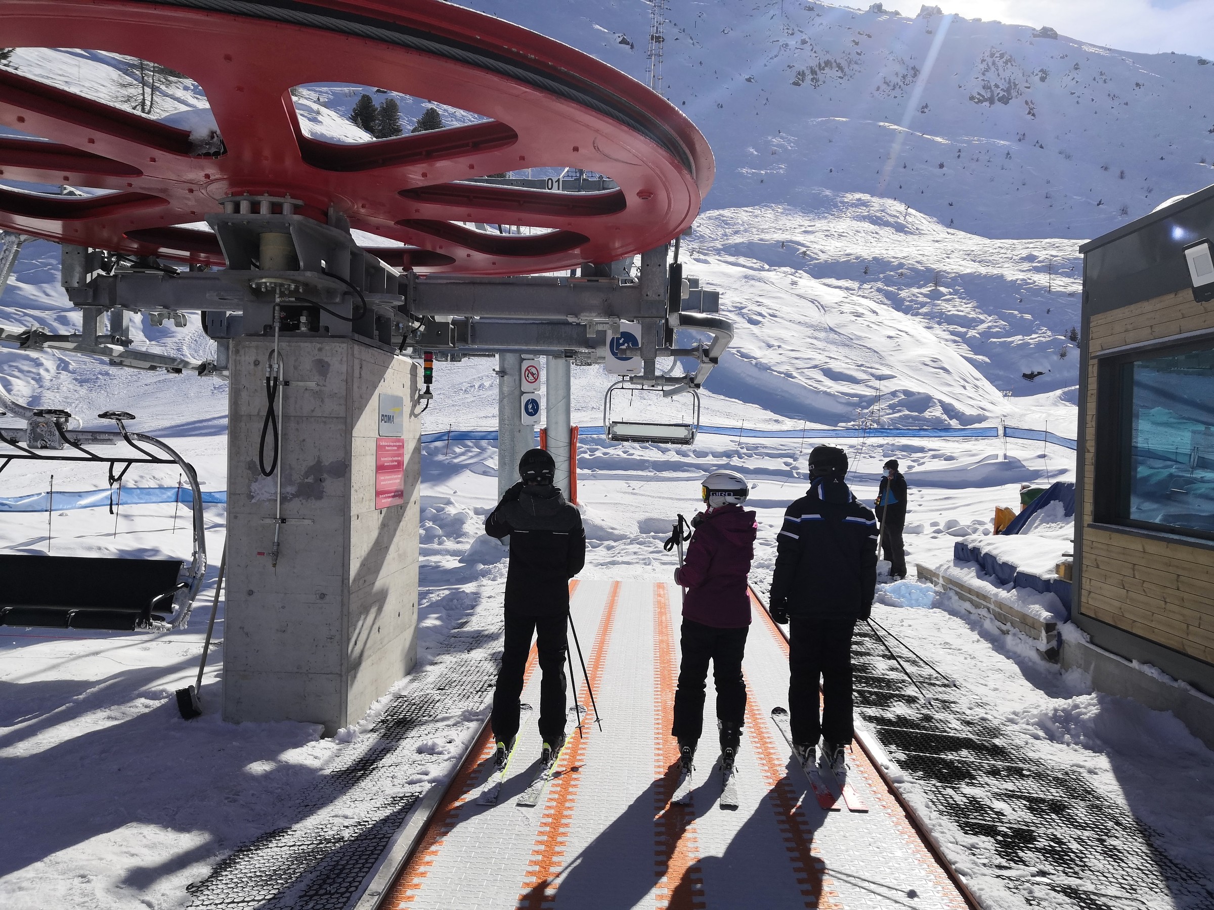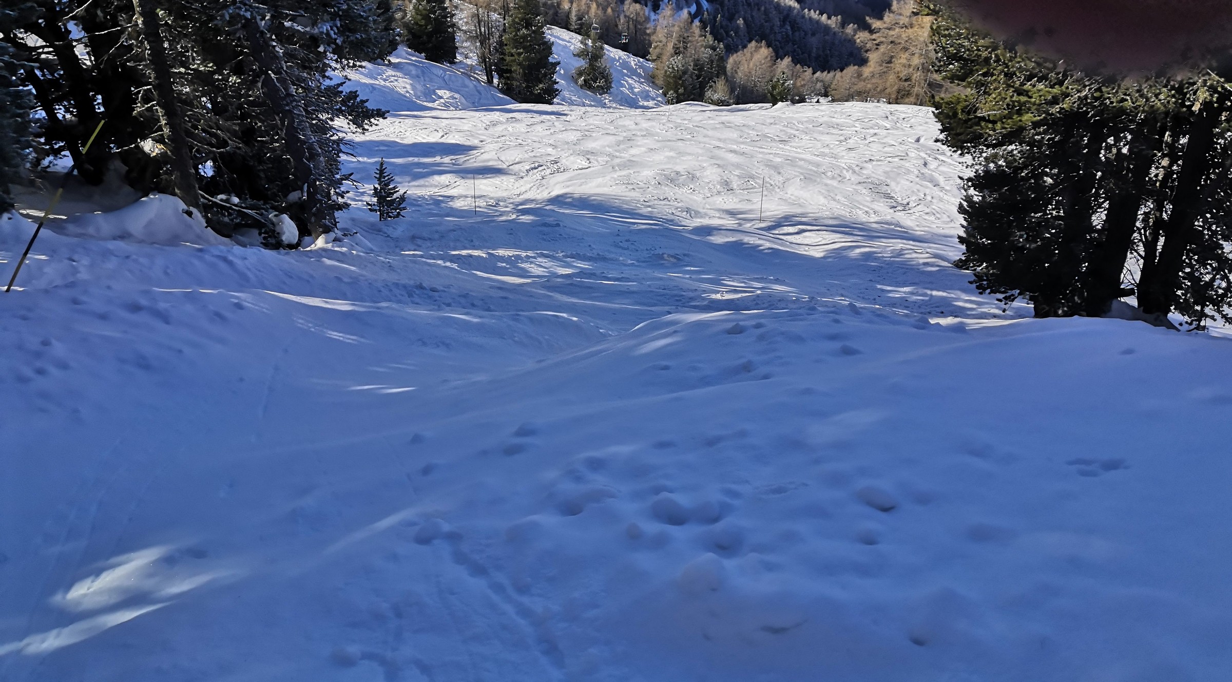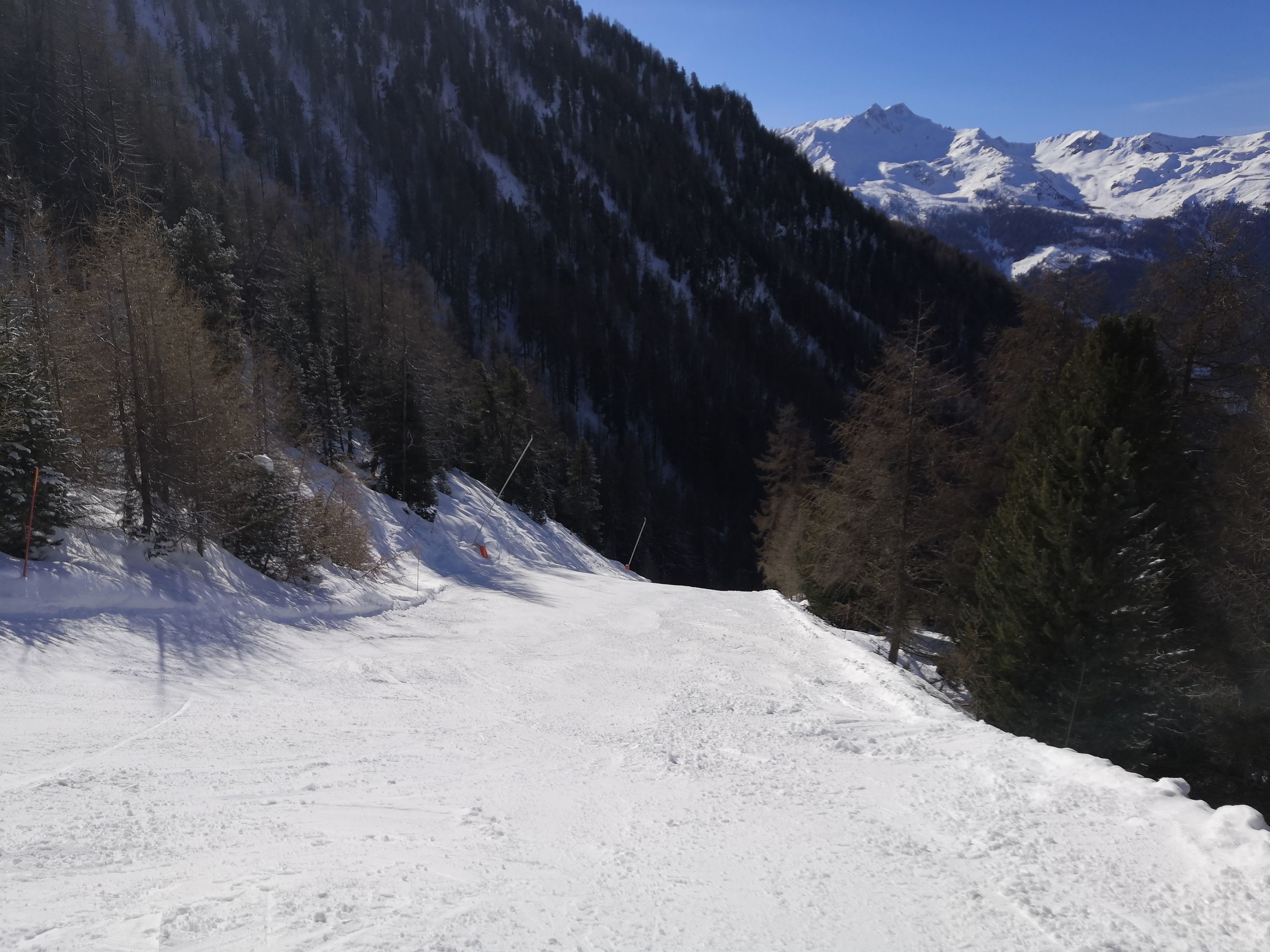 Nach der Pause wollte ich endlich den Gebietsteil Pas-de-Boeuf und Bella-Tola entdecken, der am Morgen noch im Schatten war. Hinter der Talstation des Col des Ombrintzes-Lift führt eine kurze Piste zum Poma-Schlepper Pas de Boeuf. Die kurze sehr sonnige Piste wird mit 3 Lanzen beschneit, sinnbildlich dafür, dass die Beschneiung hier sehr klug eingesetzt wird. Es hat einige wenige vollbeschneite Pisten, was jedoch im sonnigen Gebiet nicht weiter stört. Ansonsten wird nur dort beschneit, wo es dringend nötig ist.