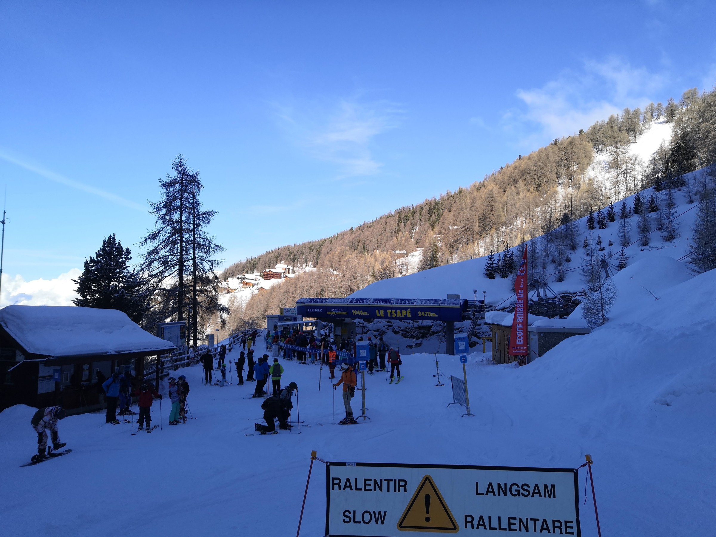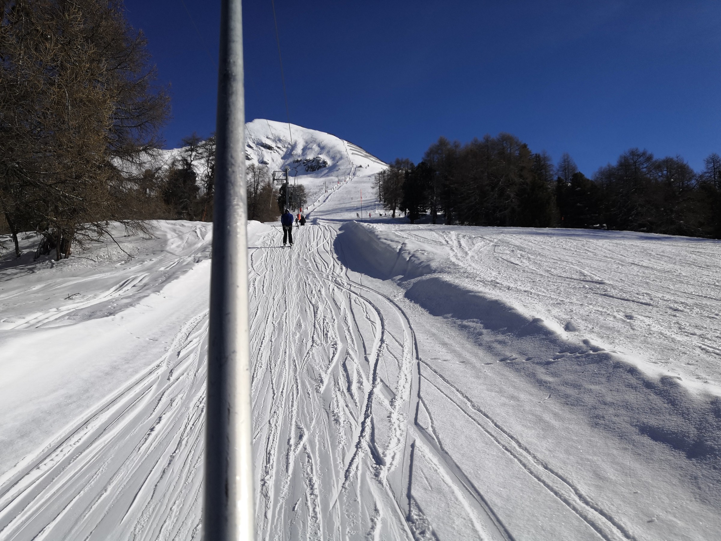 Der Bus von Vissoie fährt leider nicht durch den autofreien Ortskern bis zur Talstation, er würde jedoch bei der Talstation Chandolin halten. Deshalb muss man noch Ski schultern, bis man bei der Talstation angelangt. Dort fährt die sehr schnelle Garaventa-SSB ab 8:45. Es ist die einzige Garaventa-Anlage im Gebiet mit 10 Anlagen(!) Die Lifte weiter oben fahren jedoch erst um 9:00, also konnte ich unten am Tignousa-Schlepper schonmal das Panorama geniessen. Über Nacht hatte es leicht geschneit, in St-Luc ein kleines Zückerchen, auf Tignousa ca. 10 cm und auf der Bella-Tola fast 30 cm. Nach einer Wiederholungsfahrt an der tollen Carvingpiste ging es zur 6-KSB Forêt. Sie ist, wie viele Anlagen im Gebiet, von Poma, (wusste gar nicht, dass die auch KSBs machen). Sie ist sehr bequem und trotz Sicherheitsbügeln sind die Fussrasten gross genug für die Skis, nicht wie bei Garaventa. Von dort ging's weiter zum Col des Ombrintzes, ein Bügellift, der ebenfalls von Müller ist. Das Panorama wird hier mit jedem gewonnenen Höhenmeter besser. . Nach einer Wiederholungsfahrt ging's zur Verbindungspiste nach Chandolin. Sie verläuft fernab aller Anlagen, ist aber relativ flach und bei diesem Neuschnee kein sonderliches Vergnügen. Abseits der Piste hat es jedoch eine Vielzahl an Freeride-Möglichkeiten mit steilen Couloirs und schattigen Powder-Hängen. Heute habe ich diese jedoch links liegen gelassen. Die Piste mündet in die Piste der 4-KSB Le Tsapé im Gebietsteil Chandolin. Von der Bergstation gibt es eine gelbe Piste zurück nach Chandolin. Diese bin ich dann auch gefahren. Im oberen Teil, wo es mehr Neuschnee gegeben hatte, war sie gut und unten sehr hart. Wieder oben angekommen, ging es über ein längeres Gleitstück zum spektakulären Illhorn-Schlepplift von Poma mit seiner tollen Carving-Piste. Diese Piste gefiel mir heute, gelbe ausgenommen, am besten. Sie befindet sich weitab des spektakulären Lifts, der steil durch Lawinenverbauungen verläuft. Im unteren Teil sind Lift und Piste dann parallel. Hier machte ich einige Wiederholungsfahrten und ging dann wiederum via Gleitstück zum neuen Rotzé-Lift, auch von Poma. Die neue 4er Sesselbahn ist zwar fix geklemmt, da man hier aber sowieso keine Wiederholungsfahrten macht, ist das kein Problem, und die Fahrzeit ist ja auch verkürzt worden. Oben kommt sie am selben Ort an wie die Forêt-Sesselbahn. Von diesem Punkt aus gibt es eine tolle gelbe Piste in Richtung Col des Ombrintzes. Die sonnige Piste wird von vielen Leuten befahren, was zu tollen Buckeln führt. Von dort gelangte ich über Umwege nach Tignousa, wo ich Mittag ass. Die Preise fürs Take-Away waren relativ teuer, weshalb viele Leute einfach auf Steinen picknickten. Ich zahlte 25.- für Pasta und Getränk. Eigentlich der einzige Negativpunkt des Gebiets.