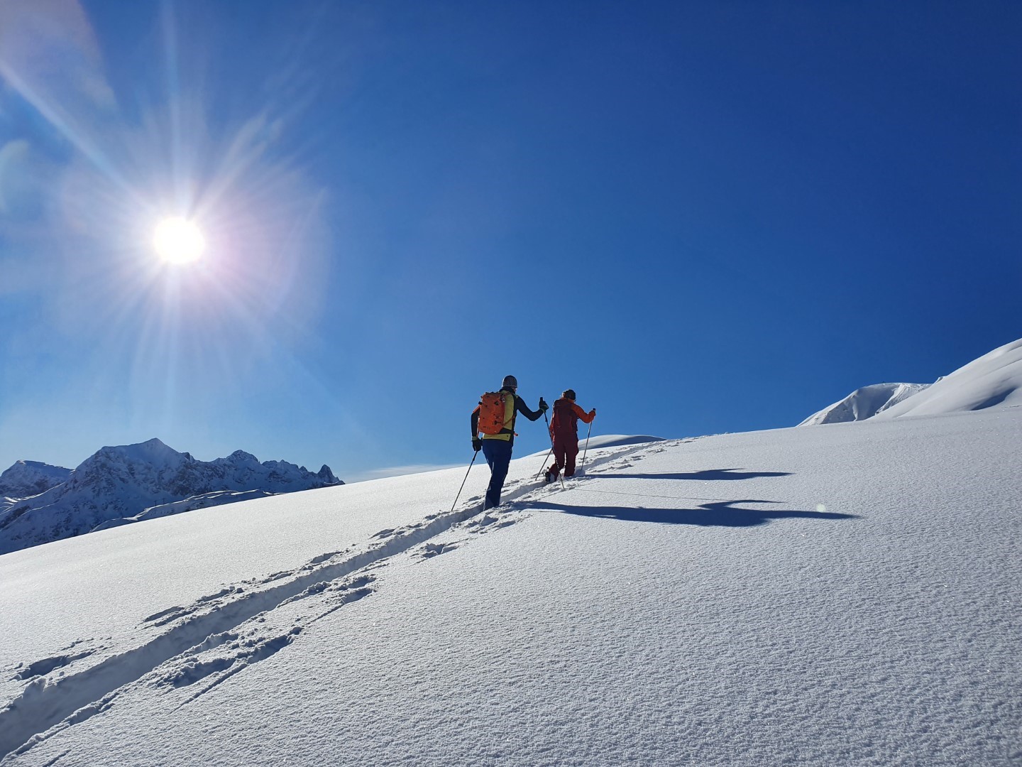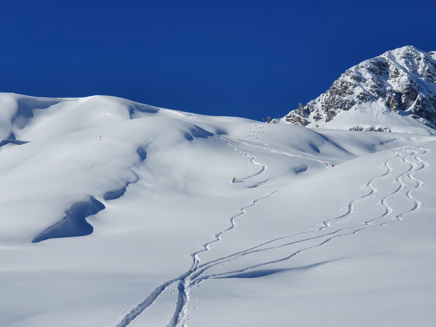 Ich kann mich selbst nicht daran erinnern, bessere Bedigungen im Dezember gehabt zu haben. Eigentlich ist alles fett eingeschneit. Oben lieben über 120cm Schnee, das heißt, viele Rinnen und Mulden sind schon gut mit Schnee gefüllt. Dazu gestern zum Ende vom Lockdown auch noch Sonne pur und wunderbarer Pulverschnee. Natürlich haben das einige genutzt und sind mit den Tourenskiern los. Besser geht es ja auch nicht, schließlich ist fast das ganze Skigebiet vorbereitet, die Pisten präpariert, aber nicht benutzt.