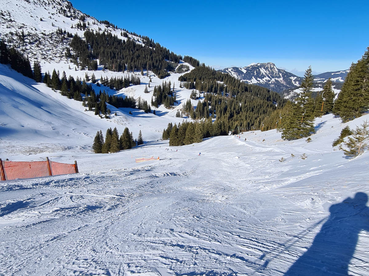 So, jetzt war ich am Samstag, 5.2.22 auch endlich mal dort. Dieses Skigebiet interessiert mich schon seit dem ersten Schauen in Skiatlas als Kind. Bei passender Gelegenheit wollte ich schon immer mal da hin. Nach zig Jahren war es jetzt endlich soweit - die Gelegenheit war da. Wir hatten auch Oberjoch auf der Rechnung. Dort war es allerdings bei der Anfahrt schon so voll, dass wir weiter nach Schattwald gefahren sind. Und erstaunlicherweise: Dort war kaum was los. Für so einen Top-Tag war es fast schon gespenstig leer.