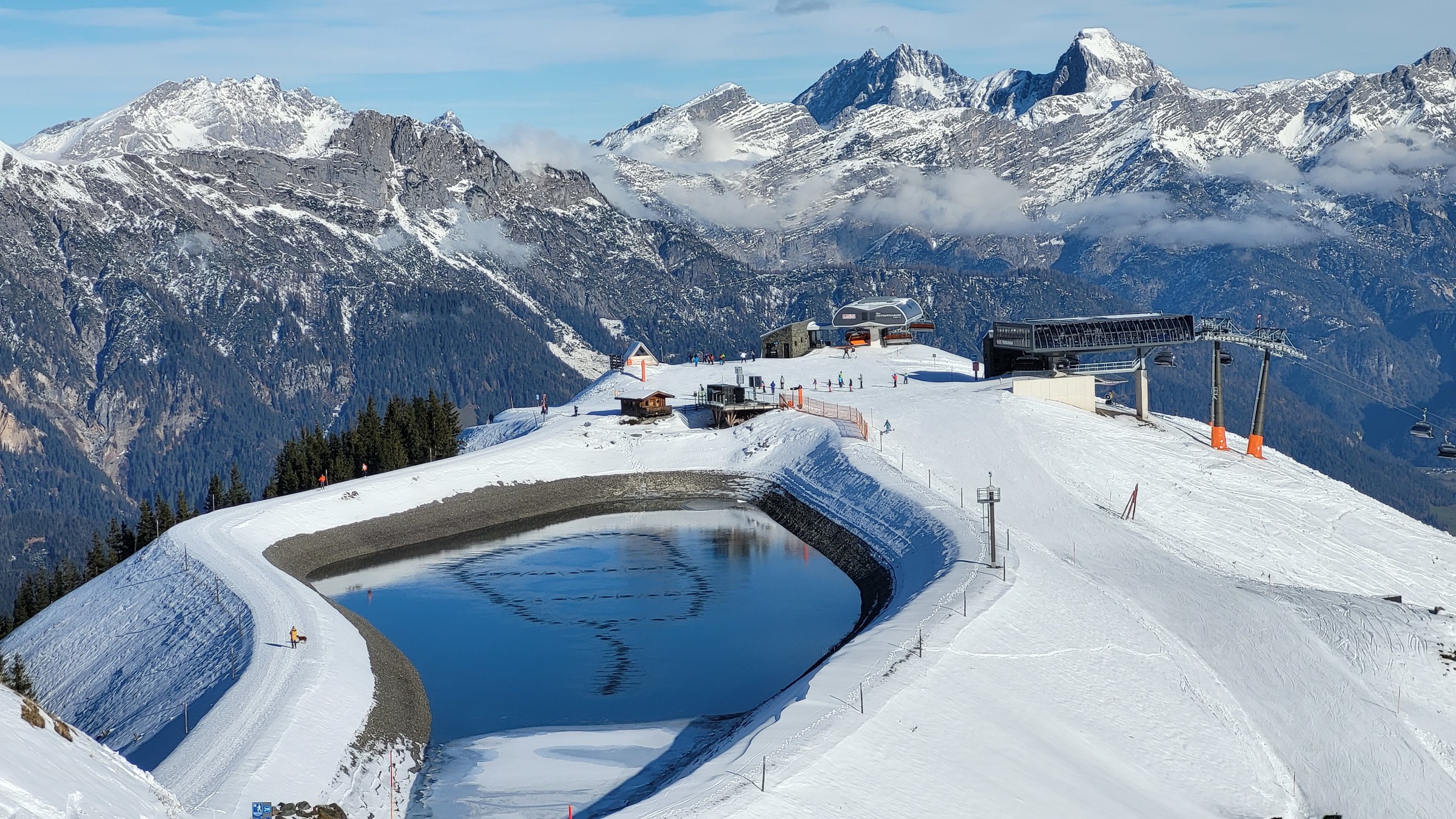Überraschend dass da so wenig beschneit wird derzeit in Leogang. Sieht nach relativ wenig Aktivität aus oder täuscht das? Und dafür ist der Speicherteich oben nicht so recht gefüllt?