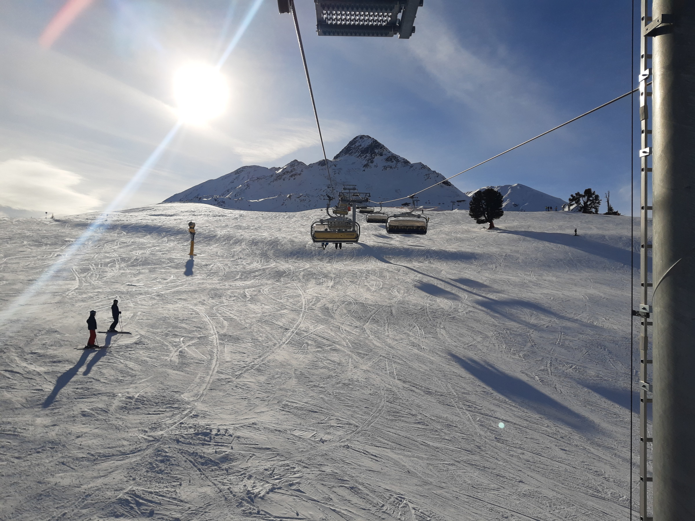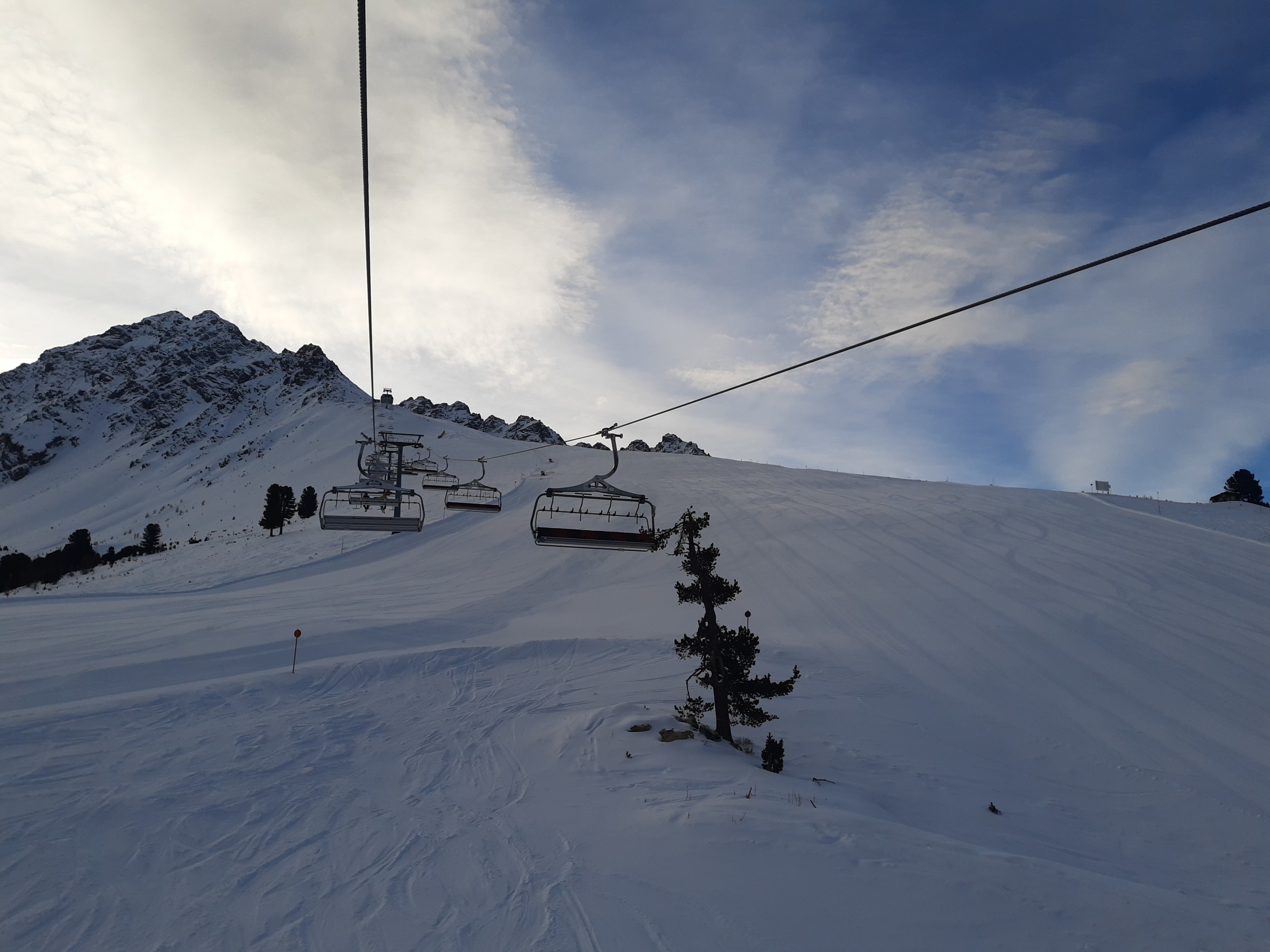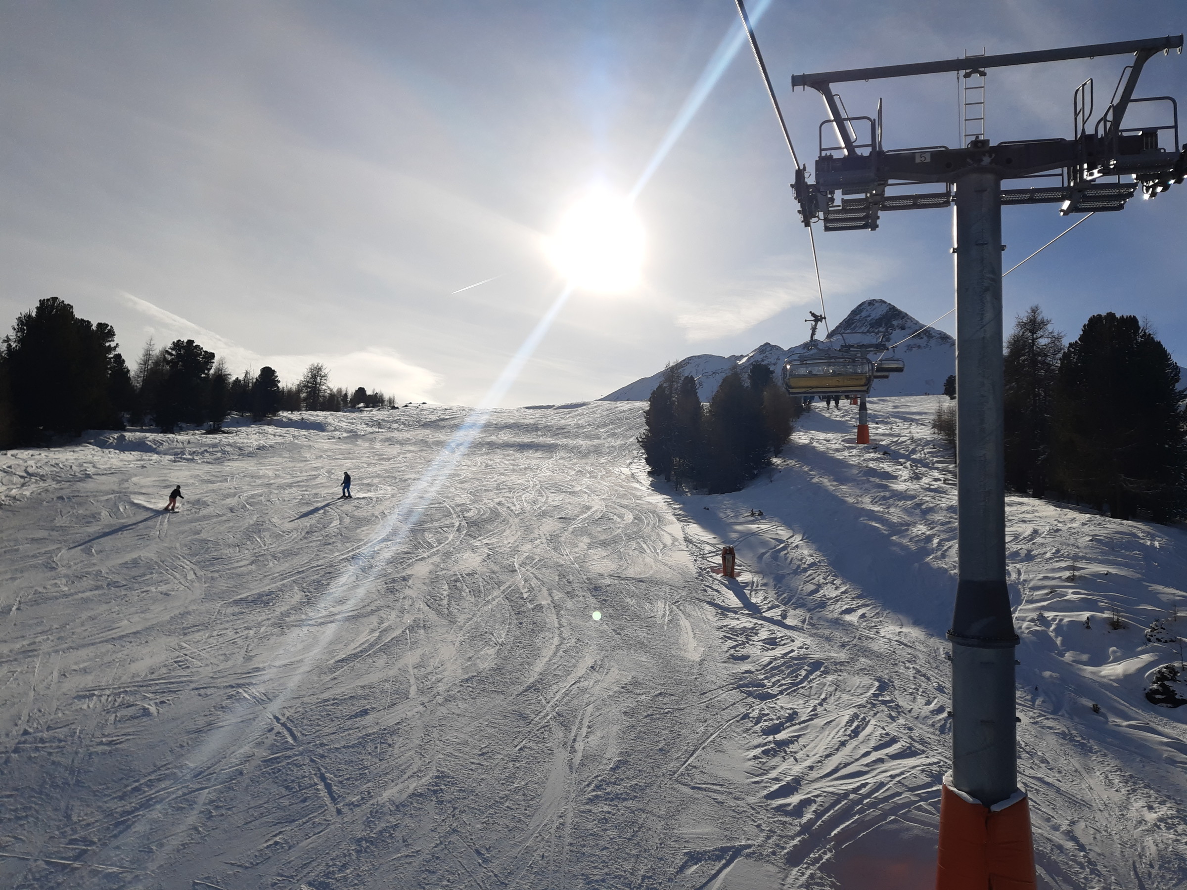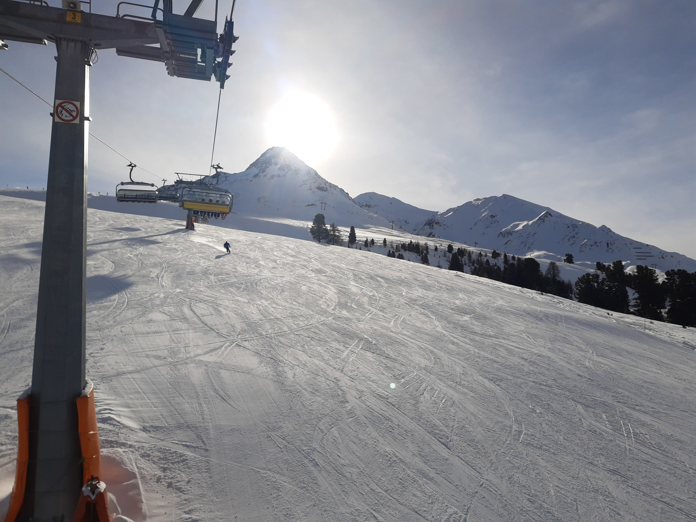 Ich war dann doch recht schnell an der Bergkastellbahn. Es war auch sehr wenig Andrang. Schnell war klar dass der Pistenplan täuscht. Die Bahnen sind lang, die Pisten breit, die Höhenunterschiede gross... ...und die Landschaften schön. Die Sonne kam raus und es war etwas schöner als erwartet. An der Tscheyeckbahn schien am meisten Sonne und die Piste war der Hammer. Lang, breit und pulvrig. Da gab es ein paar Wiederhohlungen.