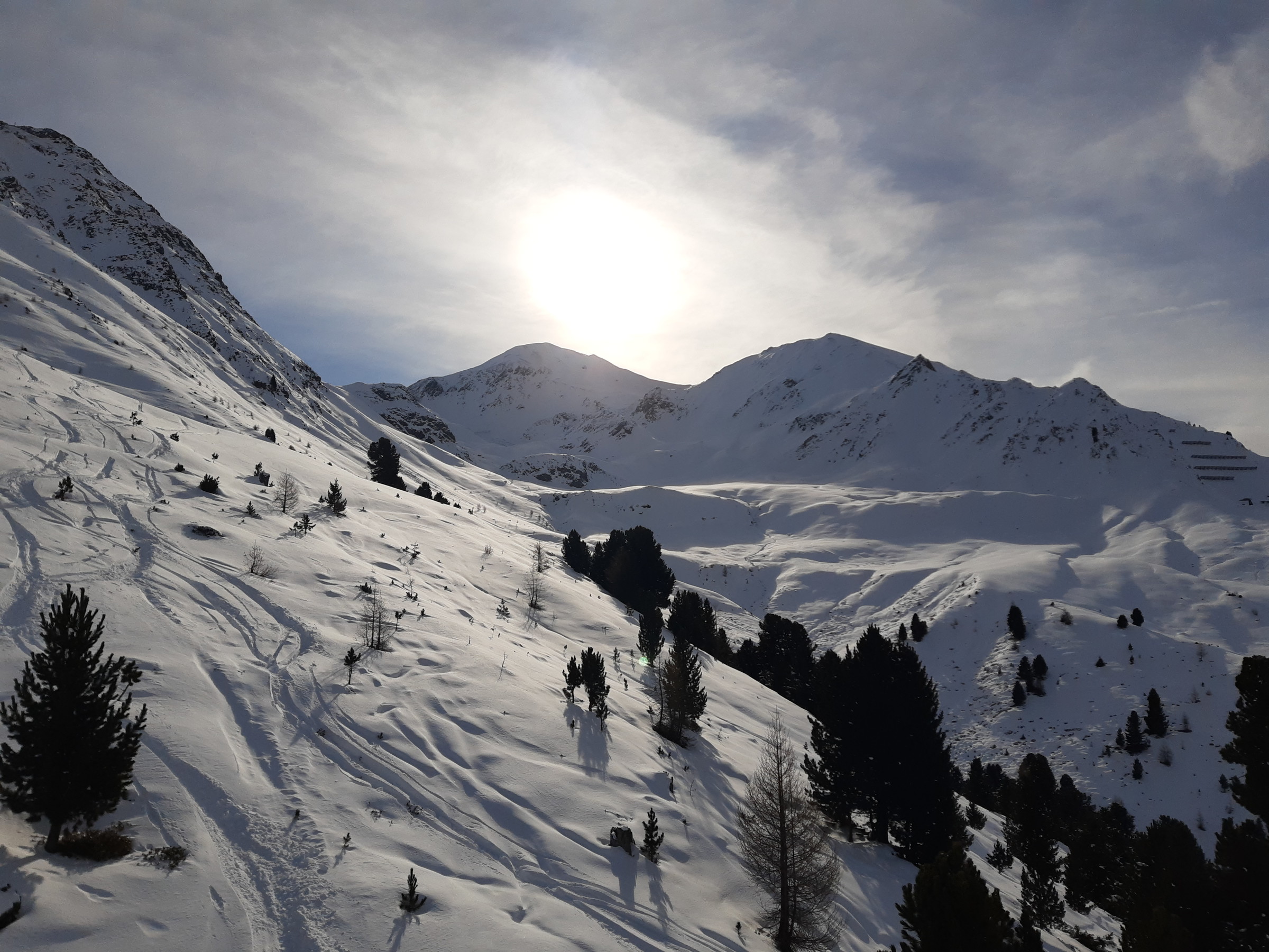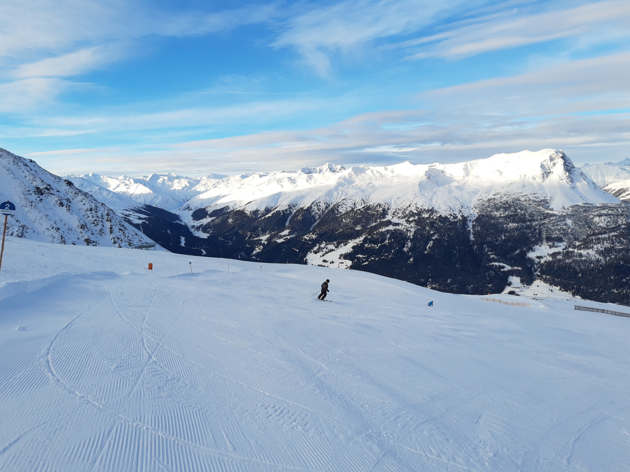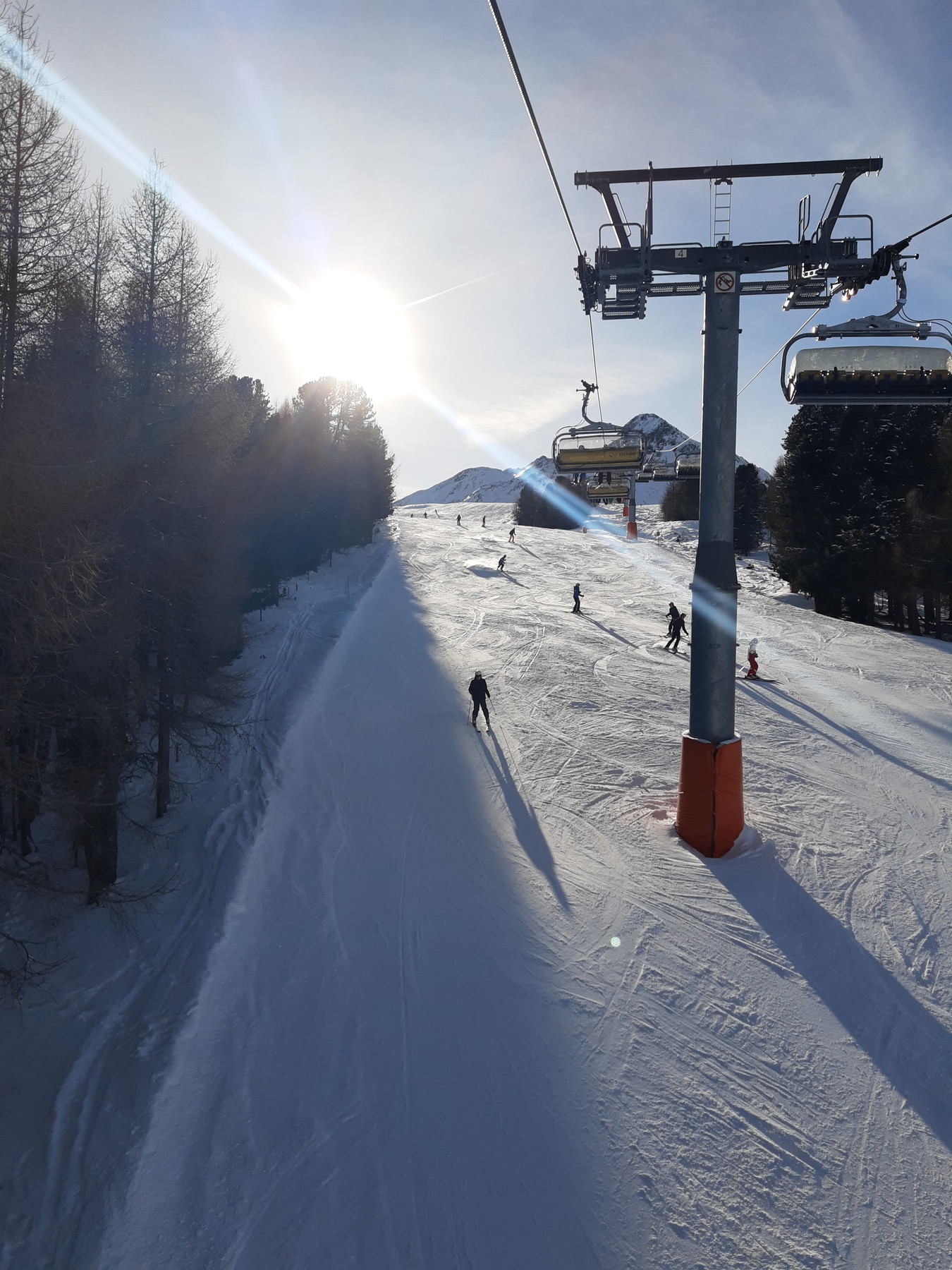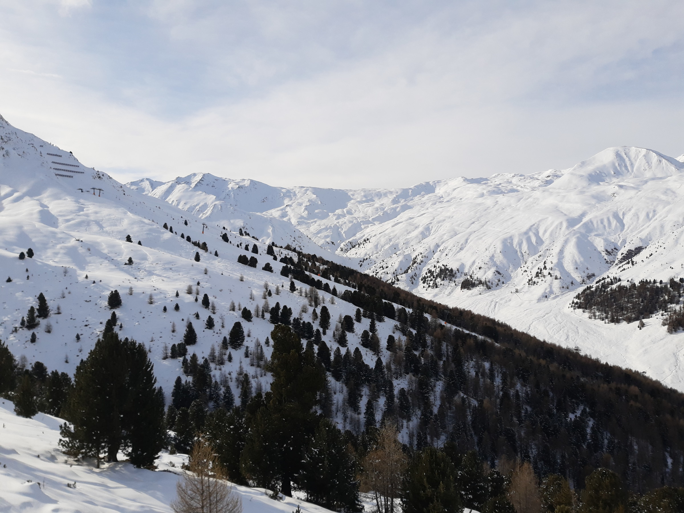 Ich war dann doch recht schnell an der Bergkastellbahn. Es war auch sehr wenig Andrang. Schnell war klar dass der Pistenplan täuscht. Die Bahnen sind lang, die Pisten breit, die Höhenunterschiede gross... ...und die Landschaften schön. Die Sonne kam raus und es war etwas schöner als erwartet. An der Tscheyeckbahn schien am meisten Sonne und die Piste war der Hammer. Lang, breit und pulvrig. Da gab es ein paar Wiederhohlungen.