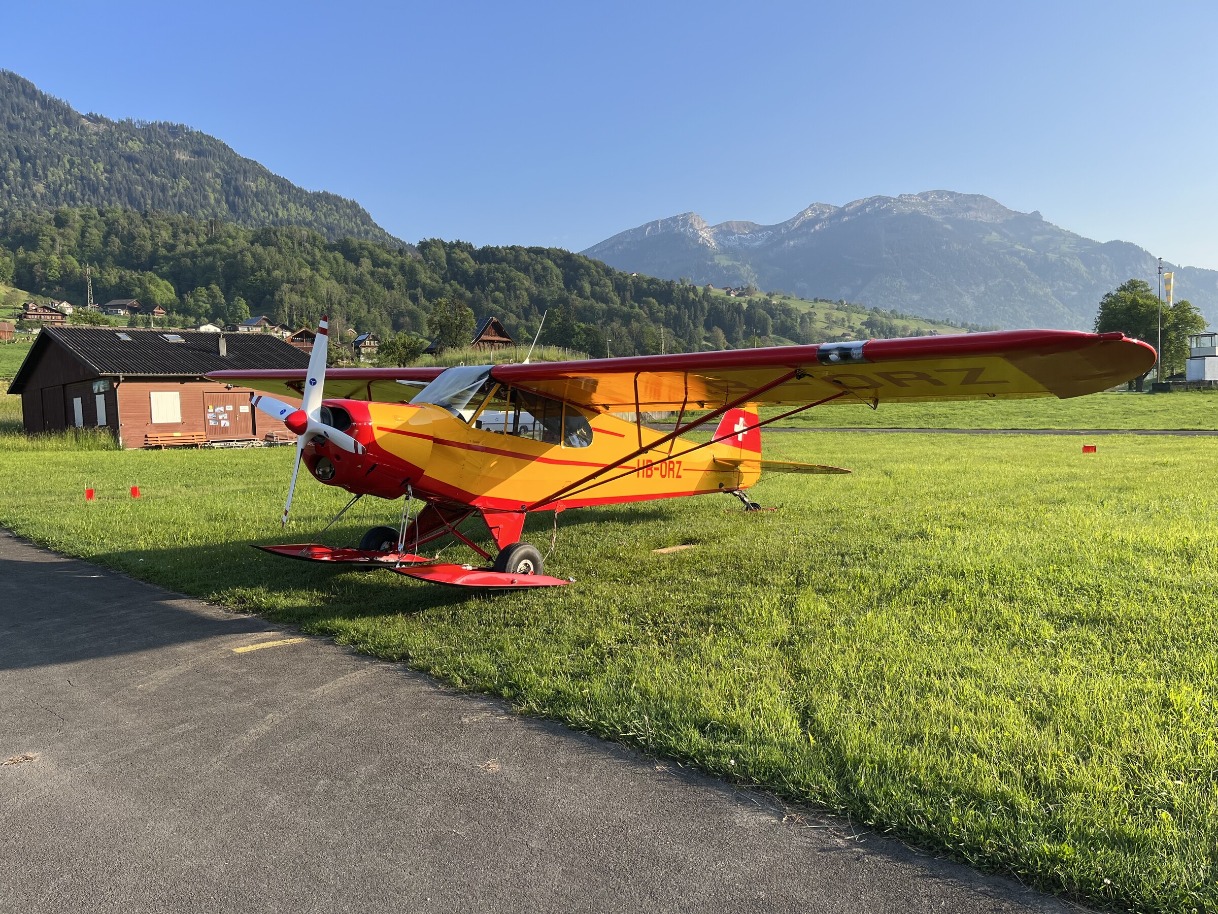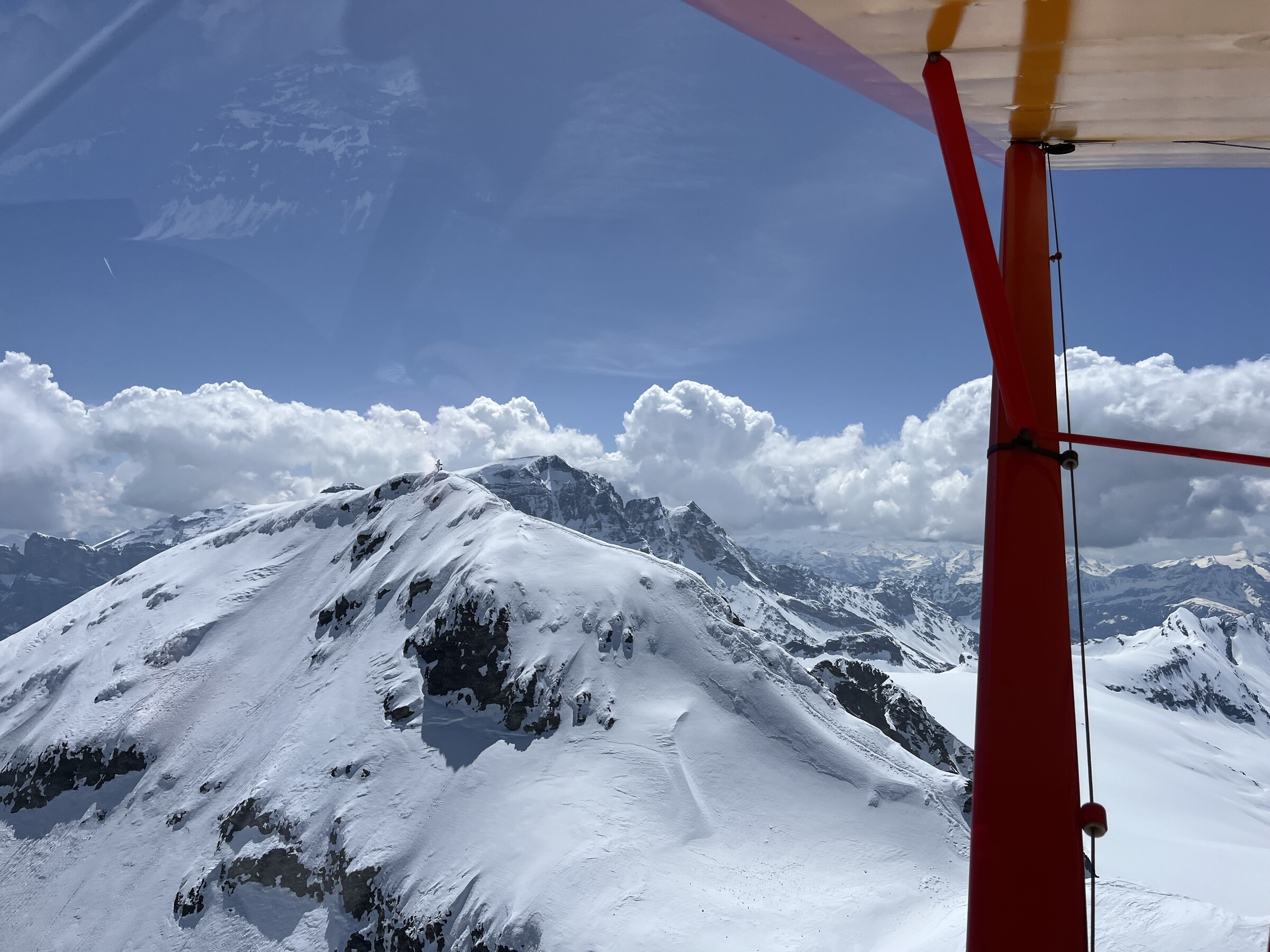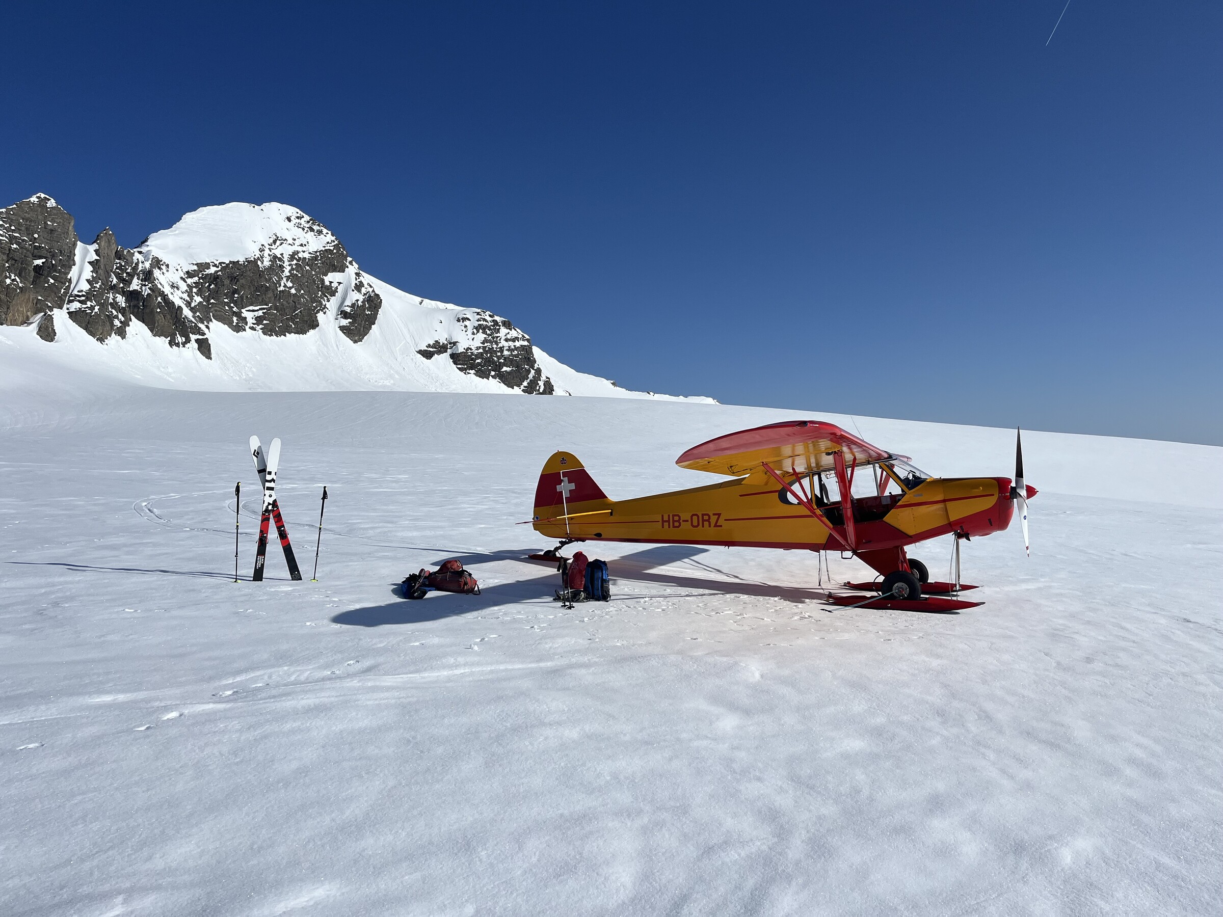 Da hatte für den heutigen sonnigen Gletscherflug-Tag tatsächlich keinen Passagier gefunden und mich schon damit abgefunden, alleine fliegen zu gehen, als ich gestern Abend erfuhr, dass mein Kollege der HB-ORZ ab Kägiswil dasselbe Problem hat. Spontan kamen wir auf die Idee, uns „zusammenzulegen“ und einen Flug mit integrierter Skitour zu machen. Dies ist ein Glücksfall für mich, bin ich doch ein ziemlich unerfahrener Tourengänger und würde mich solche Hochtouren alleine nicht getrauen, er aber ist toperfahren.