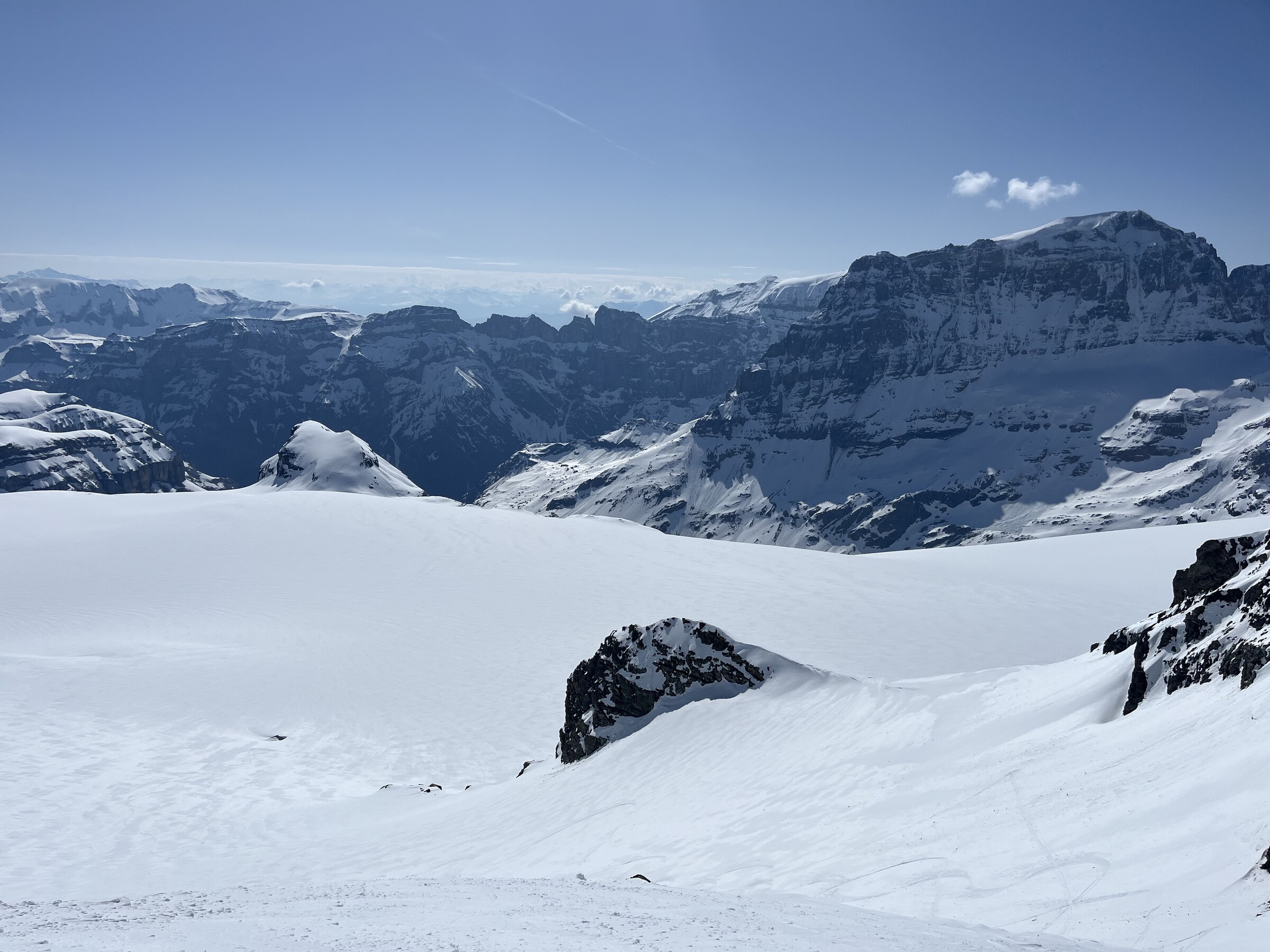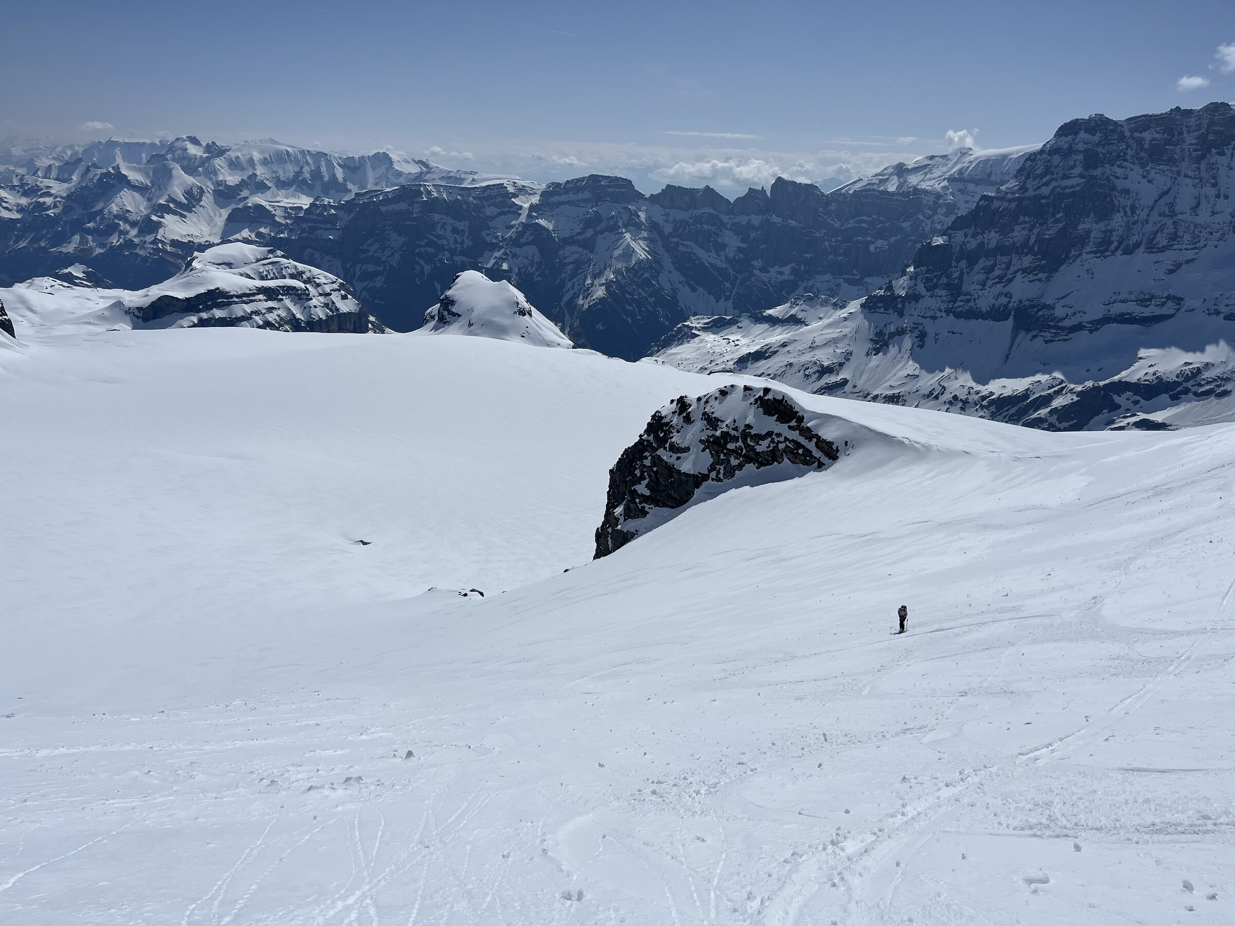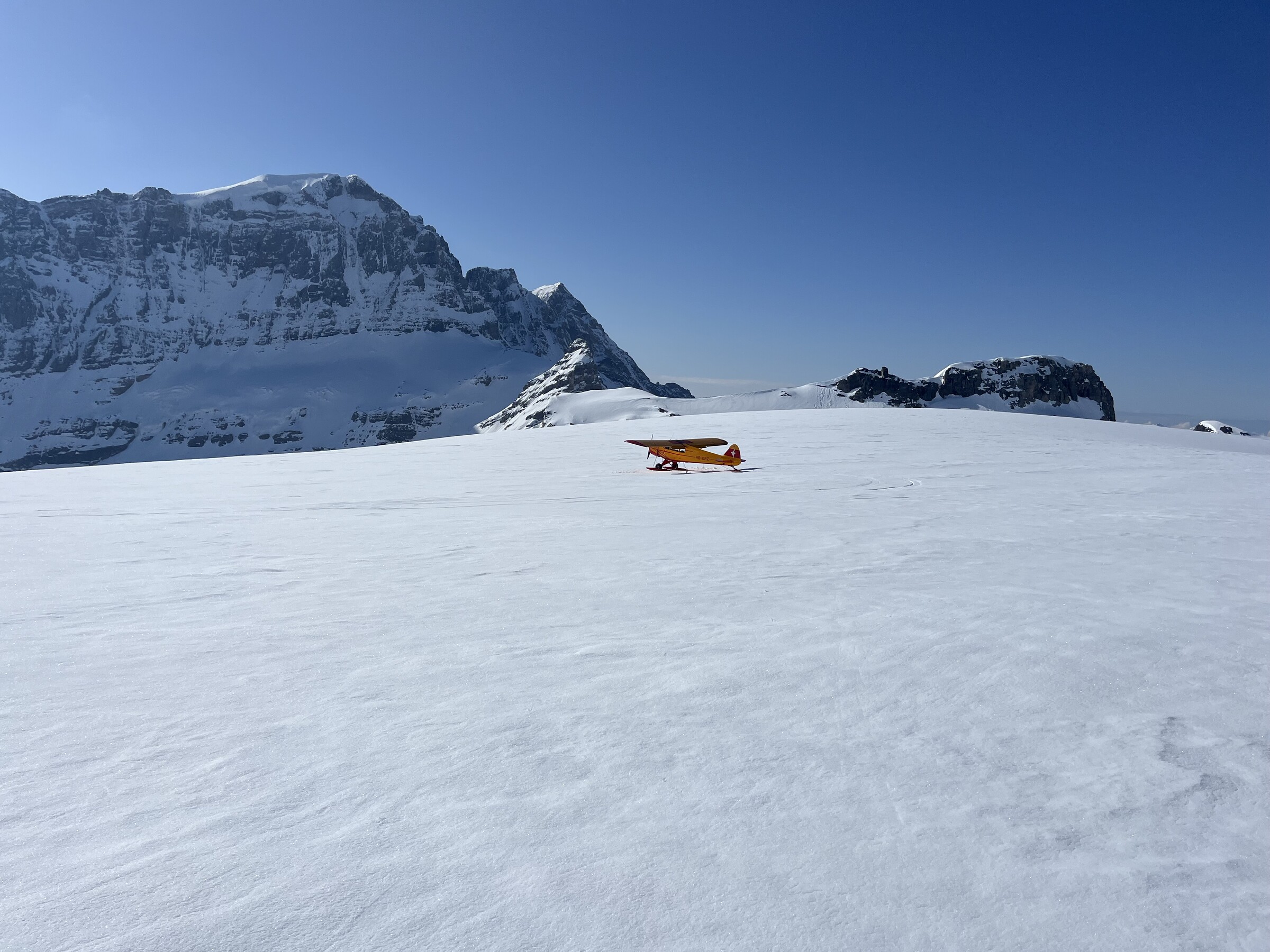 So trafen wir uns um 7 Uhr in Kägiswil, verstauten das viele Material und ich durfte ungewöhnlich hinten als Passagier Platz nehmen, bevor mein Kollege das zweite Paar Ski neben mir aufhängte. Nach rund 20 Minuten Flug waren wir froh, eine landbare Stelle auf dem Hüfifirn gefunden zu haben, die uns den geplanten Aufstieg zum Clariden (3267m) ermöglichte. Eigentlich wollten wir noch etwas näher landen, aber da war die Oberfläche zu rauh und mit zu vielen Wasserrillen durchsetzt. Der Schnee ist noch sehr hart um diese Tageszeit. Flieger fixieren, alles vorbereiten, und los geht es um 8.30 Uhr: Ein Blick zurück: Die knapp 350 Höhenmeter sind zwar nicht viel, aber doch ziemlich steil: Ich freue mich auf die Abfahrt. Die Oberfläche ist wunderbar leicht angesulzt. Geschafft nach knapp 90min! Irrsinnig diese Aussicht. Man wähnt sich wie auf dem Mount Everest