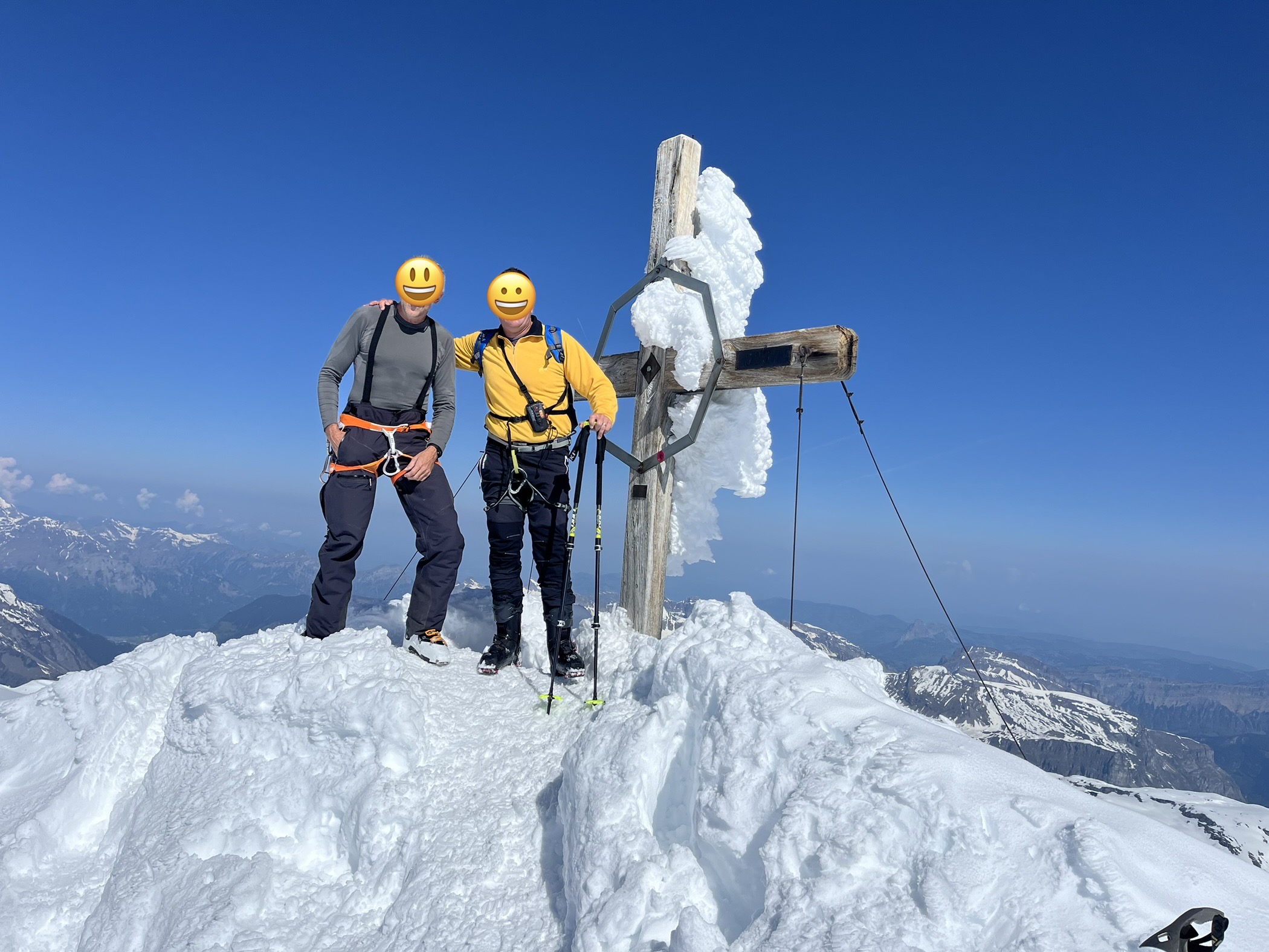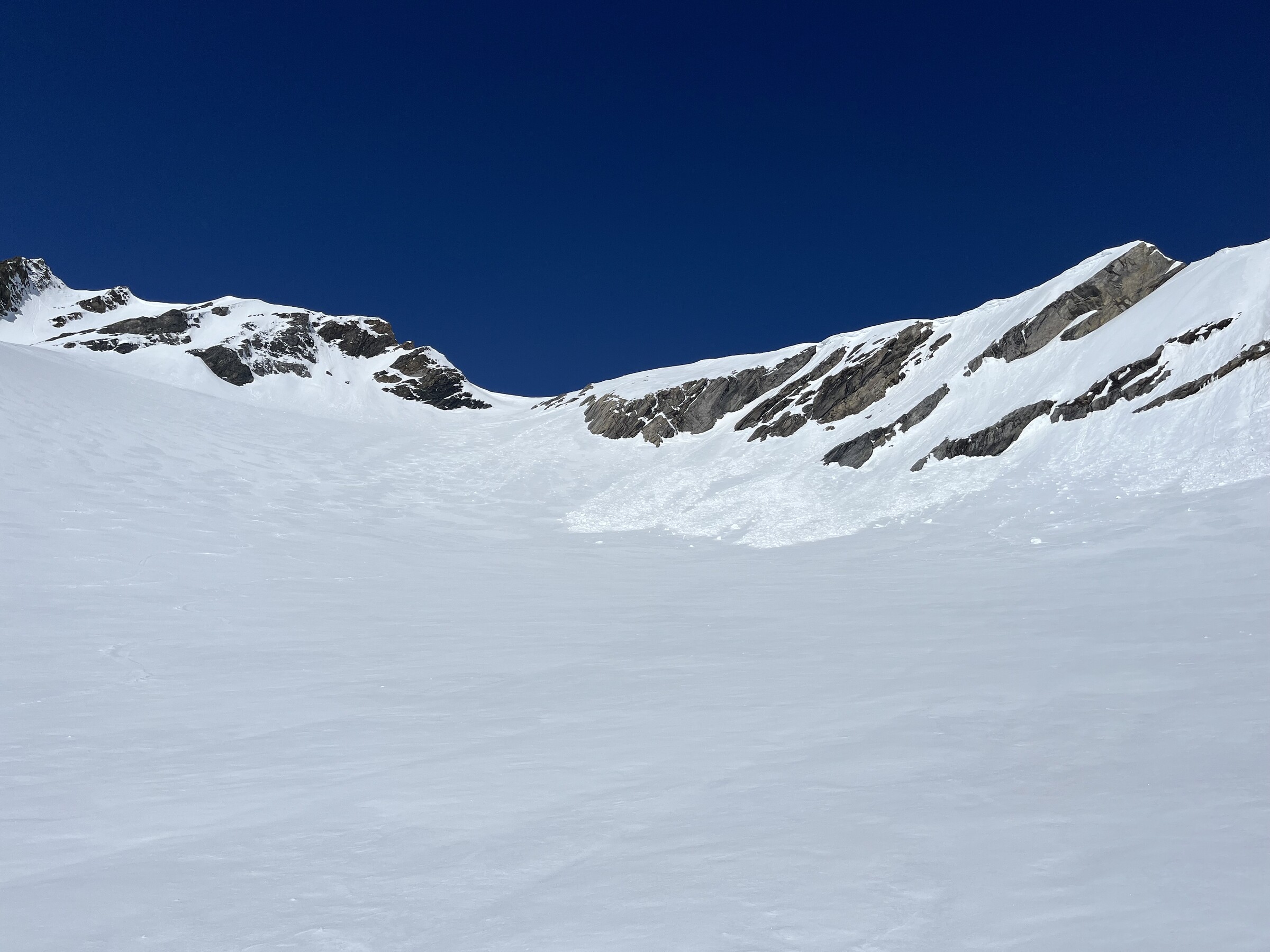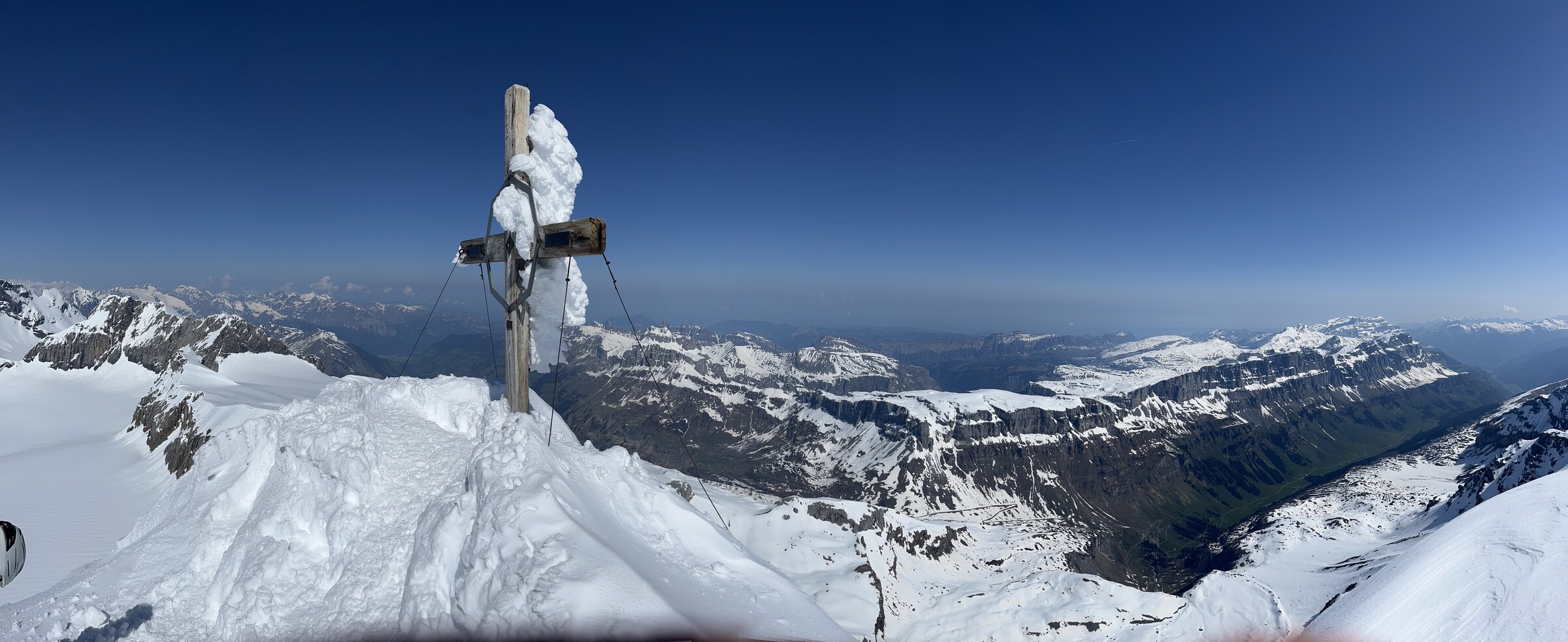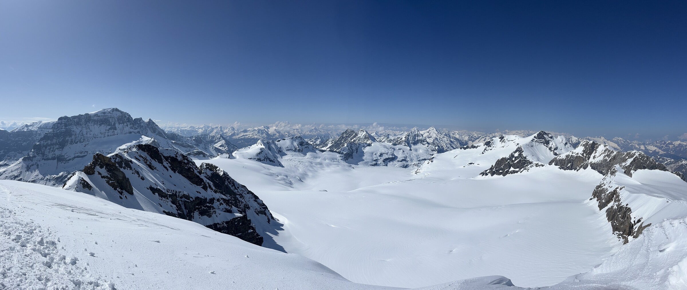 So trafen wir uns um 7 Uhr in Kägiswil, verstauten das viele Material und ich durfte ungewöhnlich hinten als Passagier Platz nehmen, bevor mein Kollege das zweite Paar Ski neben mir aufhängte. Nach rund 20 Minuten Flug waren wir froh, eine landbare Stelle auf dem Hüfifirn gefunden zu haben, die uns den geplanten Aufstieg zum Clariden (3267m) ermöglichte. Eigentlich wollten wir noch etwas näher landen, aber da war die Oberfläche zu rauh und mit zu vielen Wasserrillen durchsetzt. Der Schnee ist noch sehr hart um diese Tageszeit. Flieger fixieren, alles vorbereiten, und los geht es um 8.30 Uhr: Ein Blick zurück: Die knapp 350 Höhenmeter sind zwar nicht viel, aber doch ziemlich steil: Ich freue mich auf die Abfahrt. Die Oberfläche ist wunderbar leicht angesulzt. Geschafft nach knapp 90min! Irrsinnig diese Aussicht. Man wähnt sich wie auf dem Mount Everest