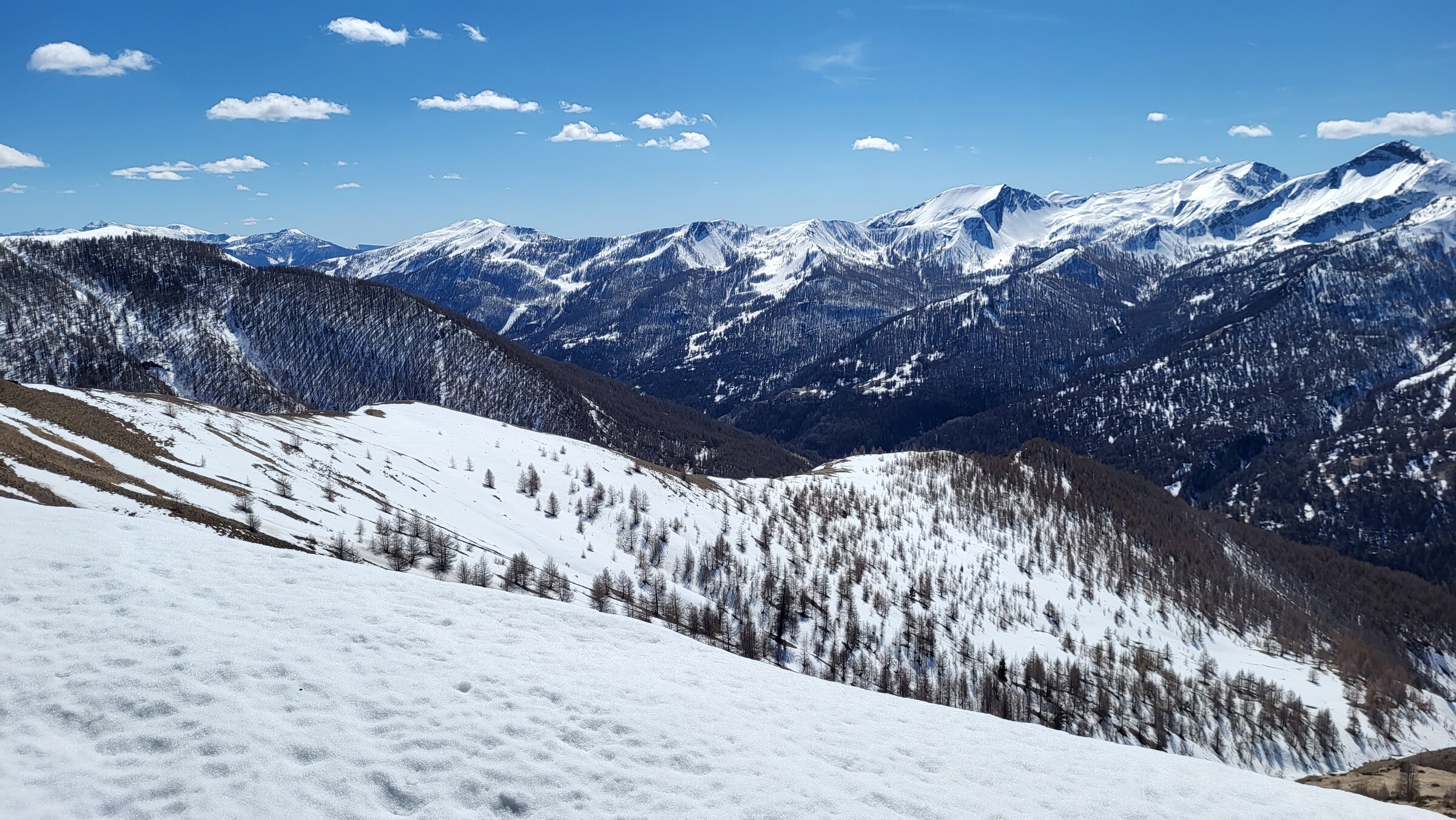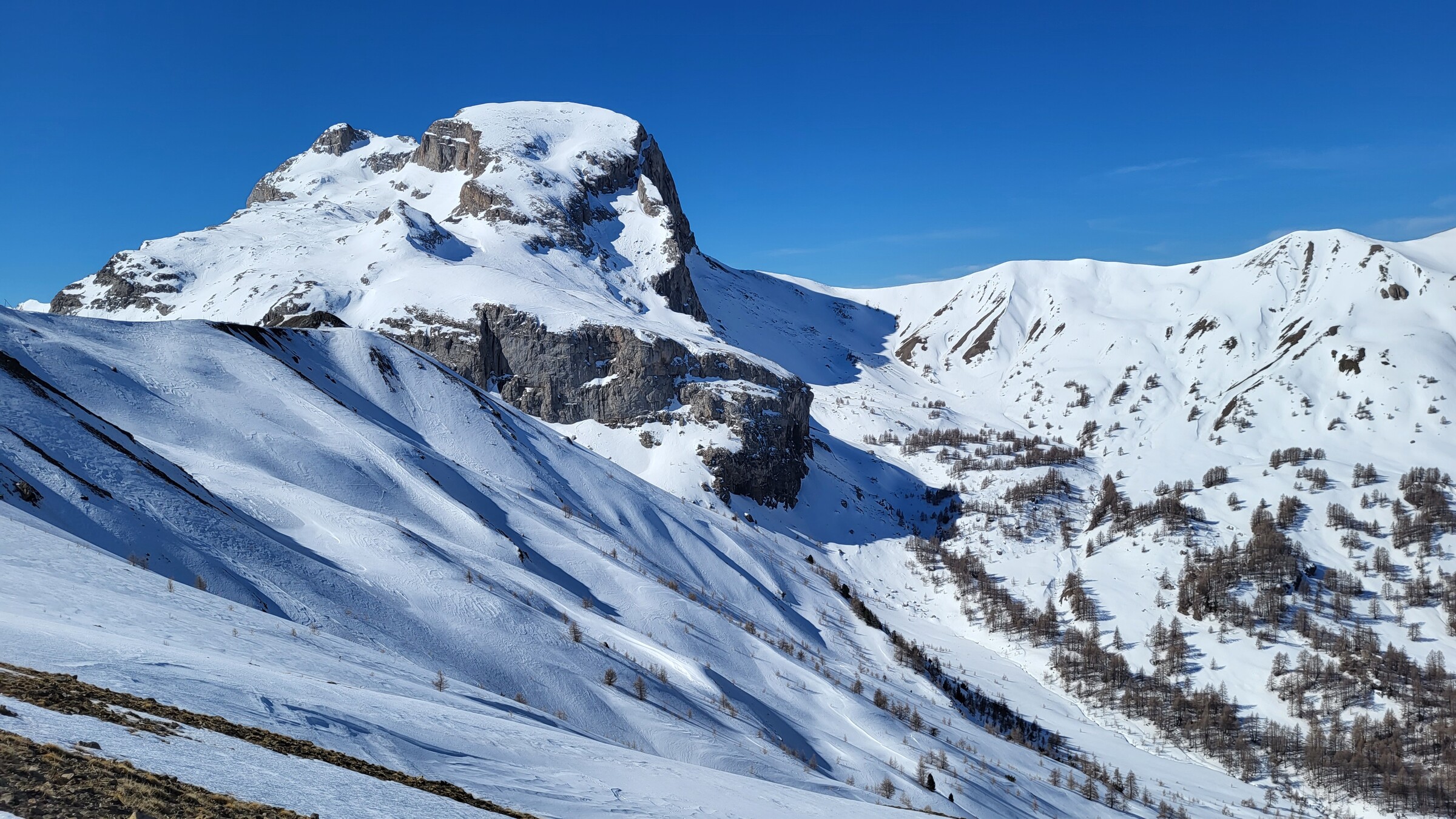 > Hinten links das zweite Skigebiet im Val d’Allos: Le Seignus. In diesem Moment hätte ich es noch nicht für möglich gehalten, dass ich bereits zwei Tage später dort Skifahren würde