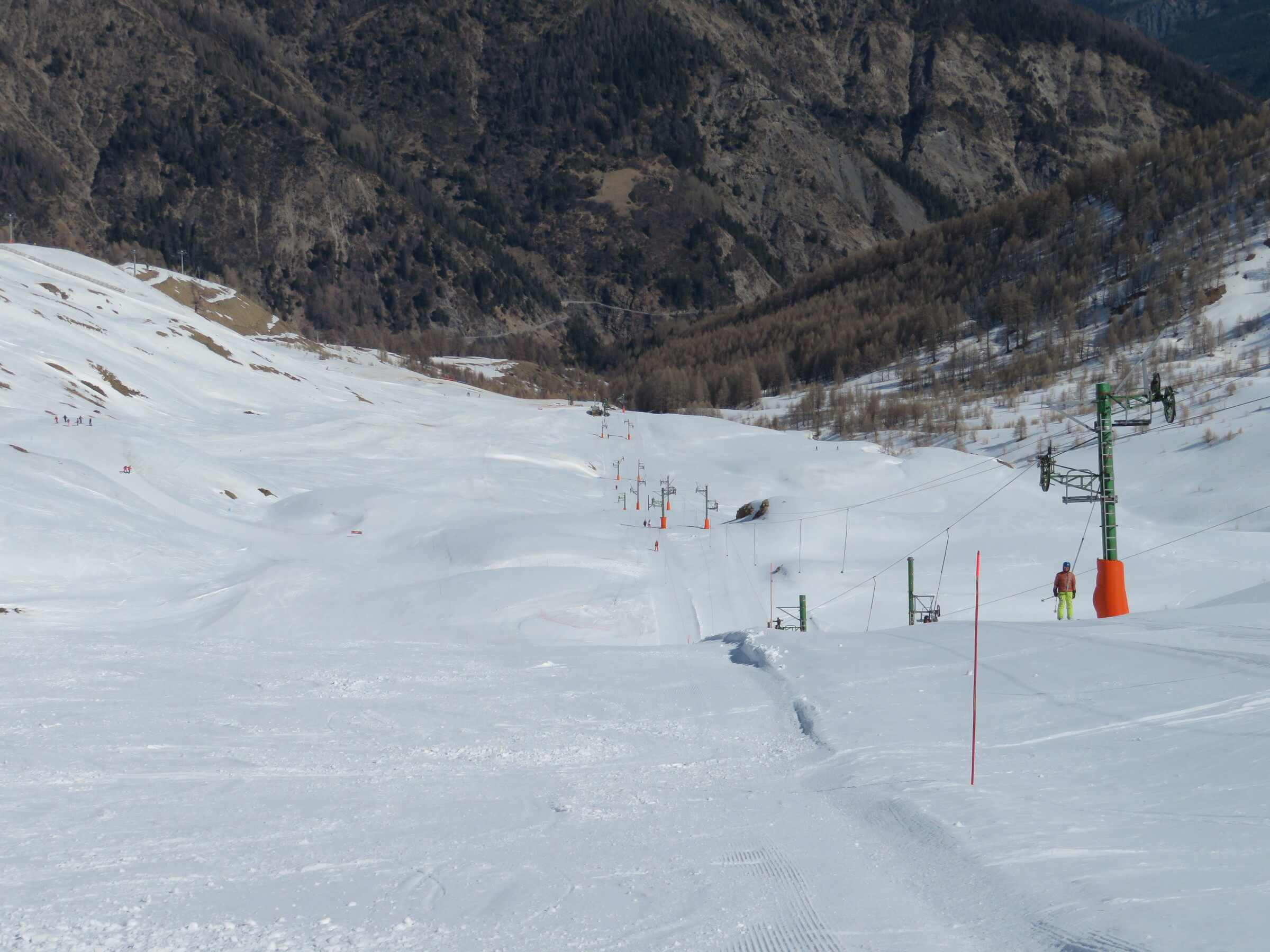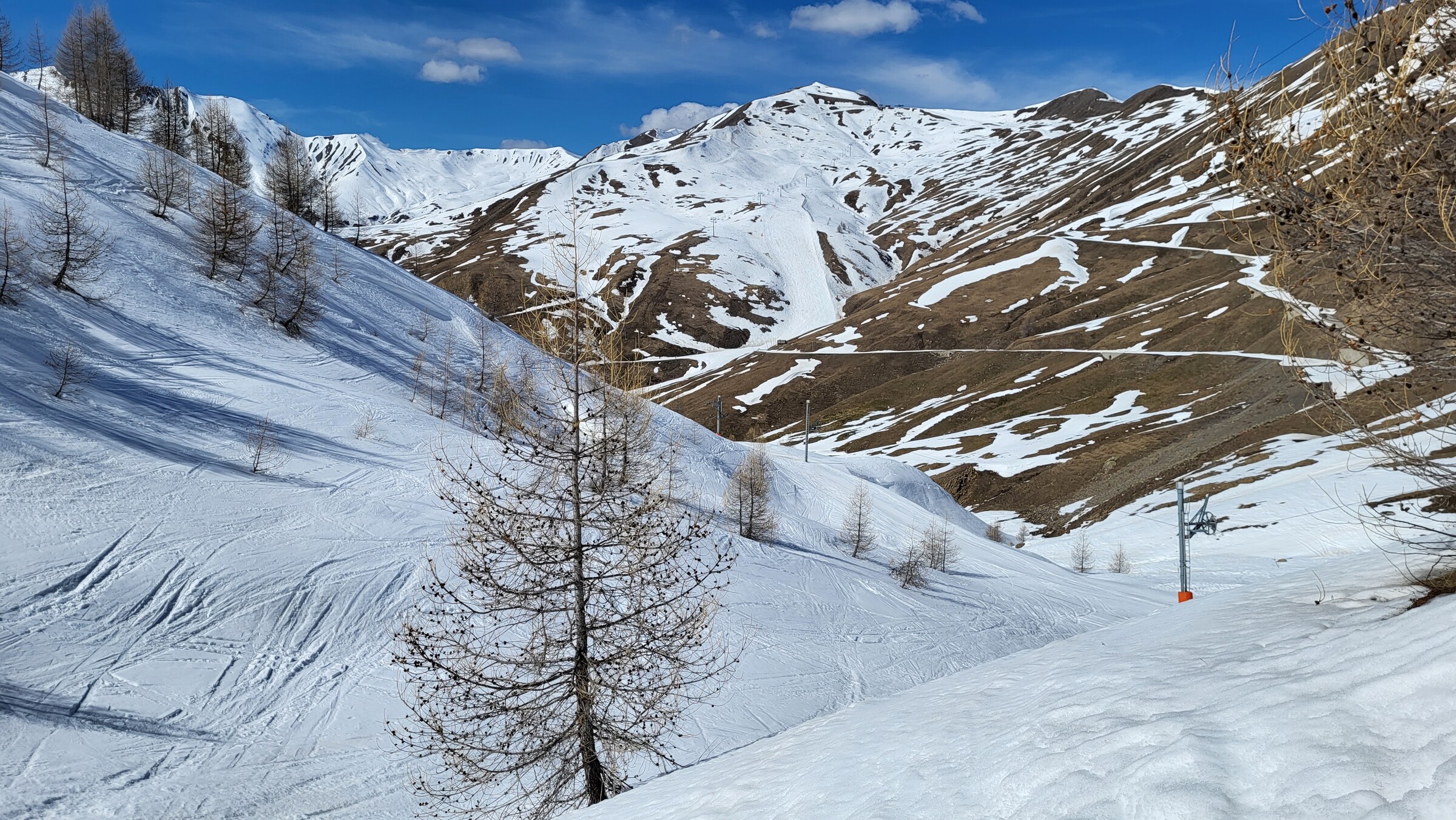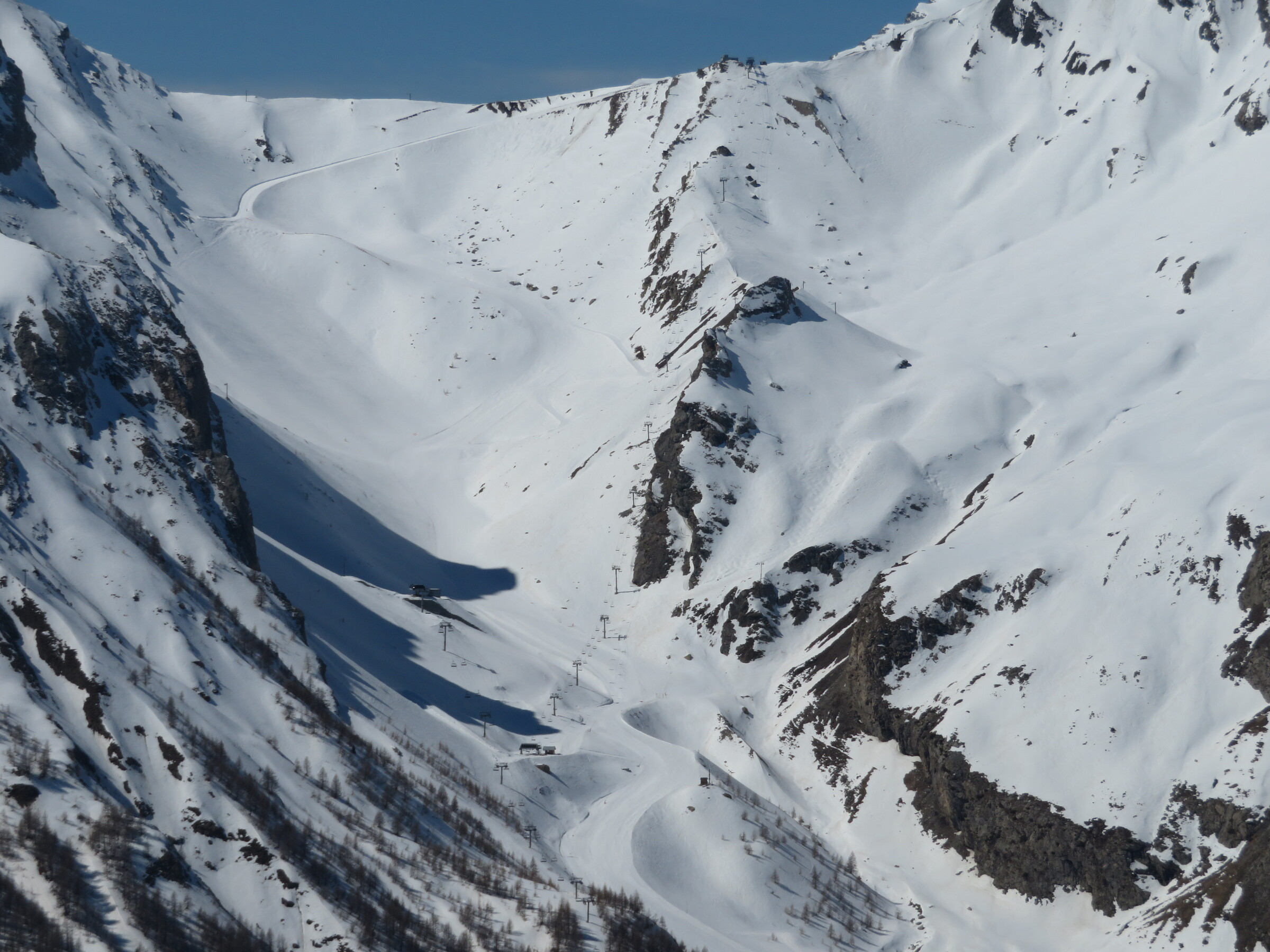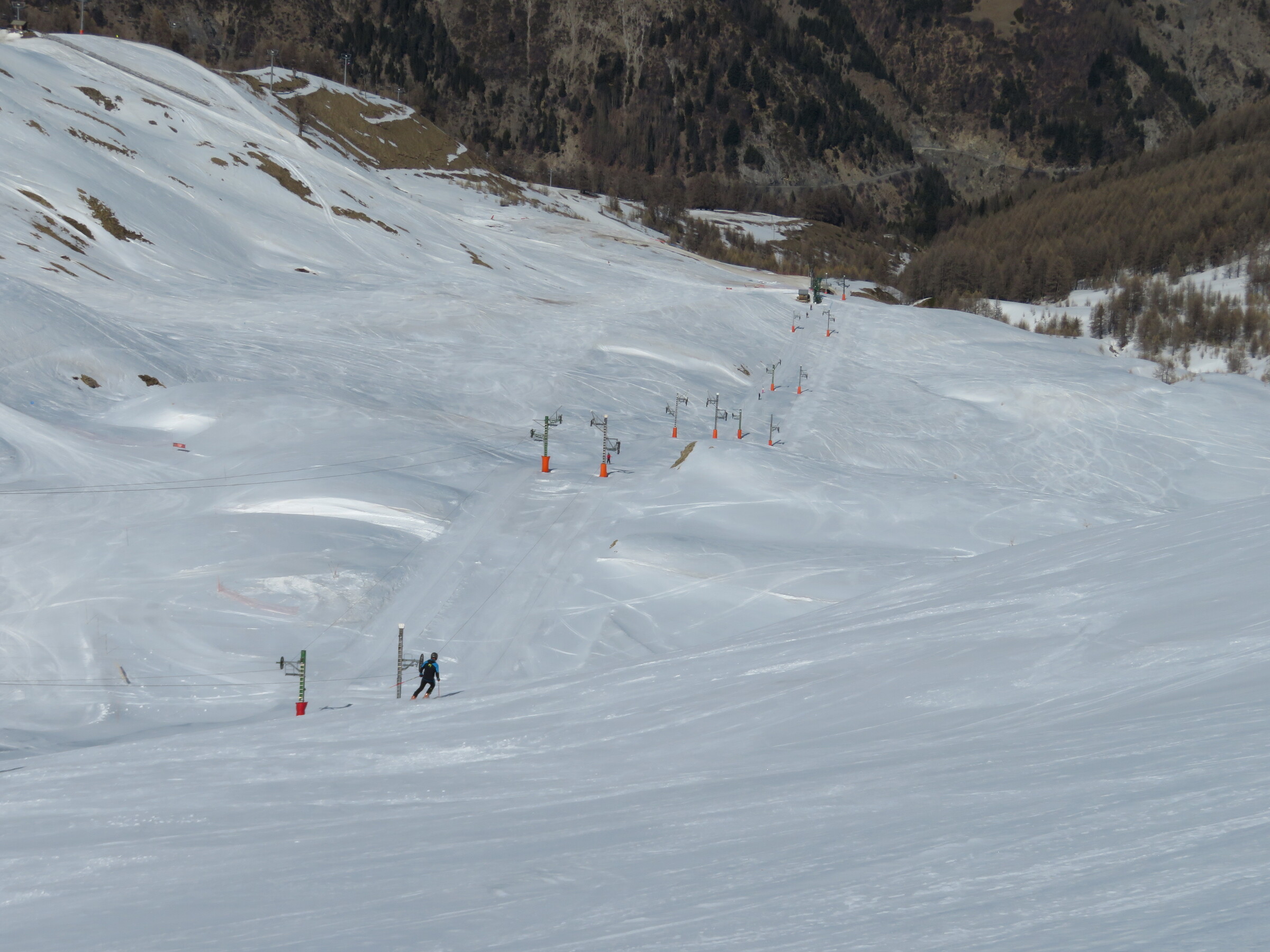 > Heute war dafür der SL Tardée geöffnet (rechts im Bild), auch wenn die beiden direkten Abfahrten bereits nicht mehr ausreichend Schnee hatten
