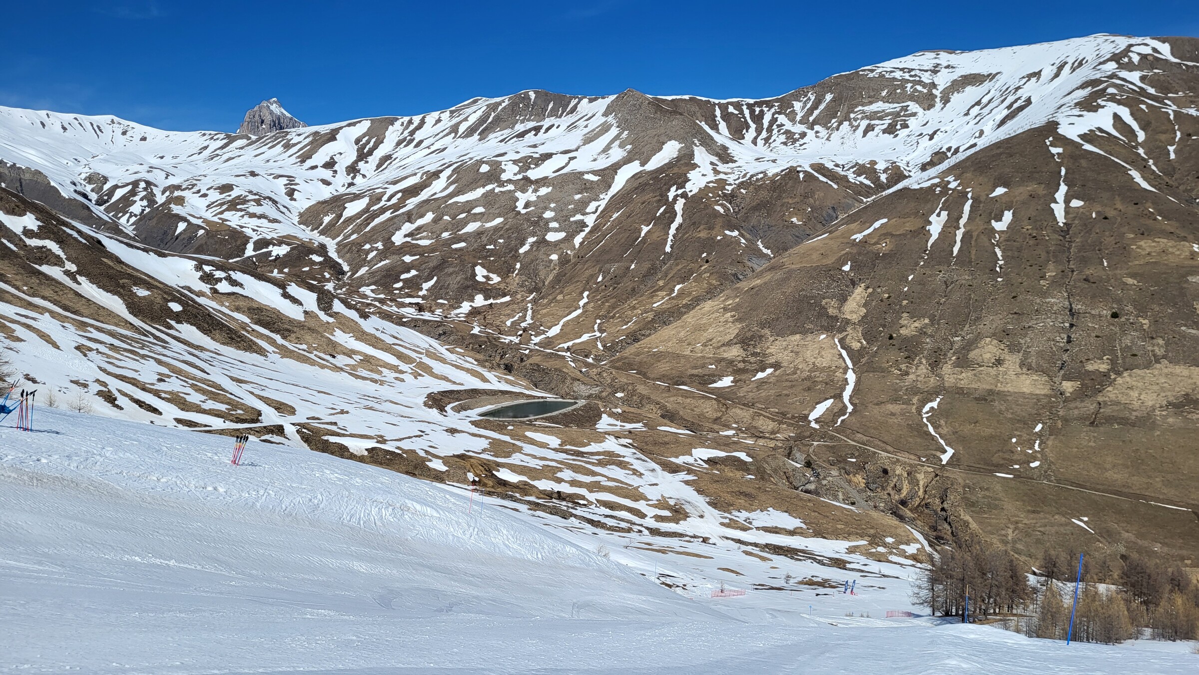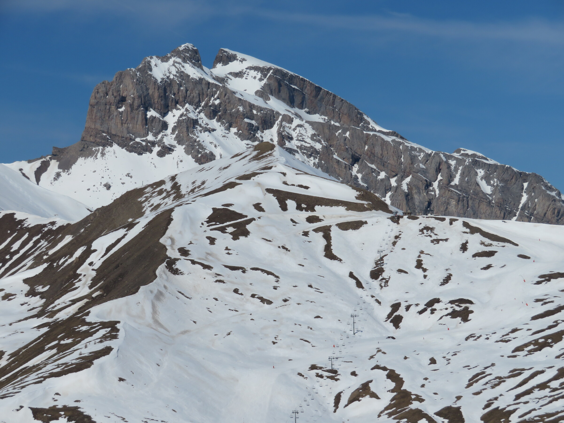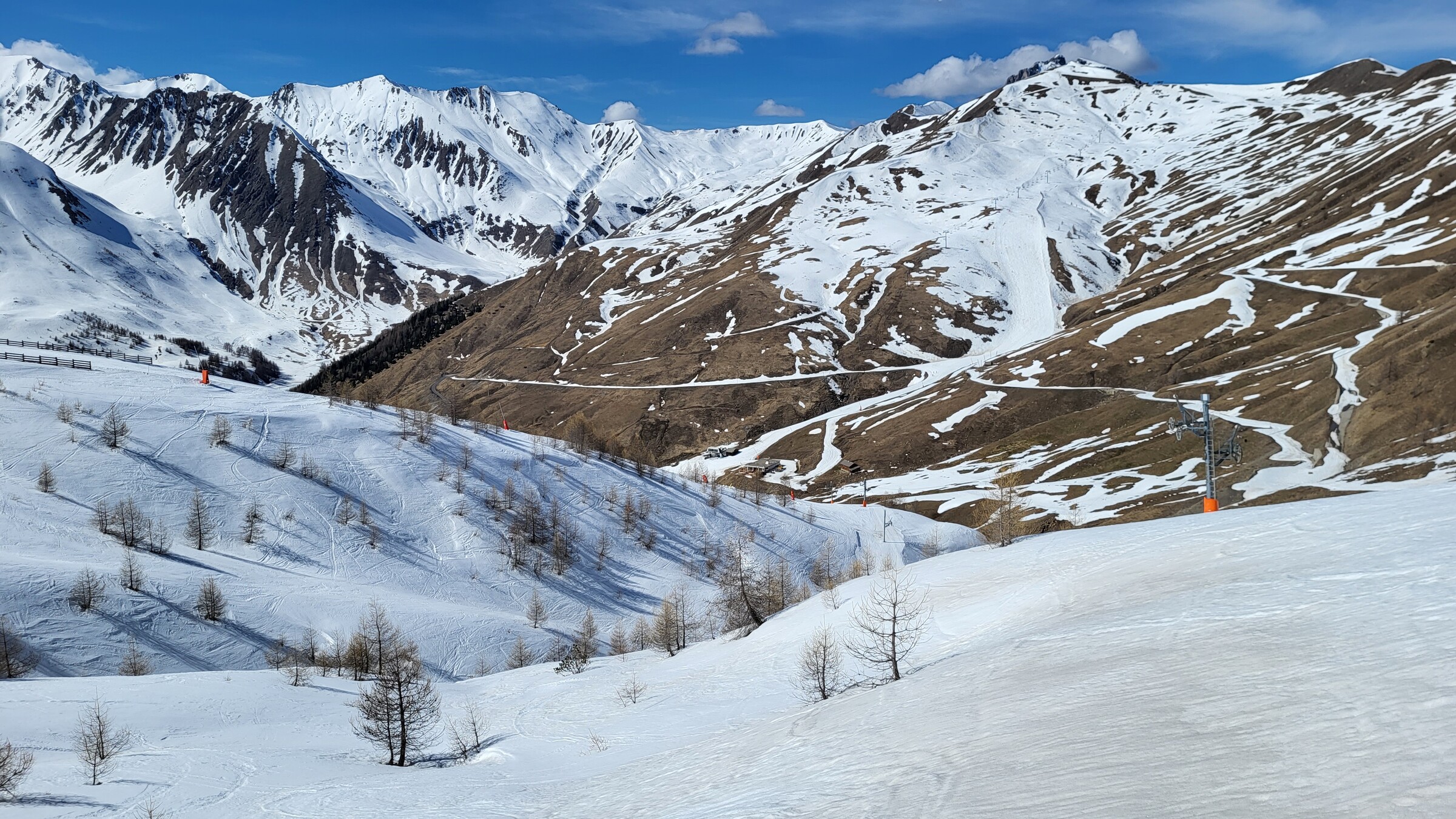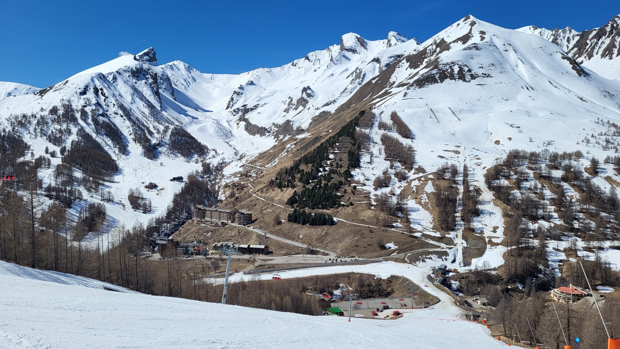 > Heute war dafür der SL Tardée geöffnet (rechts im Bild), auch wenn die beiden direkten Abfahrten bereits nicht mehr ausreichend Schnee hatten